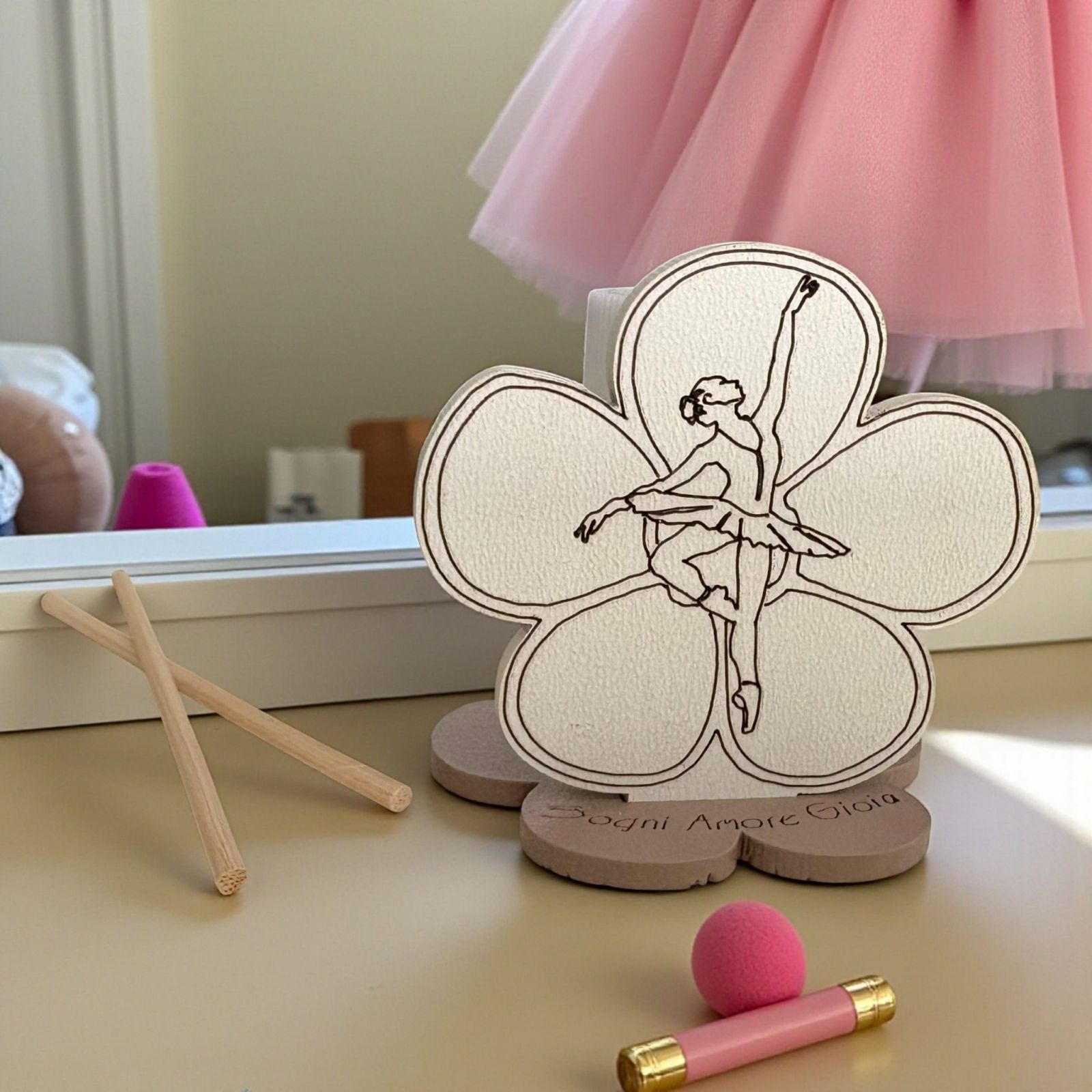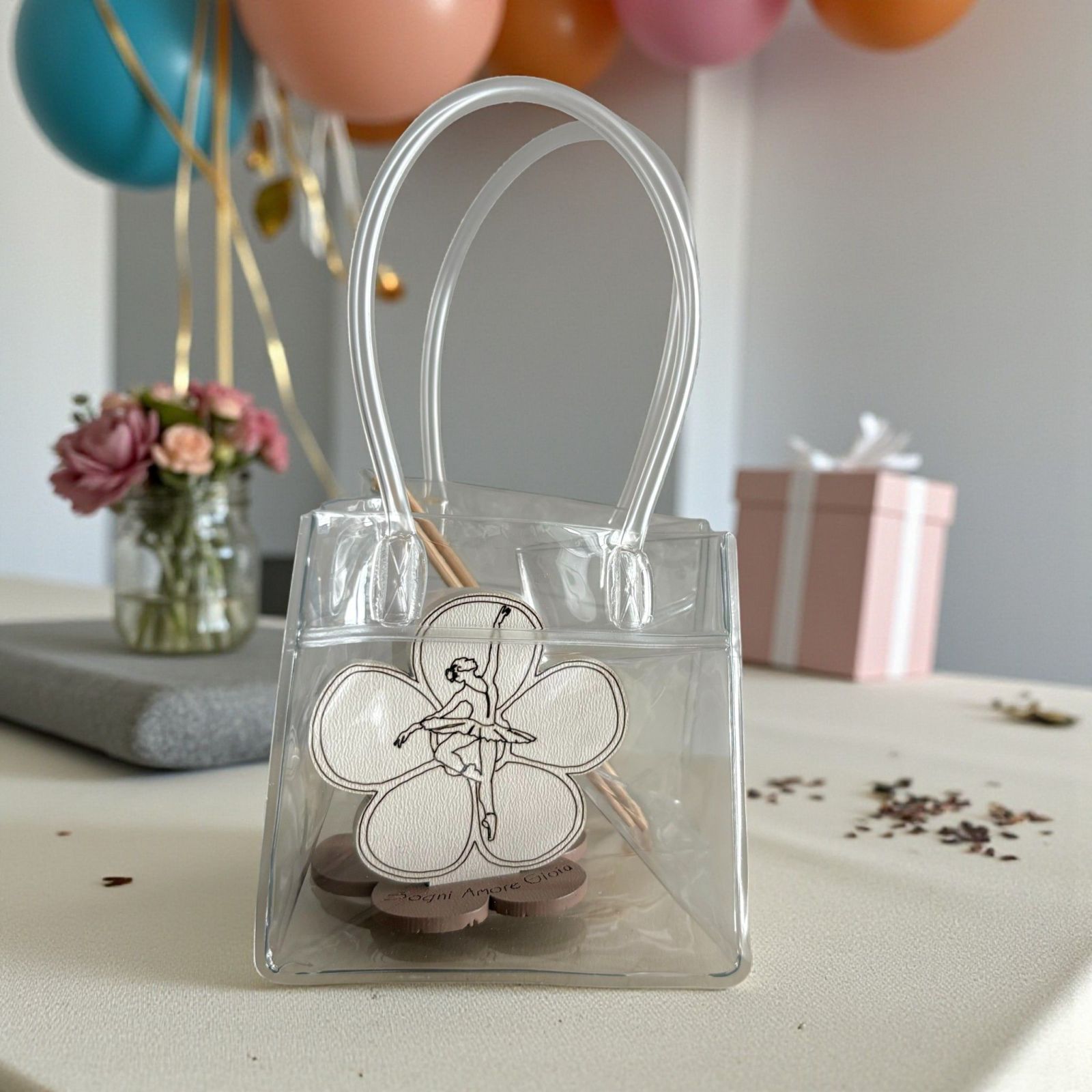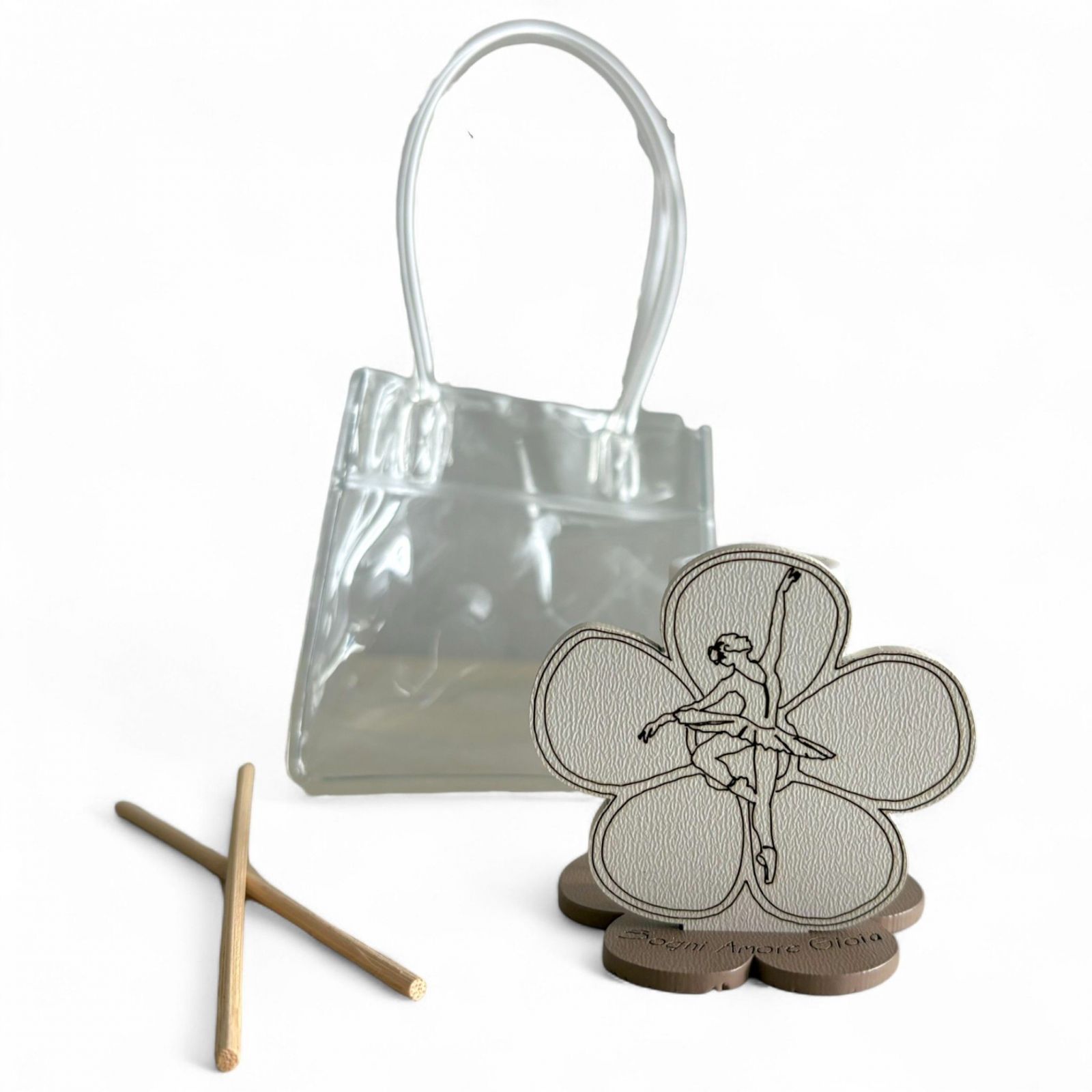 Un tenero mini diffusore essenza con fiore che racchiude un piccolo mondo di magia e movimento. Al centro, una delicata ballerina che danza dona grazia e leggerezza, rendendo questo oggetto perfetto come bomboniere battesimo bimba o bomboniere prima comunione a tema danza. Un piccolo gesto che trasmette dolcezza e allegria agli invitati.