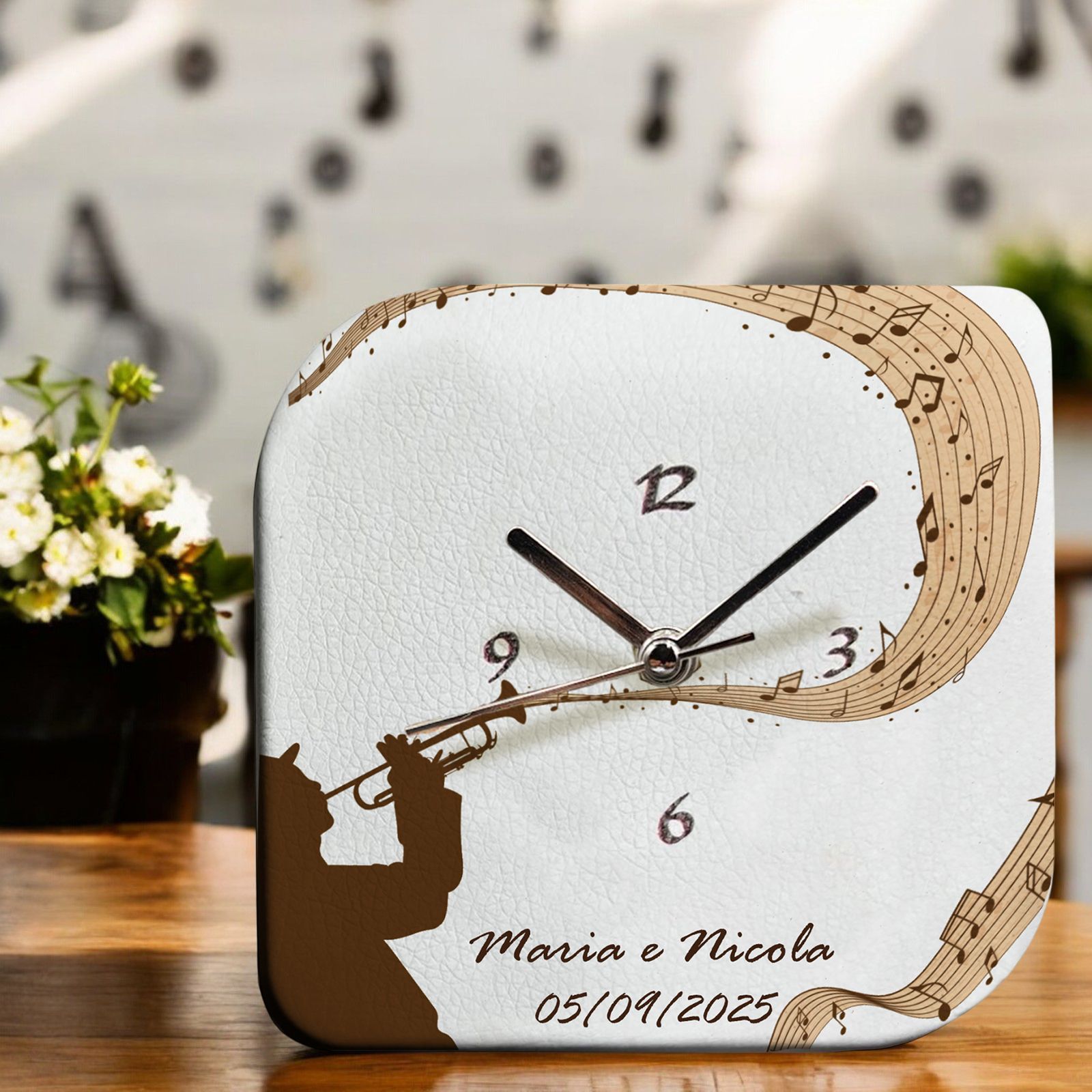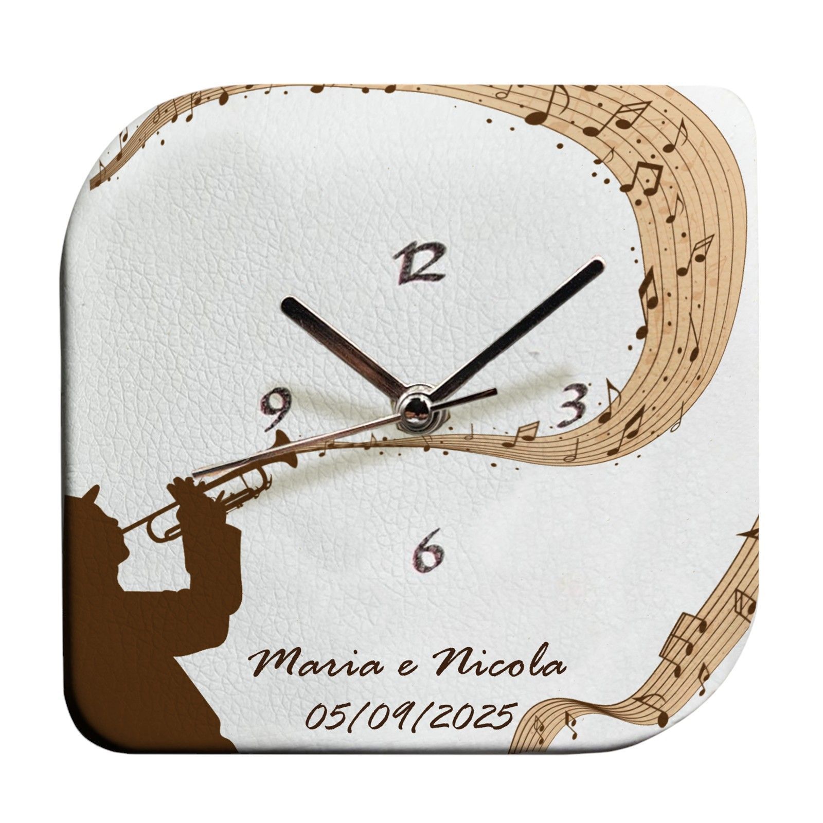 L'orologio in ecopelle con musicista che suona una dolce melodia e lascia una scia di note musicali è perfetto per chi cerca bomboniere particolari e alla ricerca di novità. La sua grafica esclusiva e la sua realizzazione artigianale Made in Italy lo rendono un oggetto davvero unico.