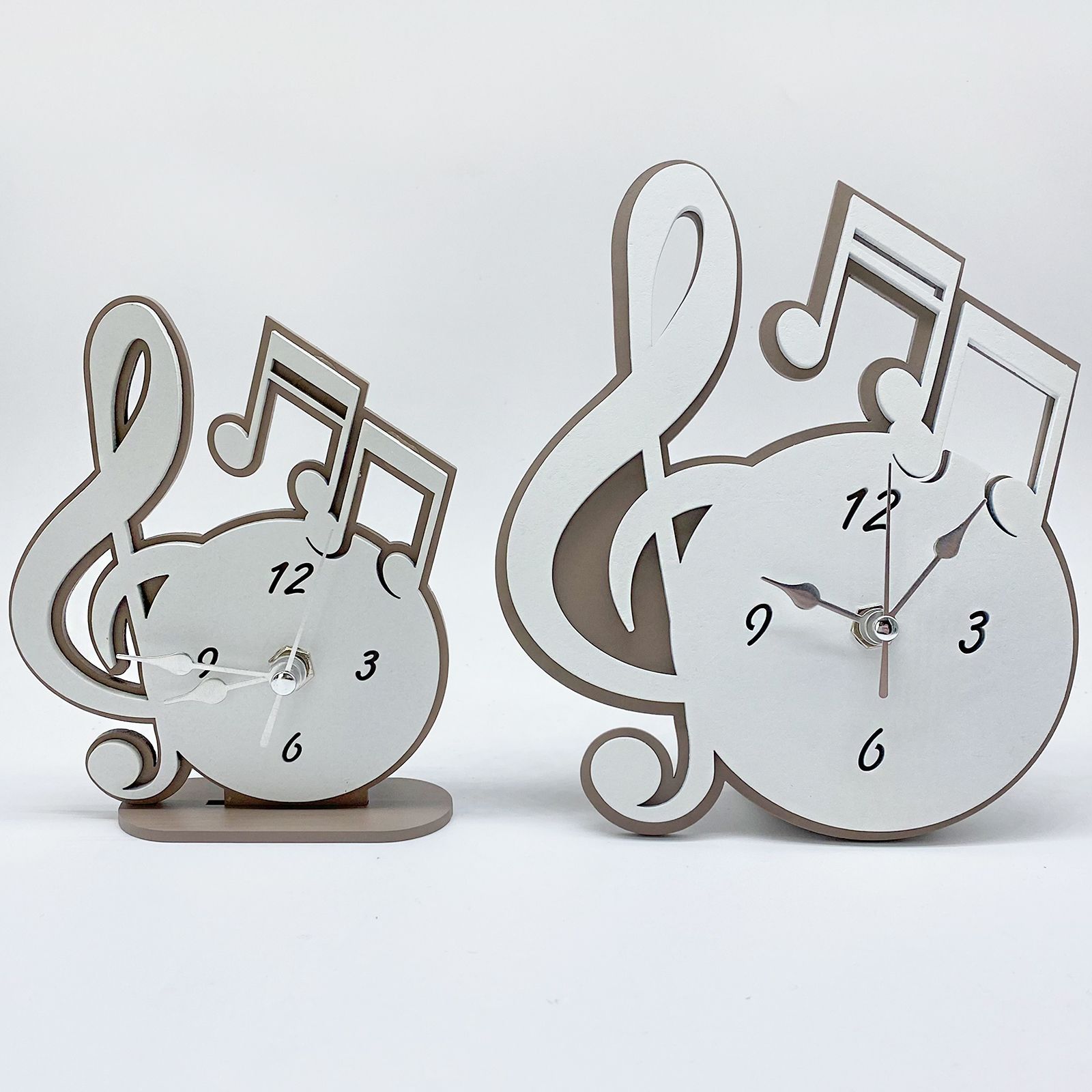 Sul nostro store arrivano gli orologi a tema note musicali! Splendidi orologi da tavolo con struttura in legno doppiato in due colori, per fondo e base in tonalità tortora e per la raffigurazione di note musicali e quadrante in bianco. Accanto alla chiave di violino, è presente l'orologio analogico con lancette in metallo color argento. L'orologio è alimentato da una batteria da 1,5 volts (AA - non inclusa).