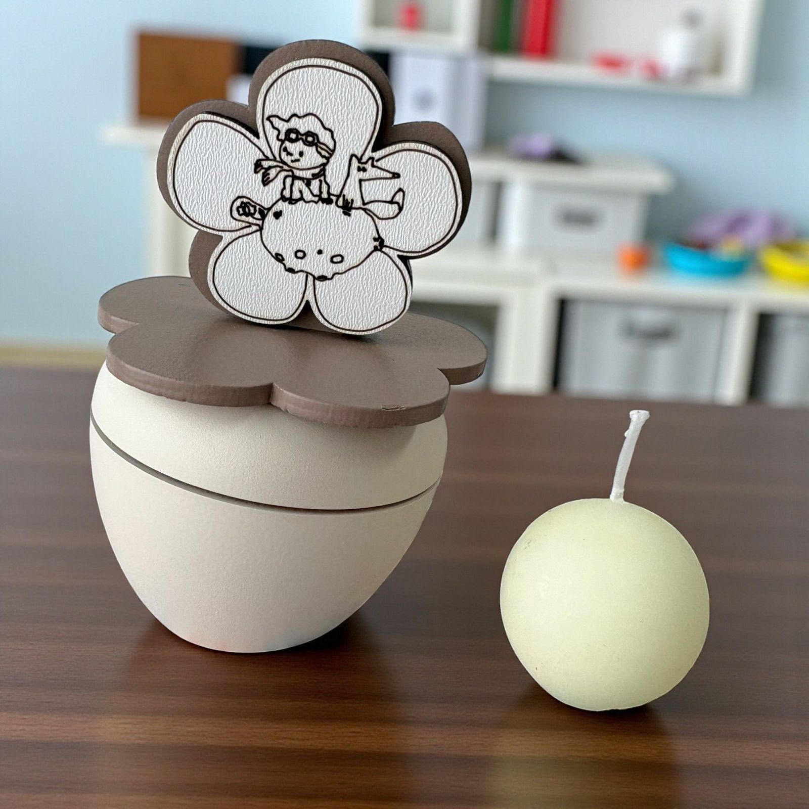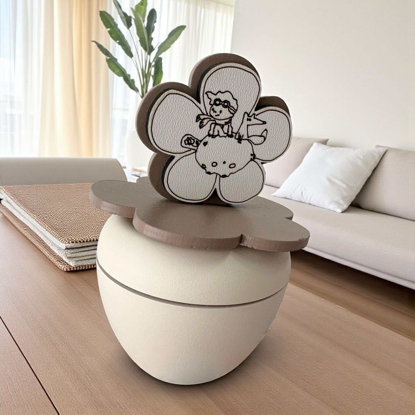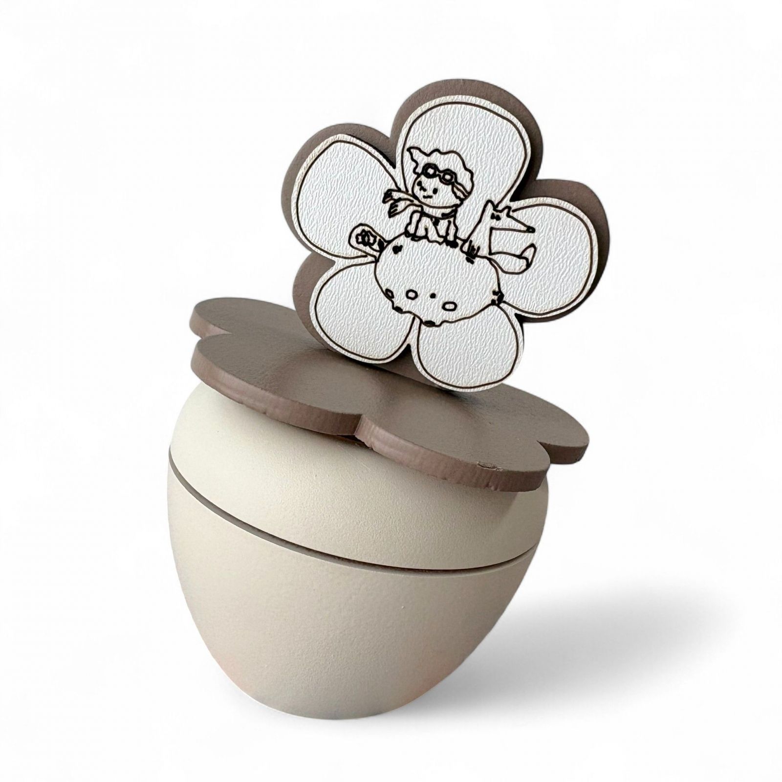 Scopri il nostro esclusivo portacandela, un'elegante fusione di arte e significato, ideale come bomboniera per il battesimo o la comunione. Sul coperchio, un incantevole fiore accoglie la dolce immagine del piccolo principe che gioca con la volpe sulla luna, un simbolo di avventura e amicizia che illumina i momenti speciali della vita.