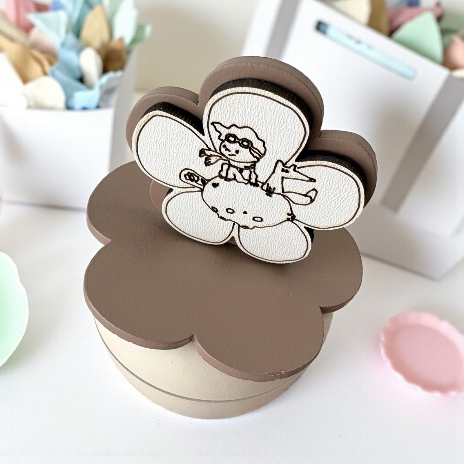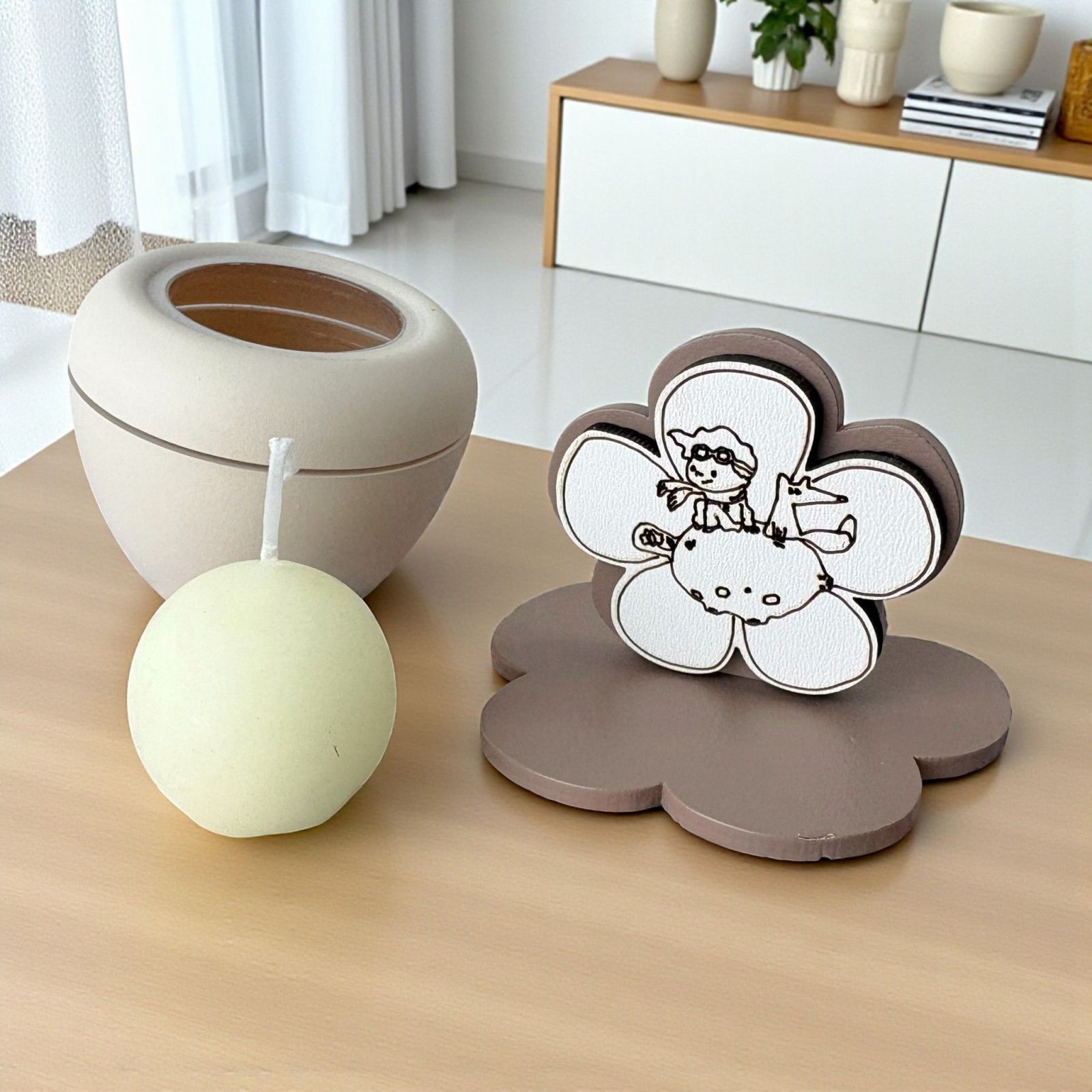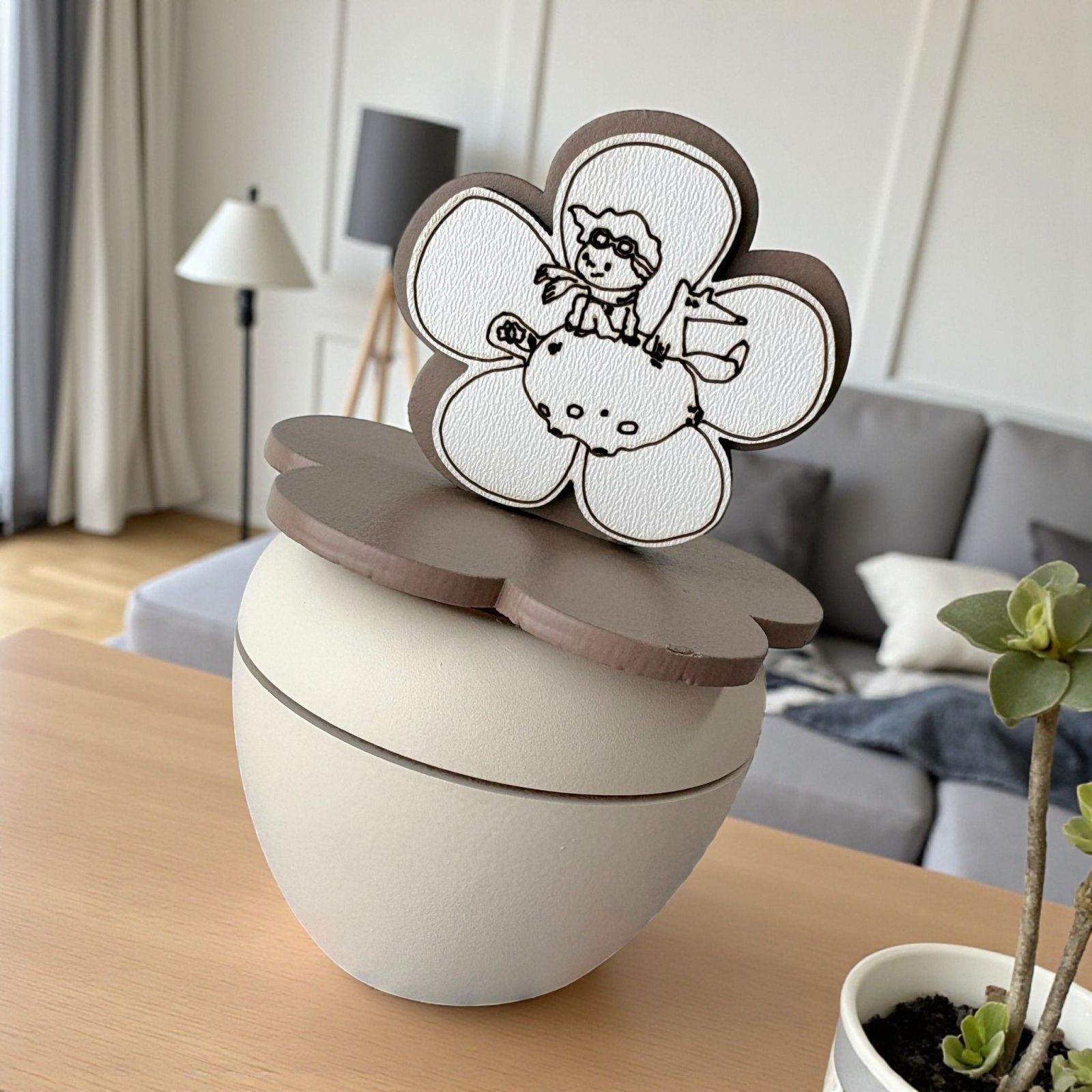 Scopri il nostro esclusivo portacandela, un'elegante fusione di arte e significato, ideale come bomboniera per il battesimo o la comunione. Sul coperchio, un incantevole fiore accoglie la dolce immagine del piccolo principe che gioca con la volpe sulla luna, un simbolo di avventura e amicizia che illumina i momenti speciali della vita.