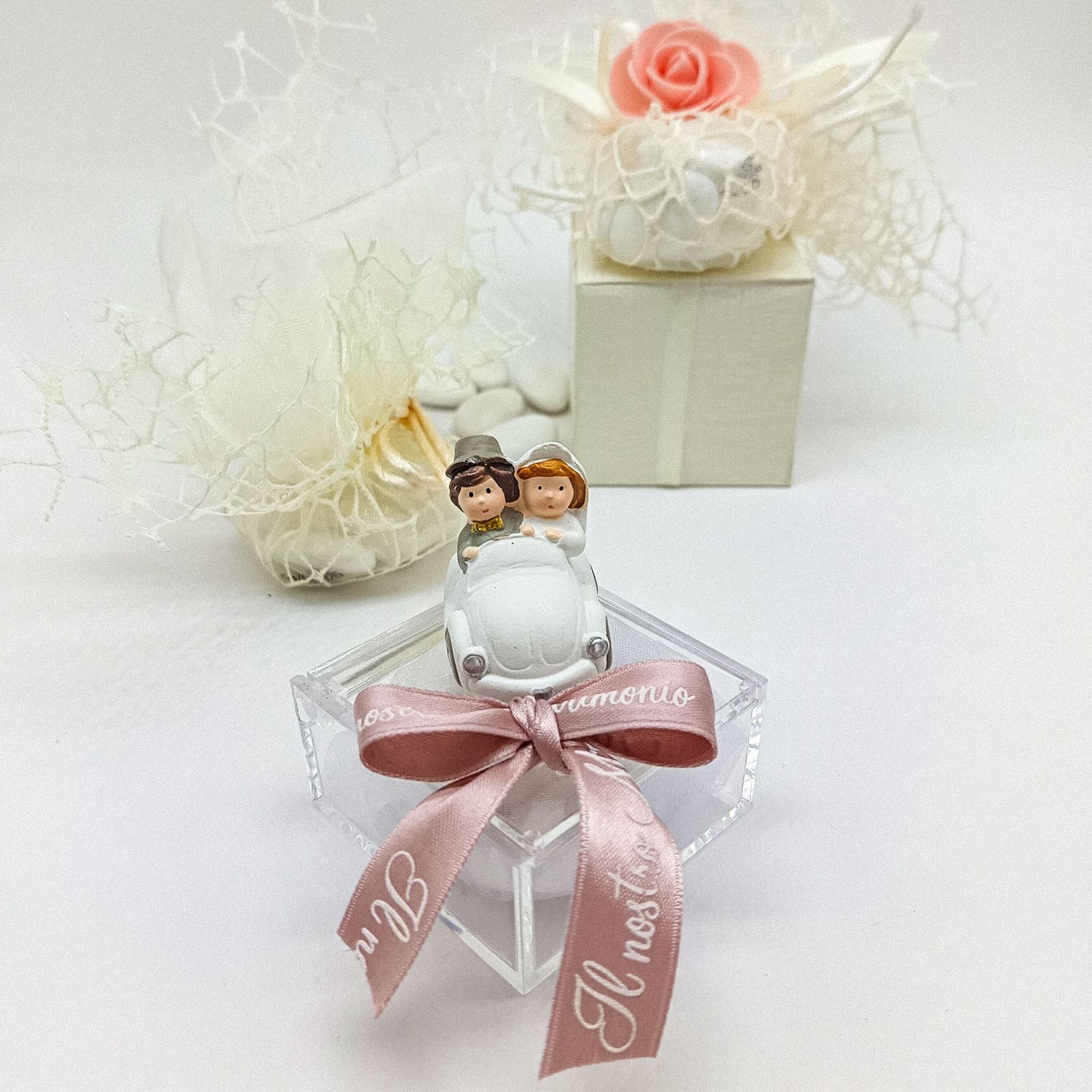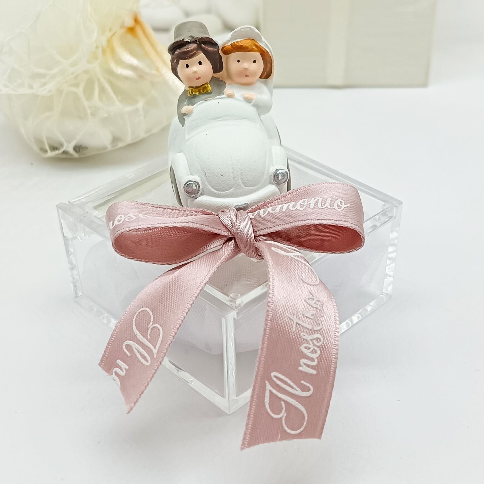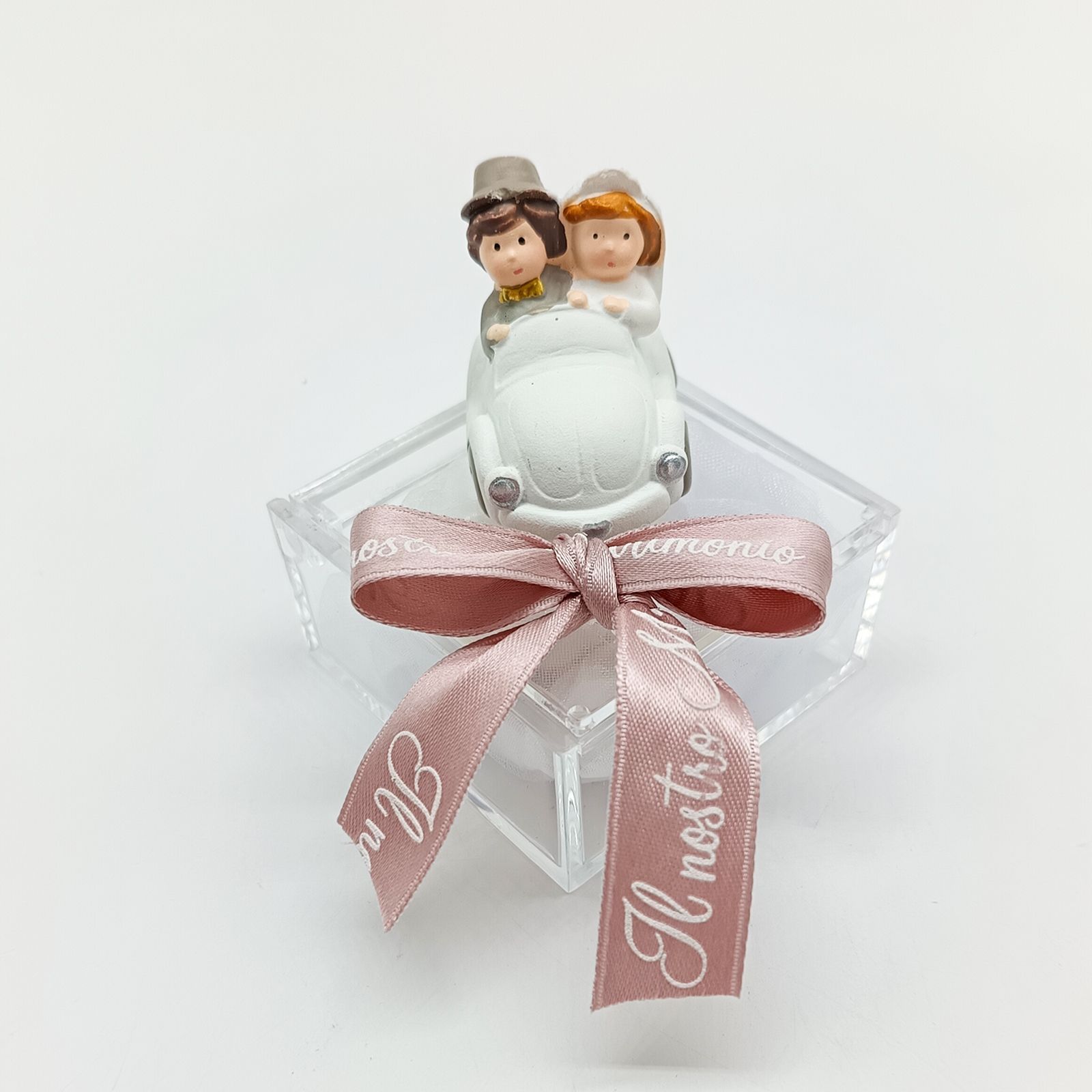 Celebra il tuo matrimonio, anniversario o promessa con una raffinata bomboniera: una scatolina in plexiglass trasparente con una simpatica statuina in resina posta sopra, che raffigura due sposini eleganti a bordo di un’auto. I delicati toni pastello la rendono perfetta per una confettata elegante e originale.