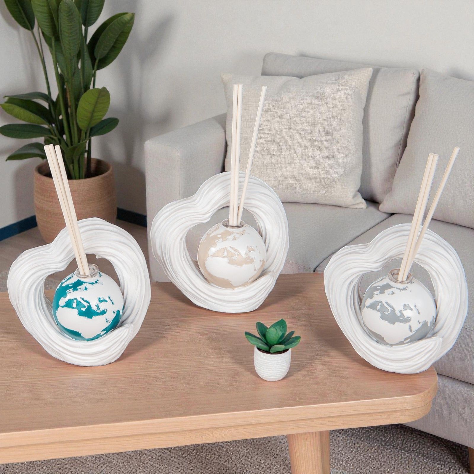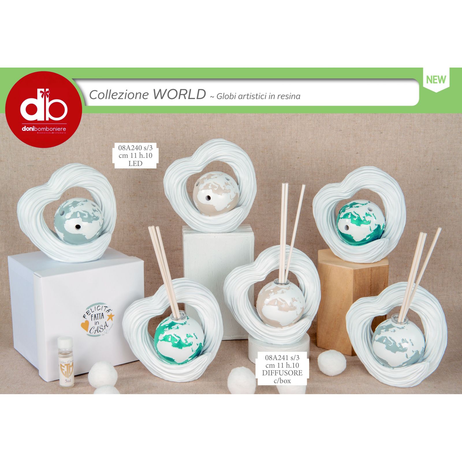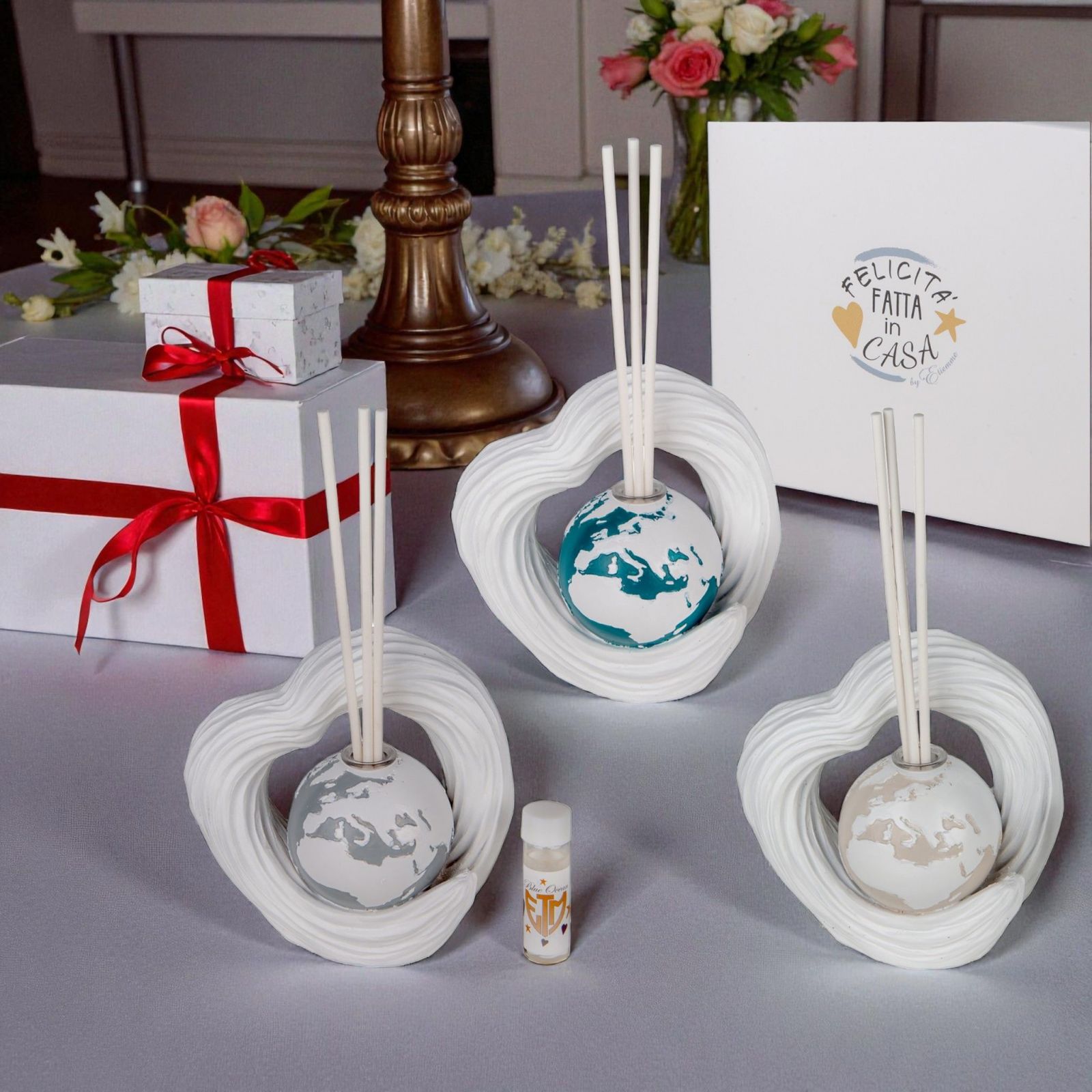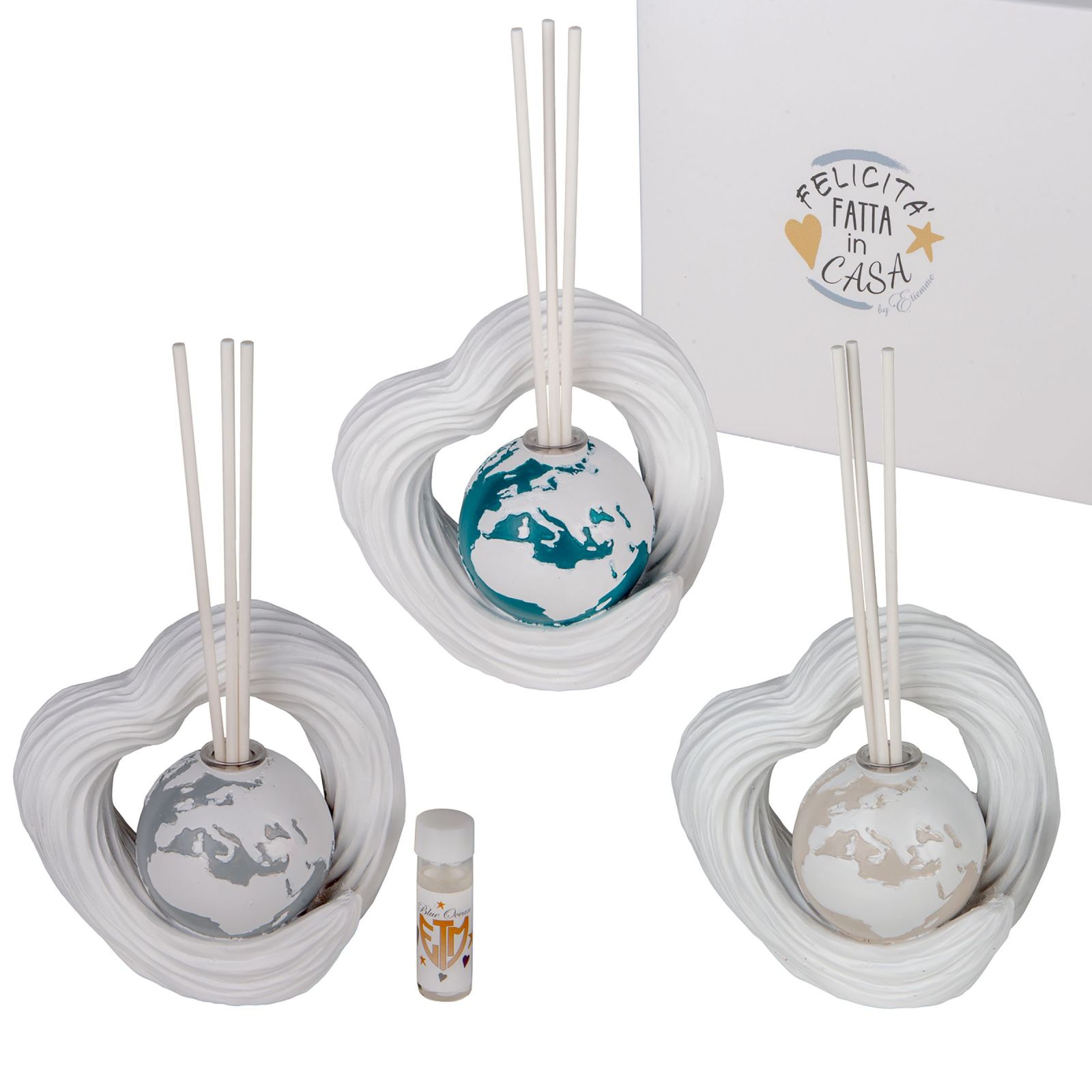 Realizzato in resina e rifinito con continenti dipinti di bianco su planisfero multicolore, il diffusore include scatola regalo, bacchette ed essenza in omaggio. Una idea economica bomboniere che unisce estetica e funzionalità, capace di sorprendere e affascinare chiunque lo riceva, rendendo indimenticabile ogni evento.