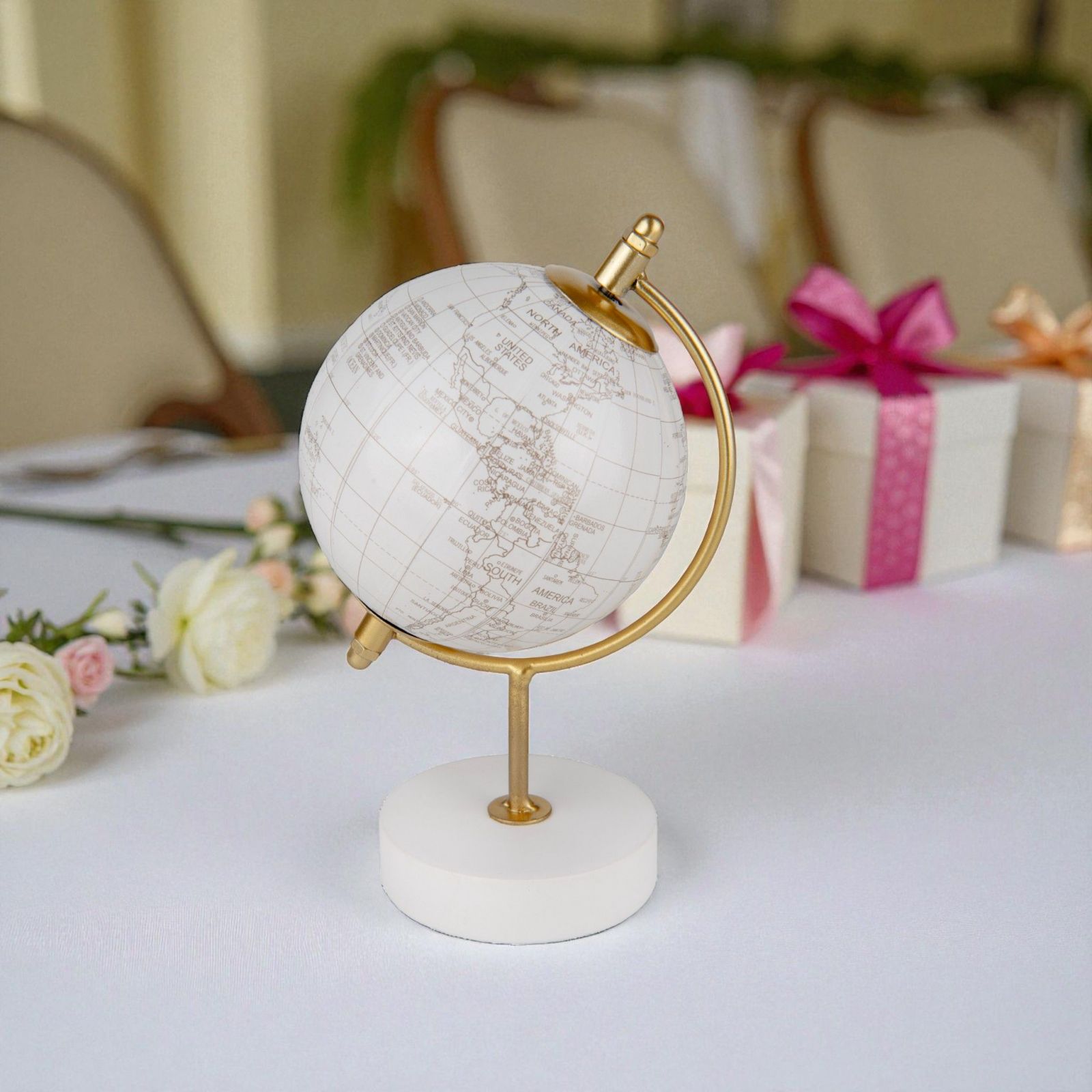 Un simbolo di avventura e curiosità, questo mappamondo girevole in bianco con dettagli dorati diventa una bomboniera tema viaggio elegante e originale. Perfetto per comunione, matrimonio, anniversario o laurea, offre agli invitati un ricordo raffinato che unisce bellezza e funzionalità.
