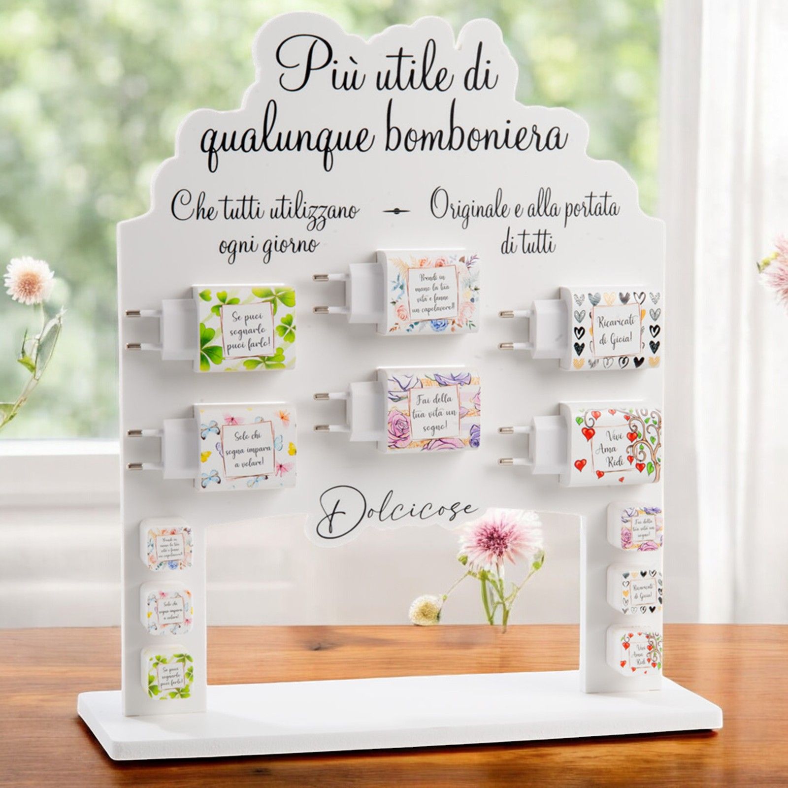 Regalare una bomboniera carica batterie significa pensare al benessere e alla comodità delle persone a cui vuoi bene. In un'epoca in cui siamo sempre connessi e dipendenti dai nostri dispositivi elettronici, un dono pratico e funzionale come questo non potrà che essere apprezzato da tutti. Inoltre, puoi scegliere tra diversi modelli, ognuno con una fantasia unica e una frase motivazionale.