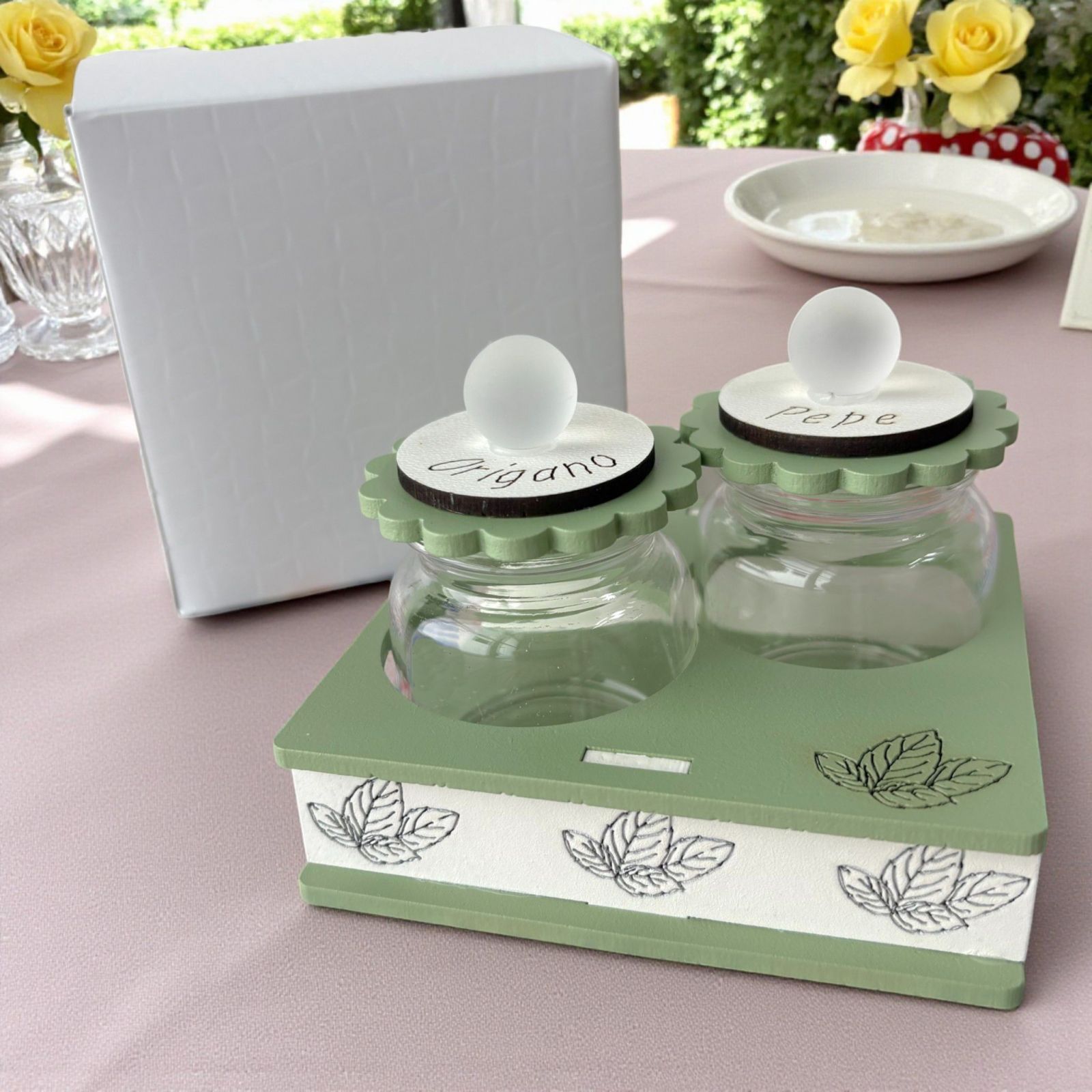 Scopri la magia di un portaspezie unico nel suo genere, perfetto come bomboniera per il matrimonio o per un anniversario speciale. Questo elegante accessorio, con la sua raffigurazione di foglie, non è solo un elemento decorativo, ma un simbolo di amore e cura. Regala un tocco di natura e autenticità ai tuoi eventi, rendendo ogni tavola un luogo di convivialità e stile.