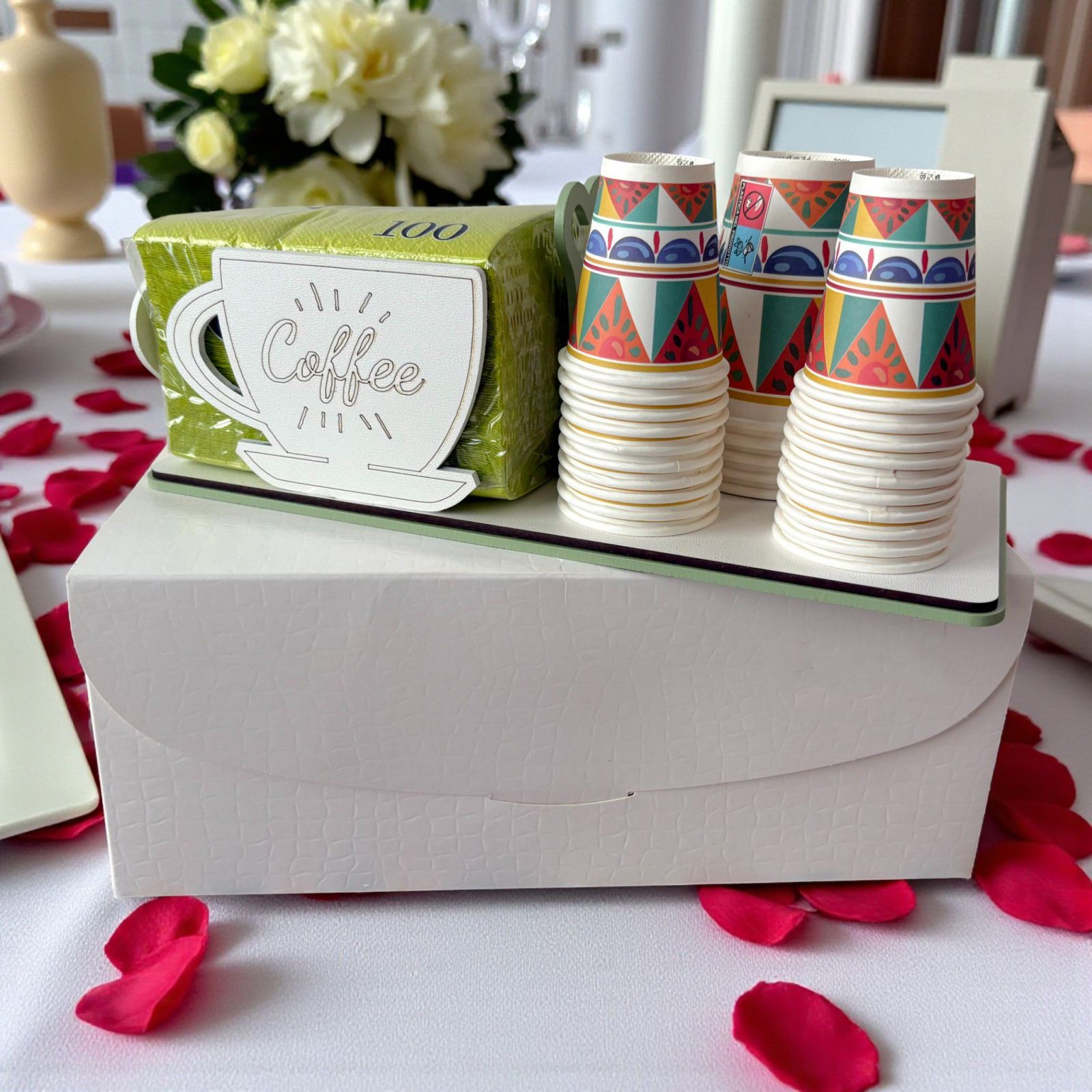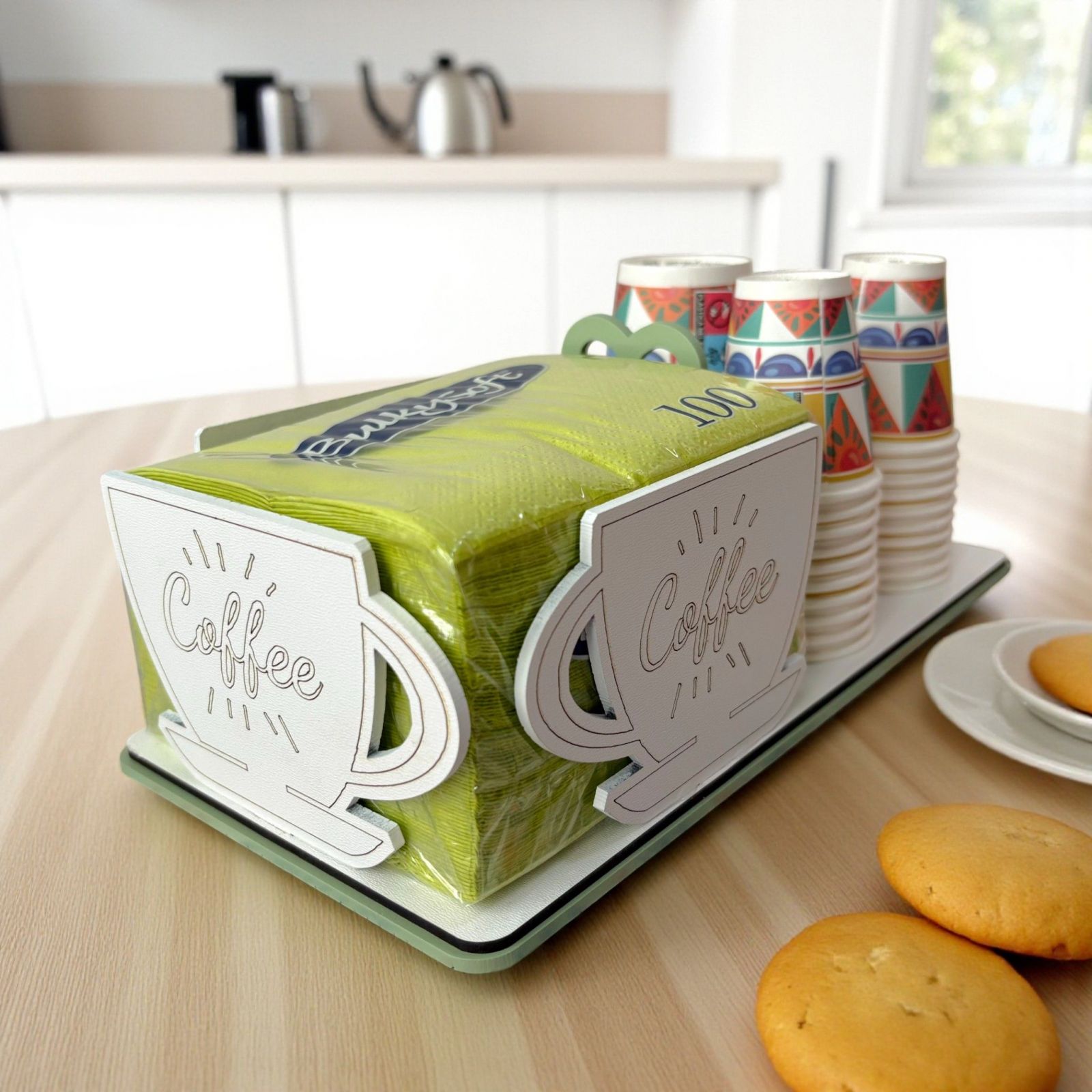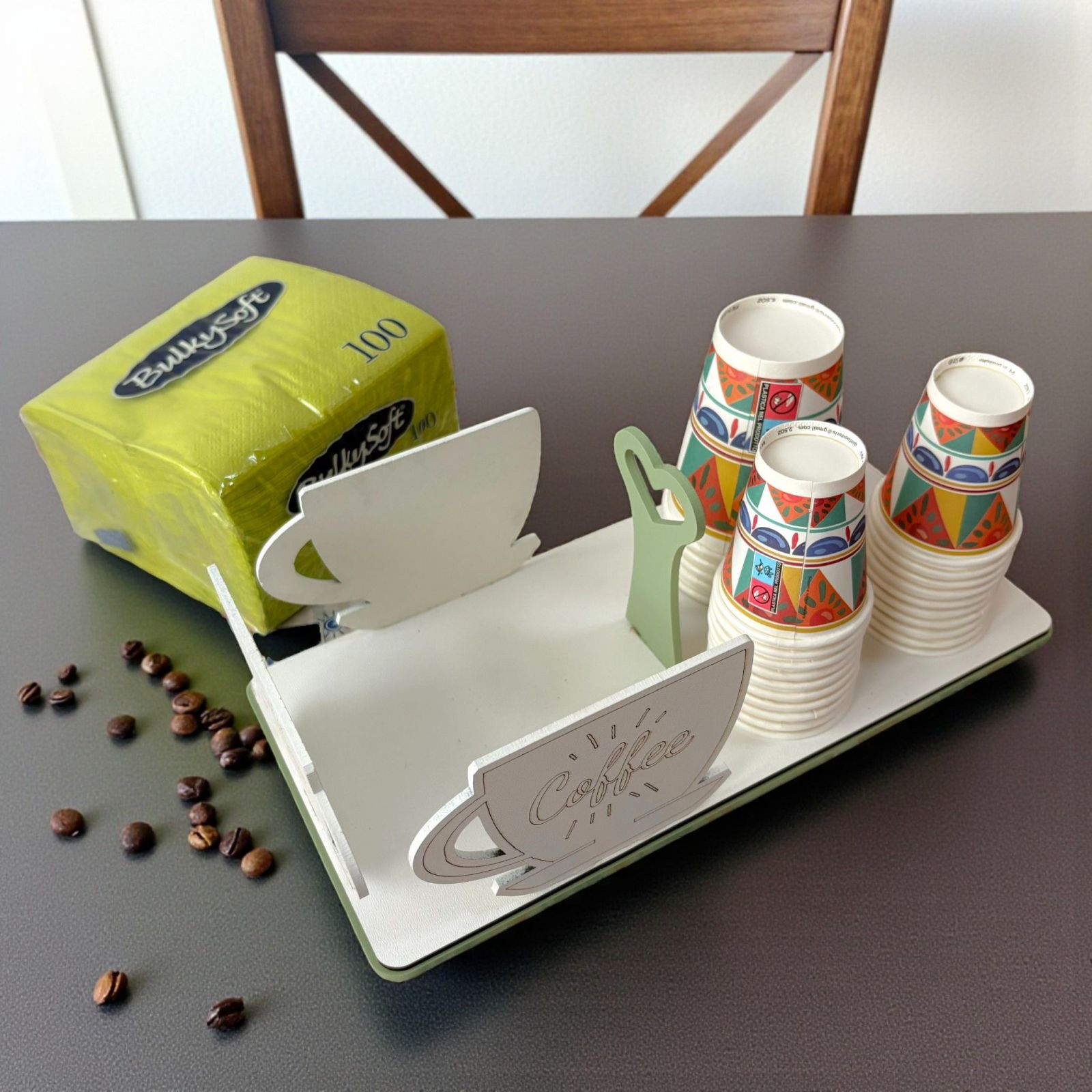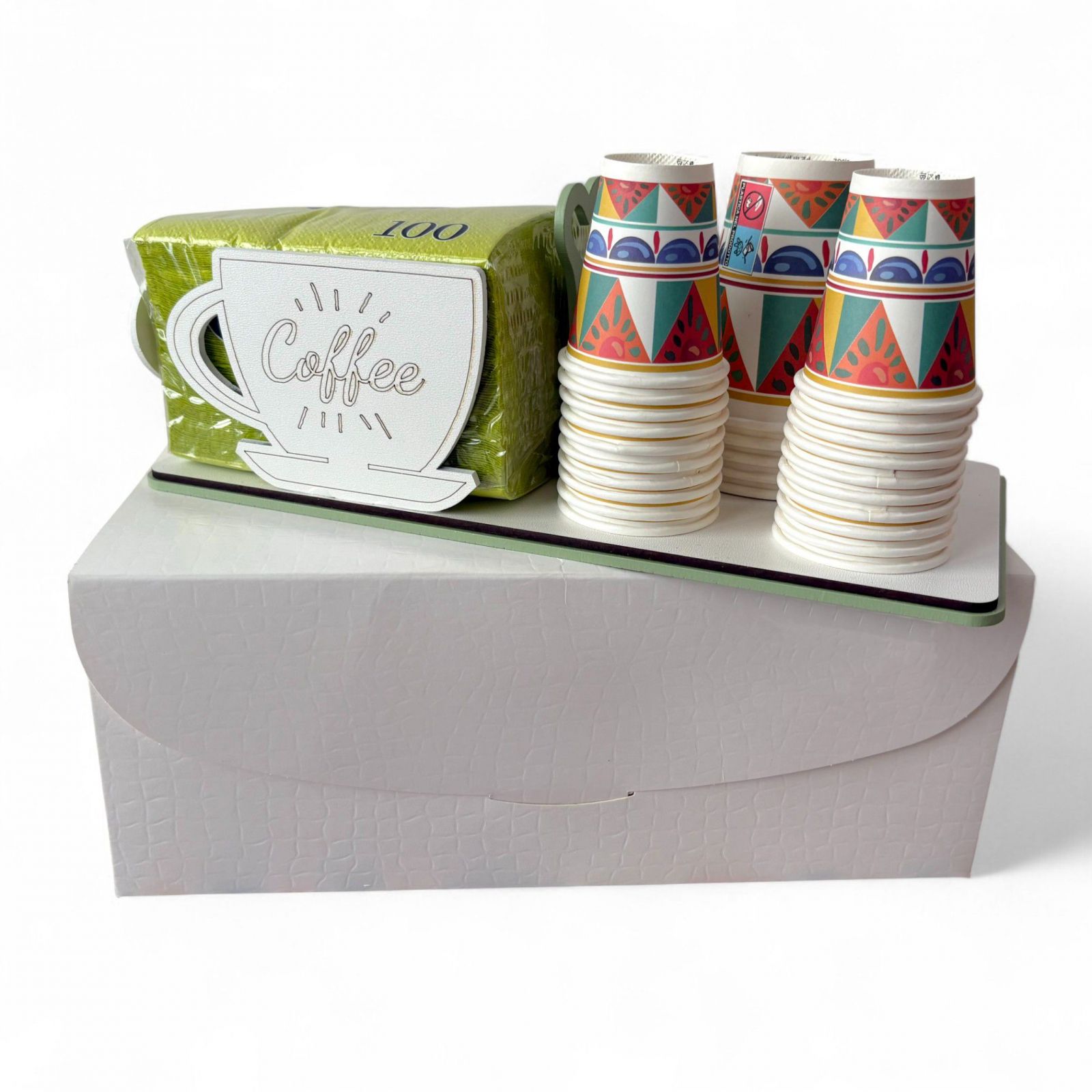 Sorprendi i tuoi invitati con questo elegante set da tavola, composto da portatovaglioli con tazza e scritta coffee e portabicchieri in legno, perfetto come bomboniera matrimonio o bomboniera anniversario. Il design raffinato nei toni verde salvia e bianco aggiunge un tocco di classe a ogni tavola, trasformando il dono in un ricordo utile e originale.