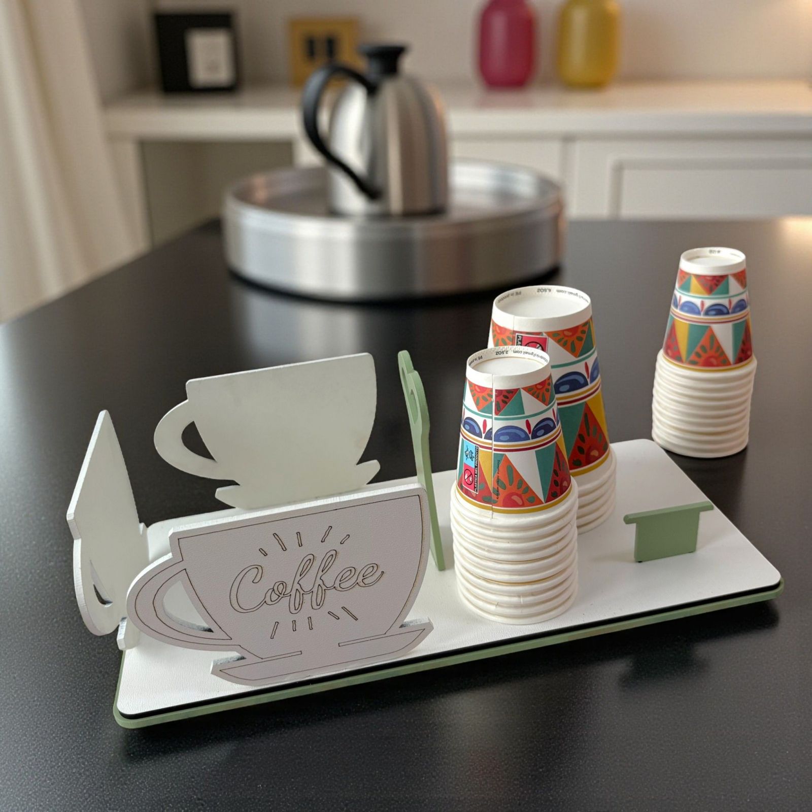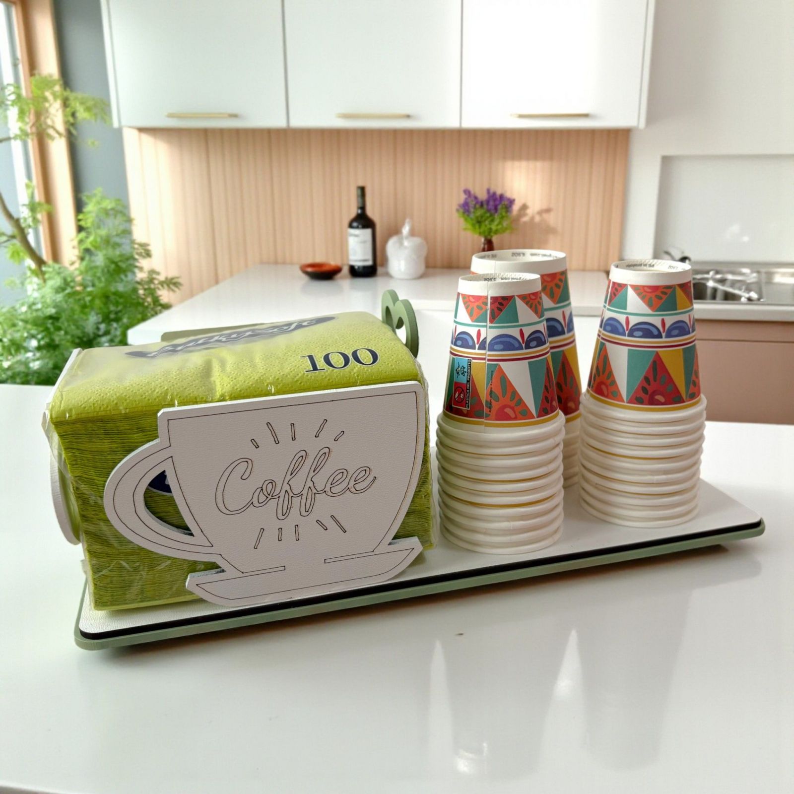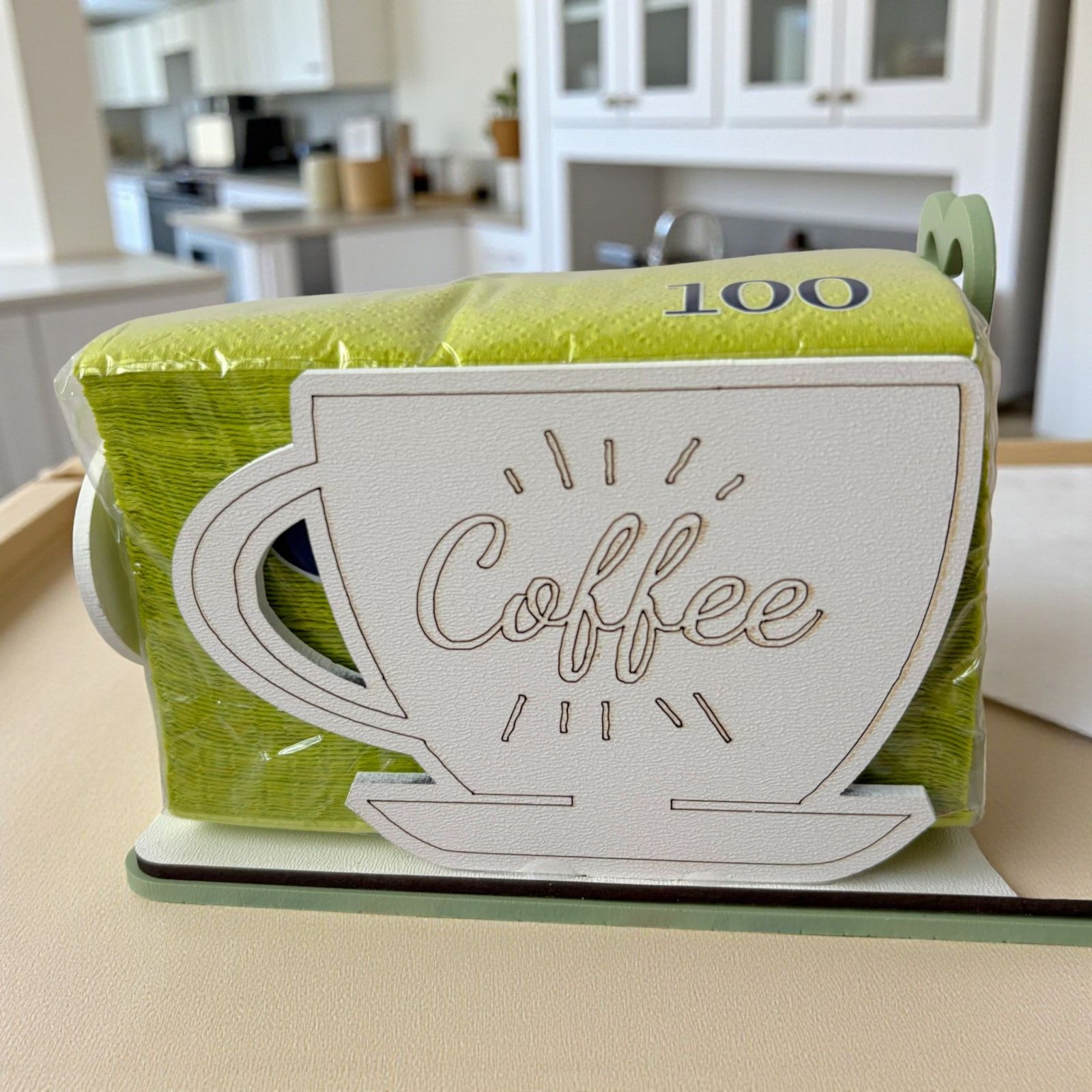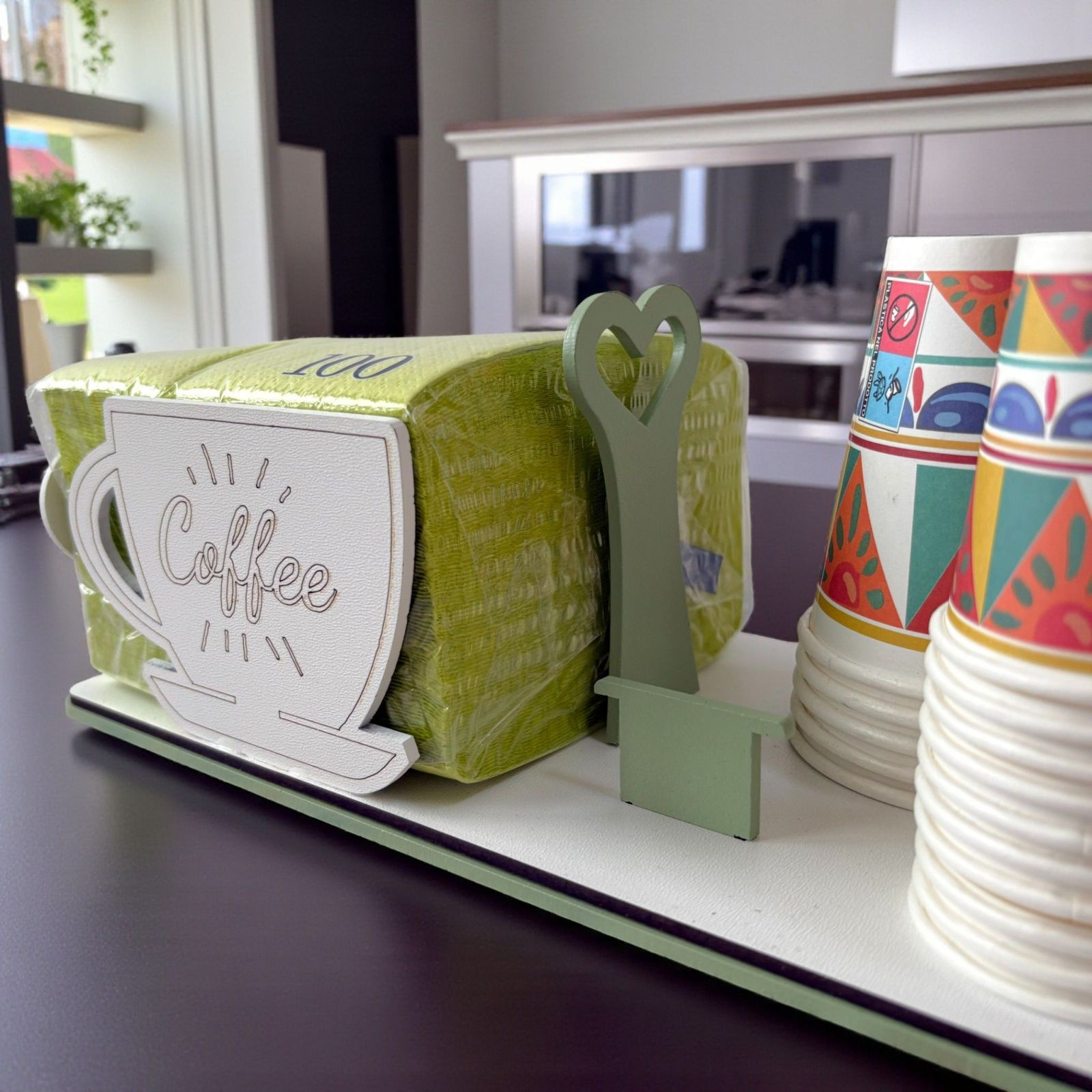 Sorprendi i tuoi invitati con questo elegante set da tavola, composto da portatovaglioli con tazza e scritta coffee e portabicchieri in legno, perfetto come bomboniera matrimonio o bomboniera anniversario. Il design raffinato nei toni verde salvia e bianco aggiunge un tocco di classe a ogni tavola, trasformando il dono in un ricordo utile e originale.