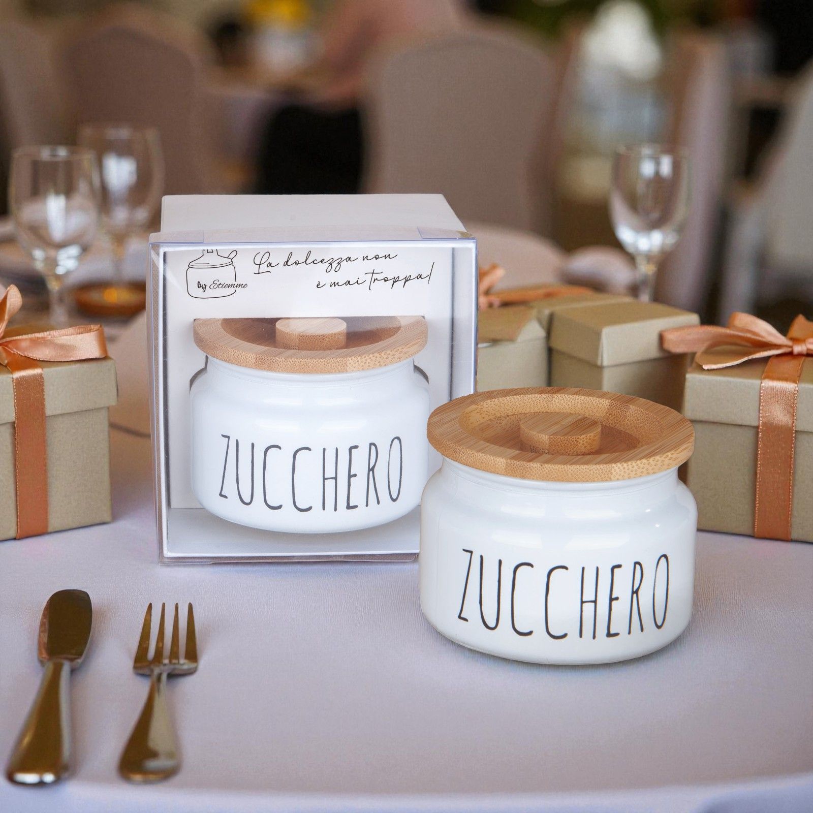 Ogni occasione speciale merita un tocco di eleganza e un pizzico di dolcezza. La nostra zuccheriera con coperchio in legno rappresenta una scelta perfetta per rendere indimenticabili momenti come matrimoni e anniversari. Con la scritta "Zucchero" sul davanti, questo oggetto non è solo utile, ma diventa un simbolo di amore e condivisione, un modo per celebrare la dolcezza della vita insieme ai propri cari.