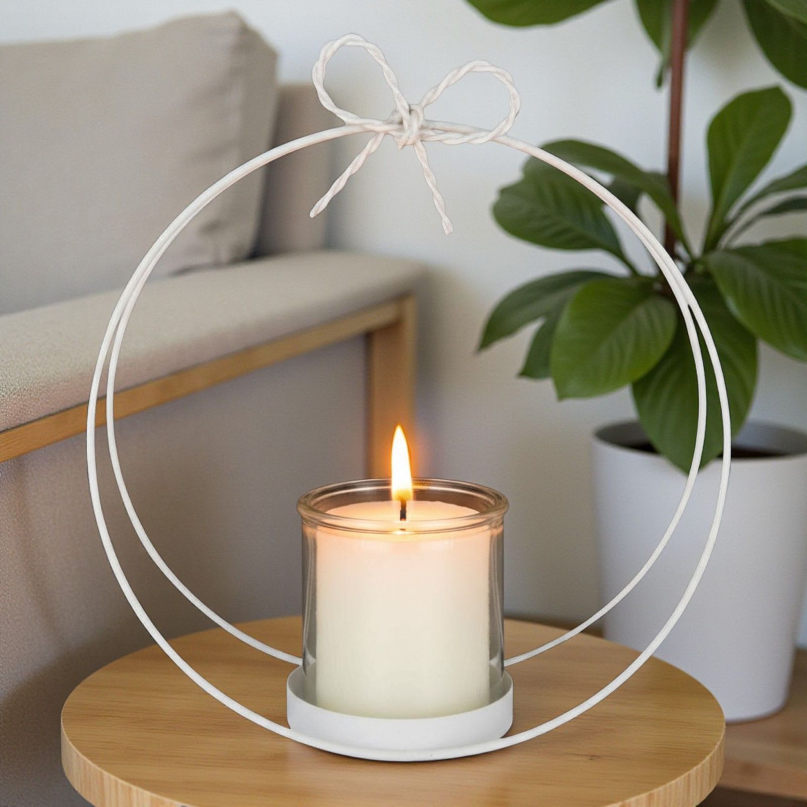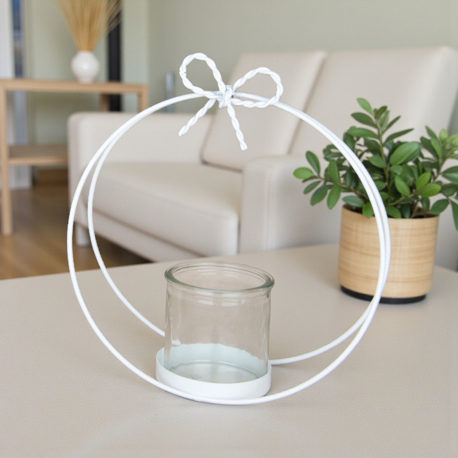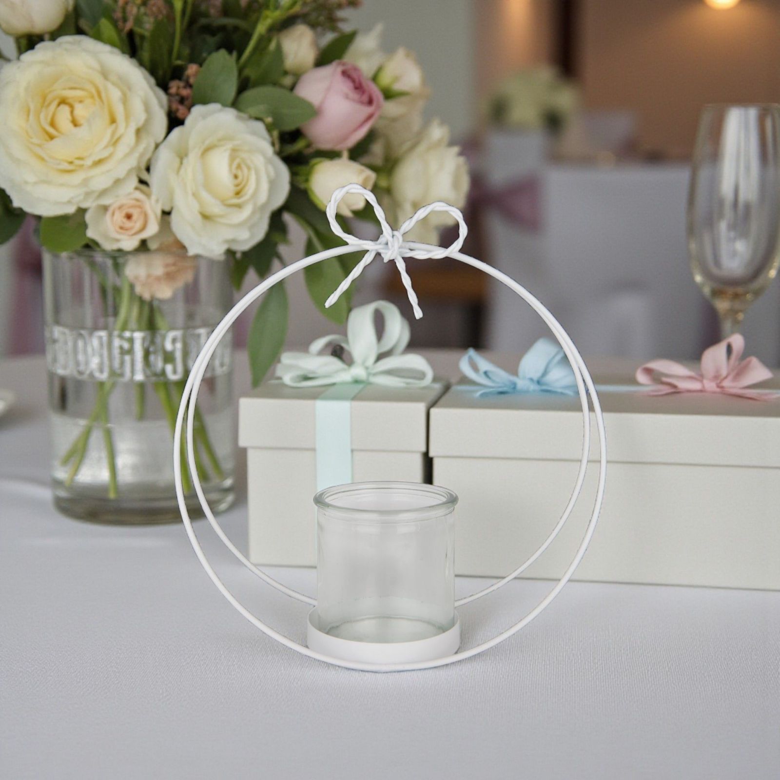 Incantevole bomboniera per matrimoni e anniversari, questo porta candela con arco chiuso e fiocco intrecciato unisce eleganza e delicatezza. Il contenitore in vetro aggiunge un tocco luminoso, rendendo speciale il ricordo da donare agli invitati.