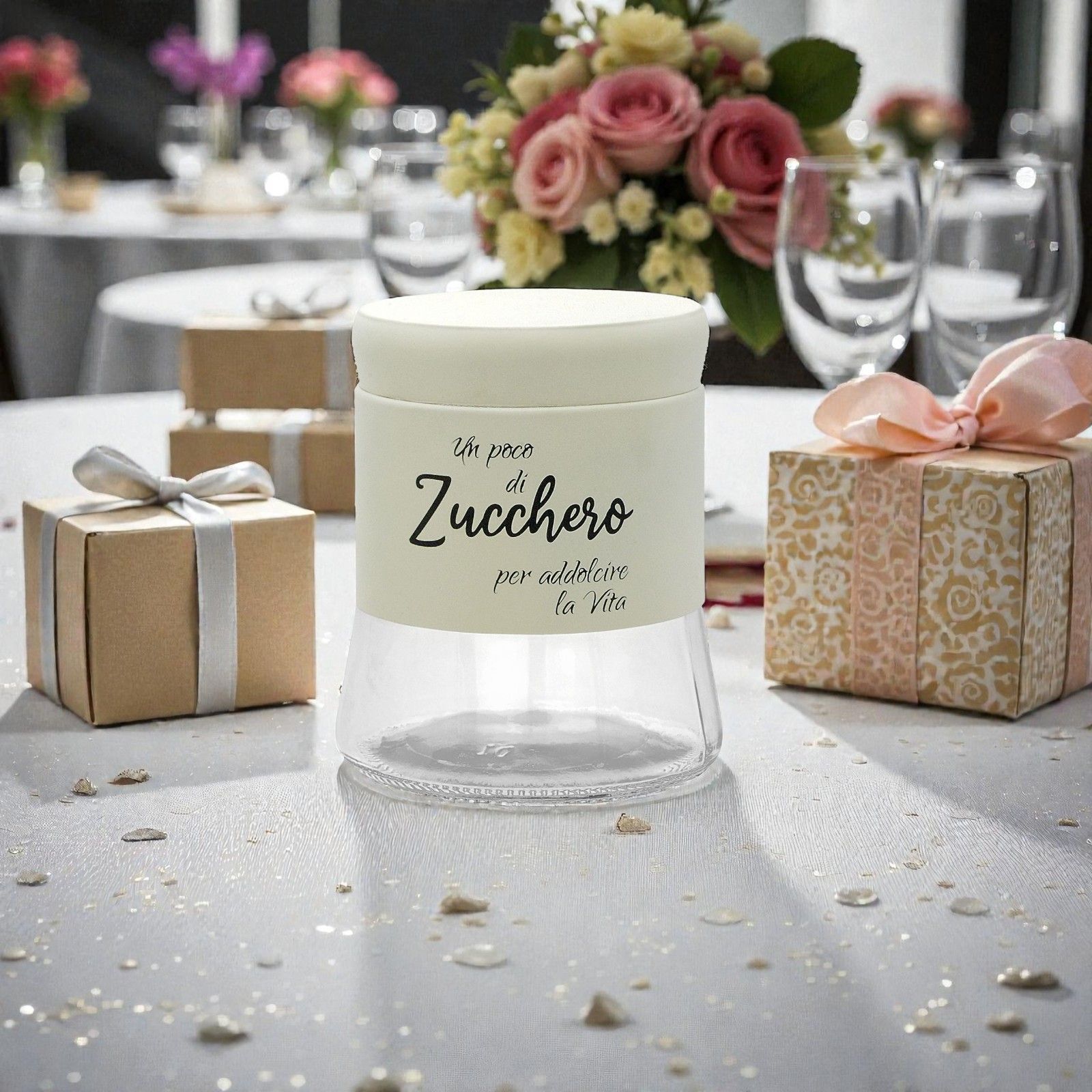 Rendi il tuo giorno speciale ancora più indimenticabile con una bomboniera che parla al cuore: il nostro barattolo porta zucchero con la scritta "Un poco di zucchero per addolcire la vita". Un regalo che non solo abbellirà la tua tavola, ma rappresenterà un simbolo di dolcezza e affetto, perfetto per ogni matrimonio. Ogni volta che i tuoi ospiti lo utilizzeranno, ricorderanno il giorno del tuo sì con un sorriso.