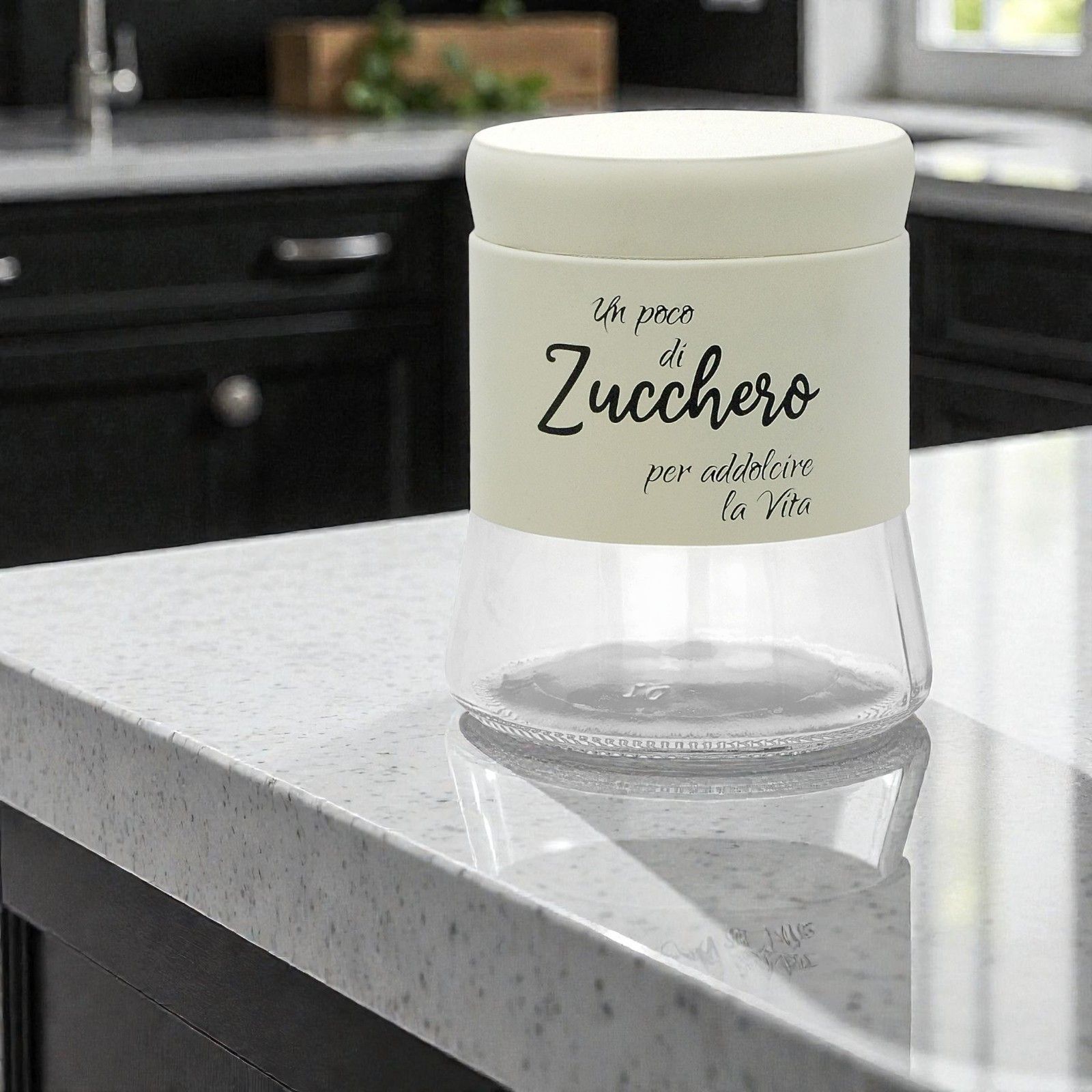Realizzato in vetro di alta qualità, questo barattolo non è solo un elemento decorativo ma anche una delle bomboniere utili che i tuoi invitati porteranno a casa con piacere. Con il suo design elegante in bianco e la scritta nera, si inserisce perfettamente in ogni cucina, diventando un oggetto di uso quotidiano e un ricordo del tuo giorno speciale.