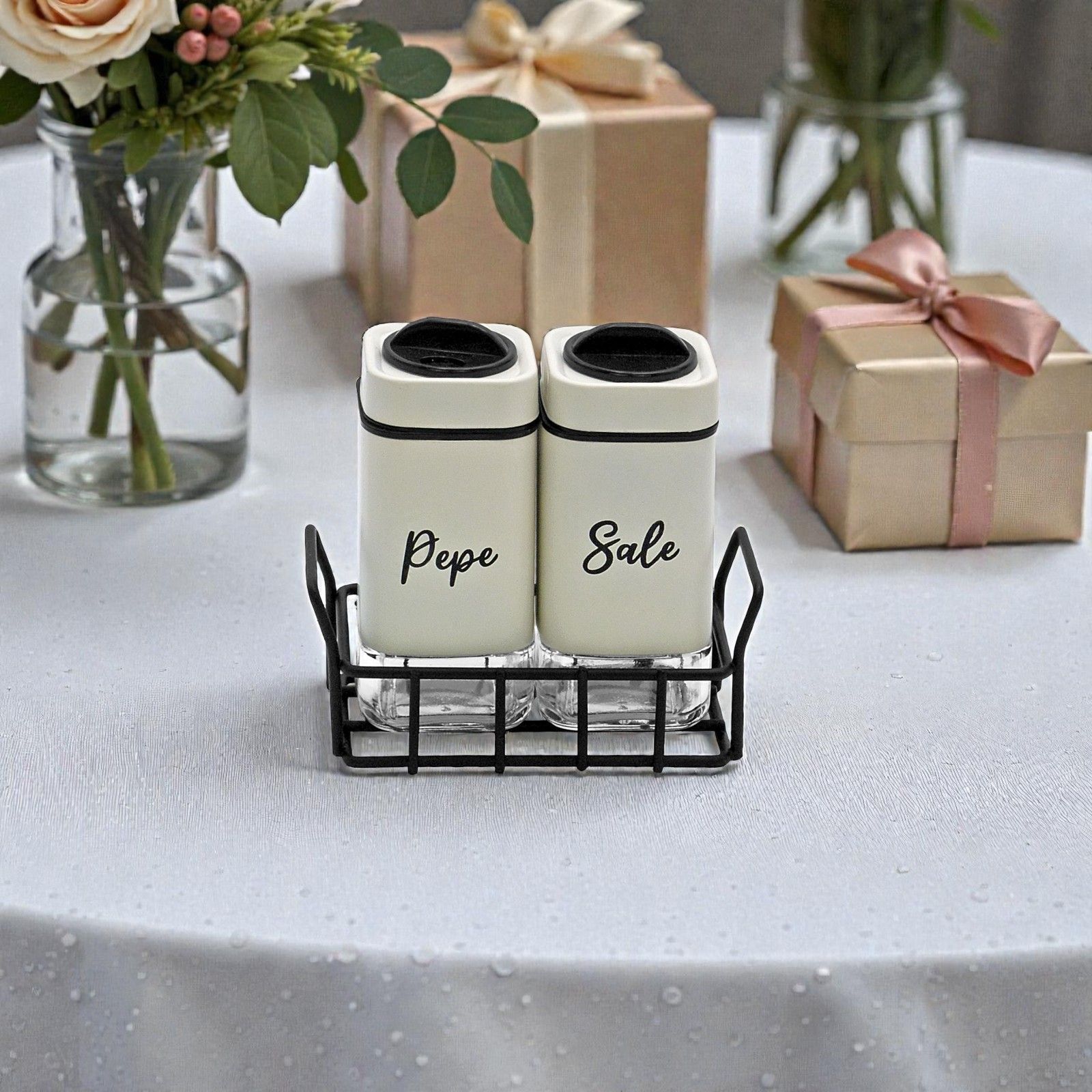 Conquista i tuoi invitati con una bomboniera elegante e pratica: questo set sale e pepe con scritte personalizzate è pensato per essere un ricordo utile e raffinato del tuo matrimonio. Realizzato in vetro e metallo, unisce stile e funzionalità, diventando una bomboniera cucina che ogni ospite potrà usare quotidianamente.
