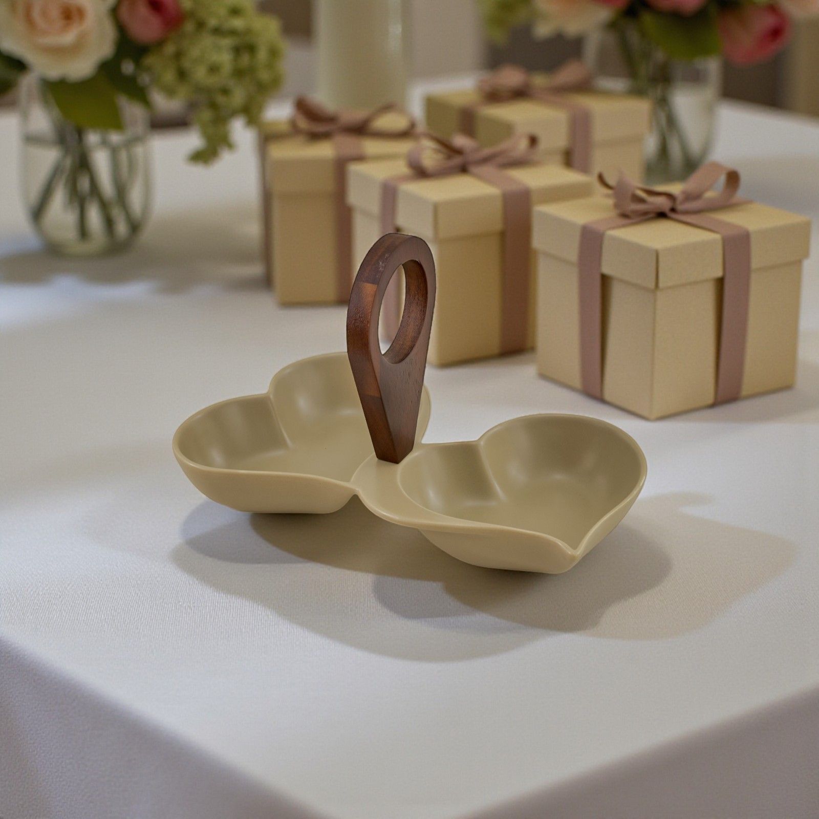 Il design elegante e contemporaneo di questa bomboniera per la casa è accentuato dai colori tortora e legno scuro, che si integrano perfettamente in ogni ambiente. Le due ciotoline unite presentano un manico in legno per un facile trasporto, offrono la praticità che ogni ospite apprezzerà. Regala un tocco di stile e affetto con questa bomboniera , un gesto che rimarrà nel cuore di chi la riceve.