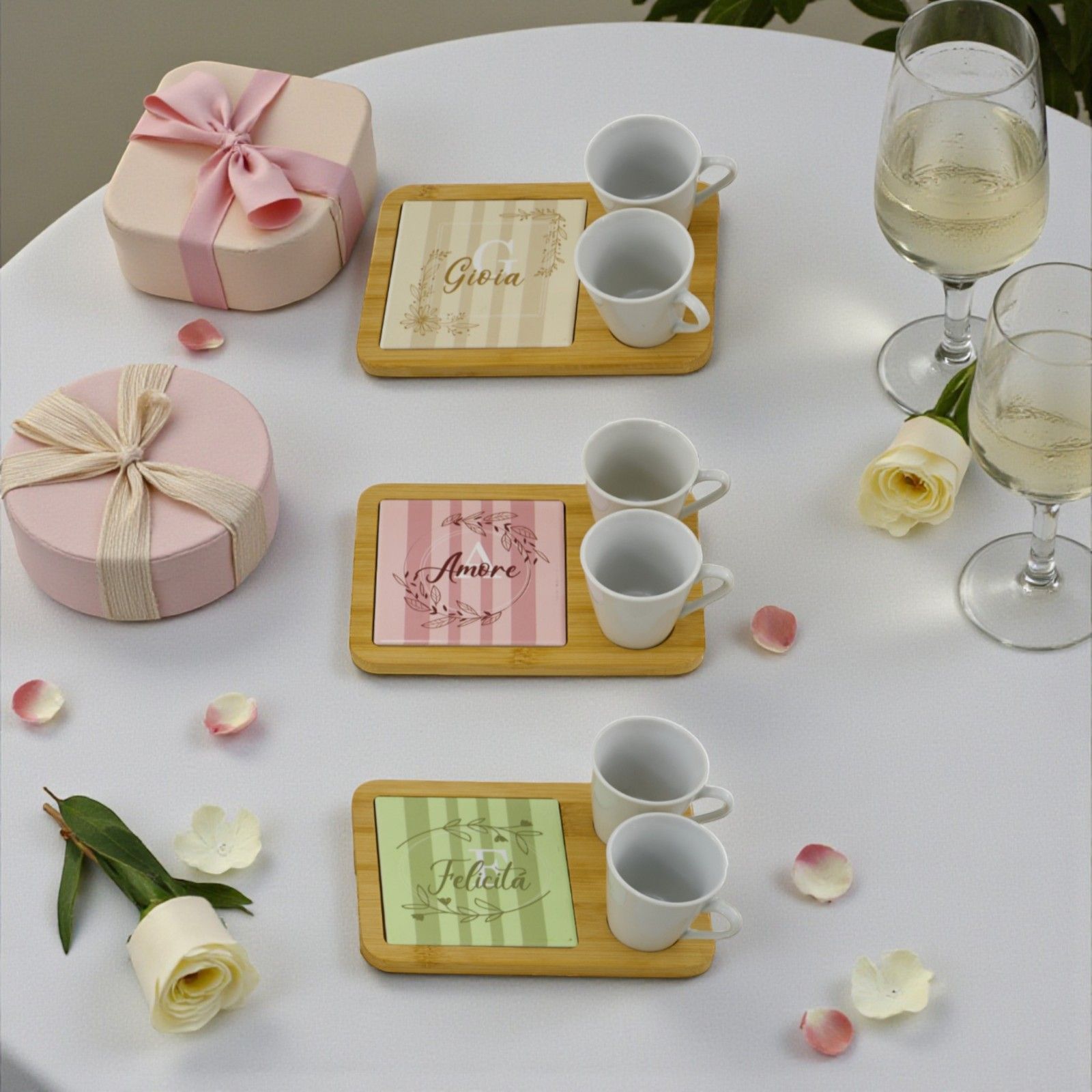 Ogni set di tazzine è pensato per lasciare un'impronta duratura, perfetto per le tue bomboniere per testimoni o per chiunque desideri un ricordo esclusivo. Non è solo un regalo, ma un gesto che porterà un sorriso sul volto dei tuoi amici e familiari ogni volta che si siederanno a gustare un caffè insieme.