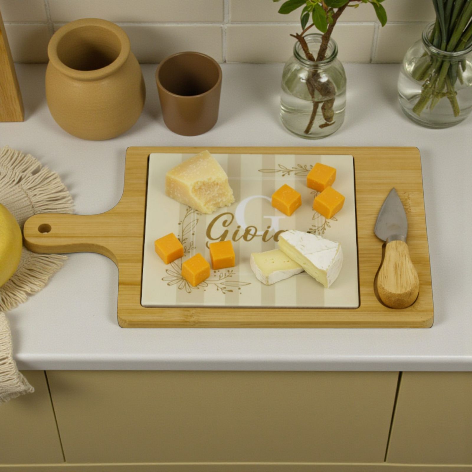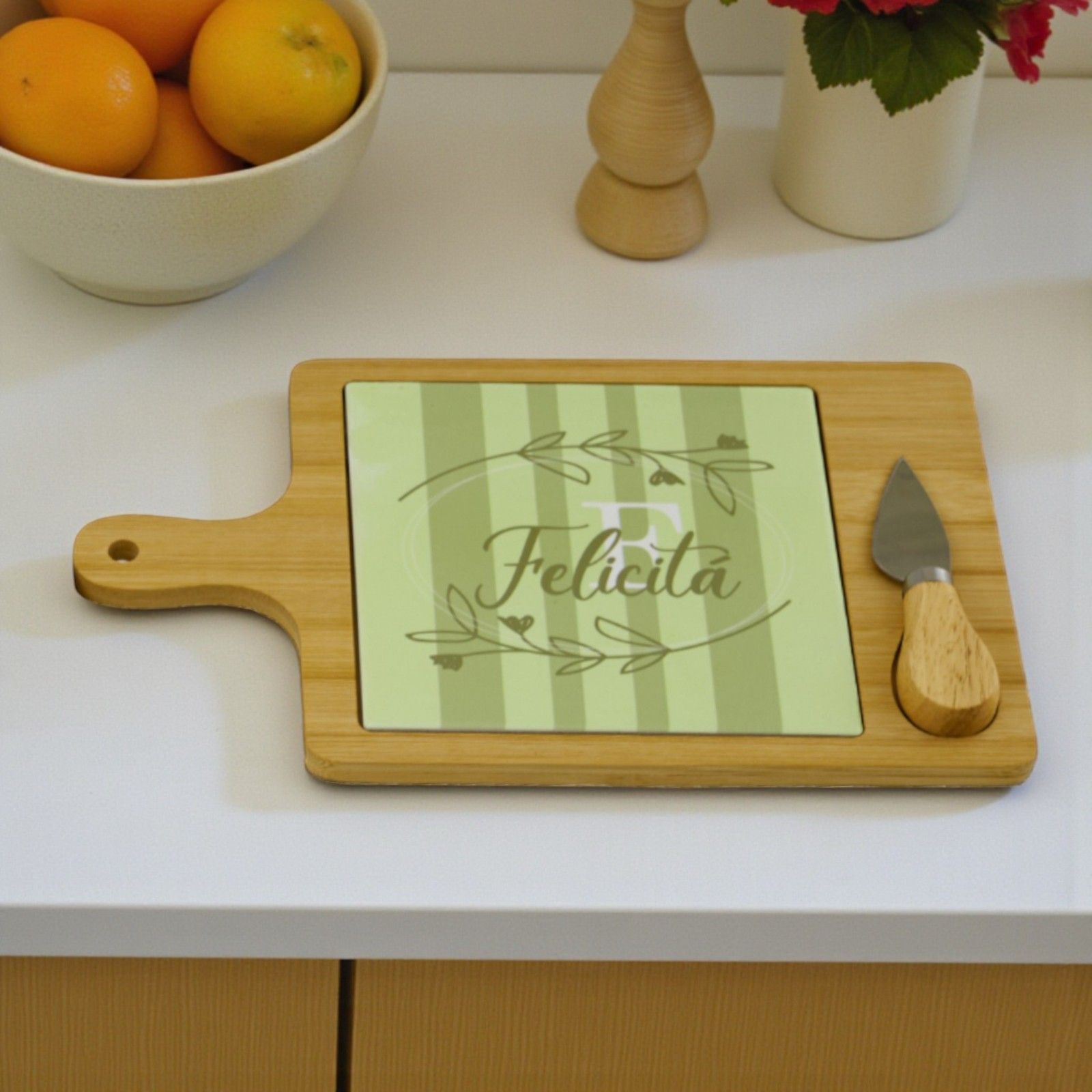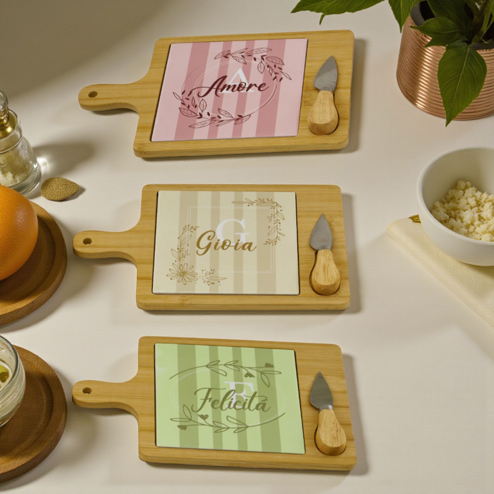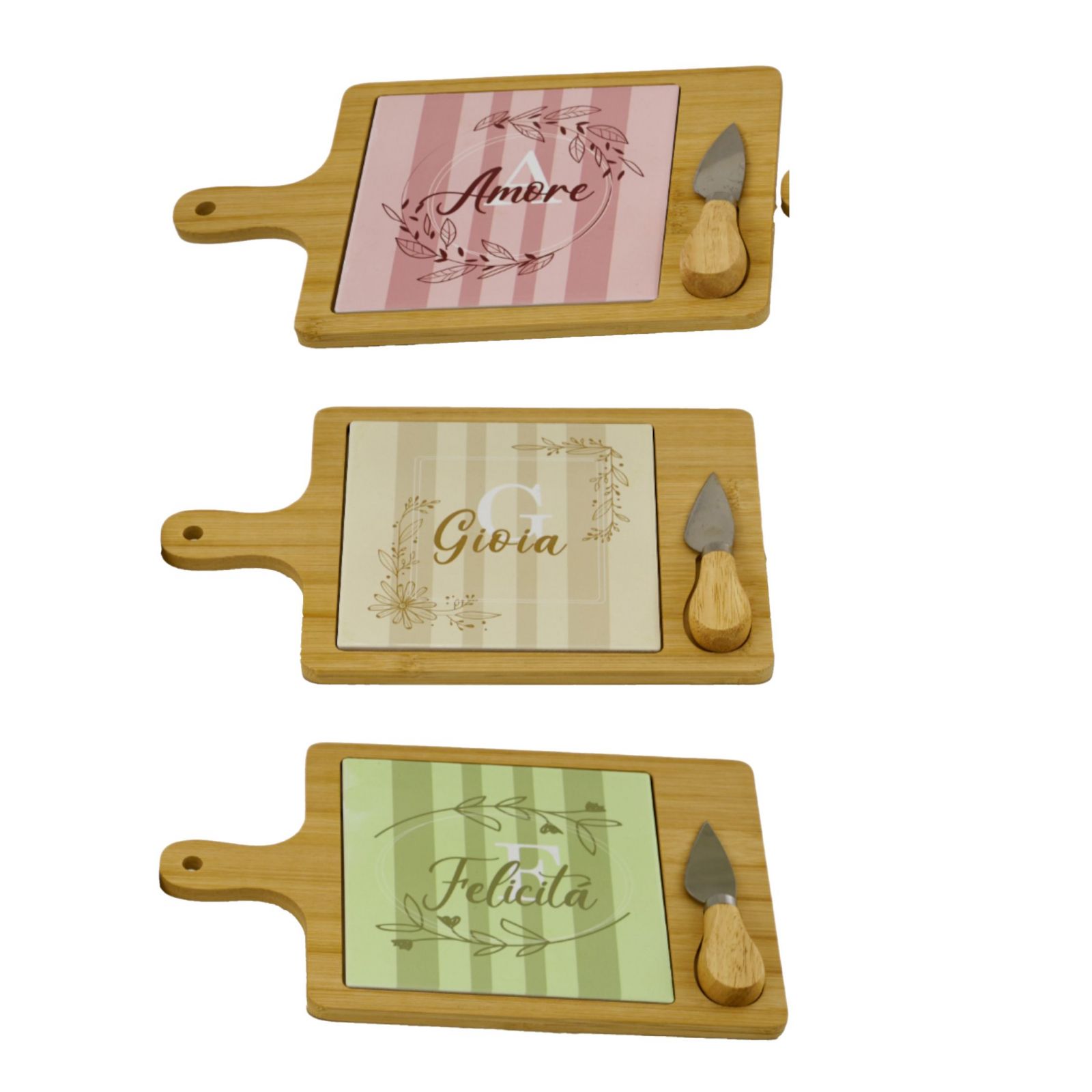 Realizzato in materiali di alta qualità, con un vassoio in legno e ceramica e un coltello con lama in acciaio, questo set è tanto elegante quanto pratico. Ideale per chi ama gli aperitivi e il buon cibo, le varianti colore - giallo, rosa e verde - con le parole "Gioia", "Amore" e "Felicità" renderanno ogni occasione ancor più speciale.