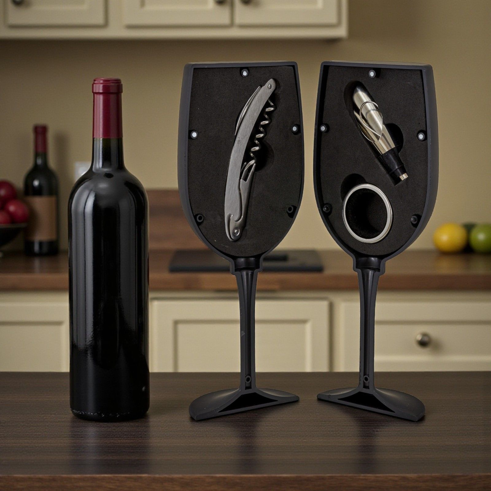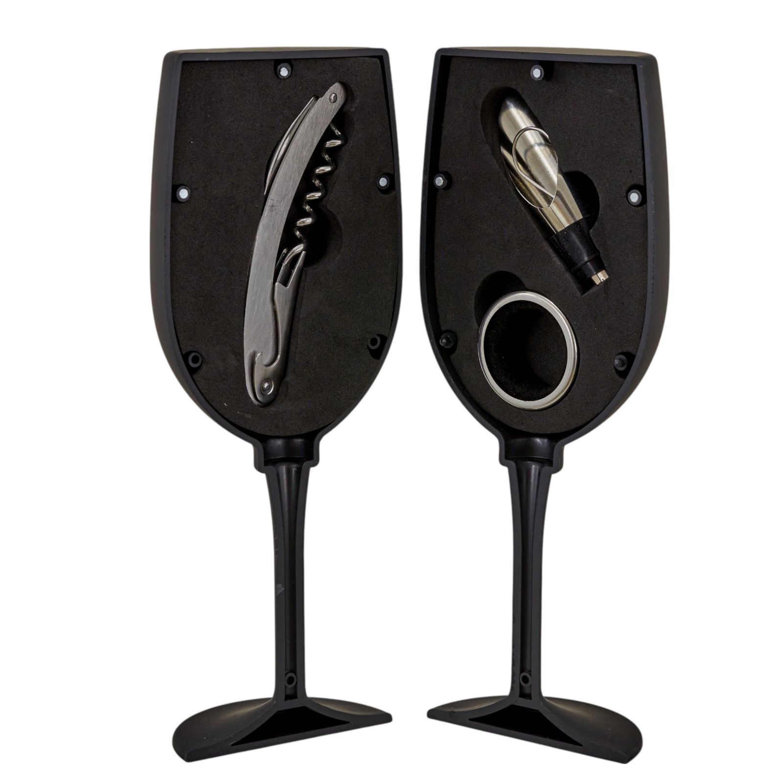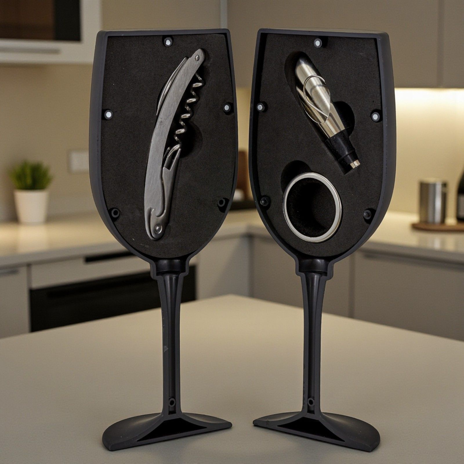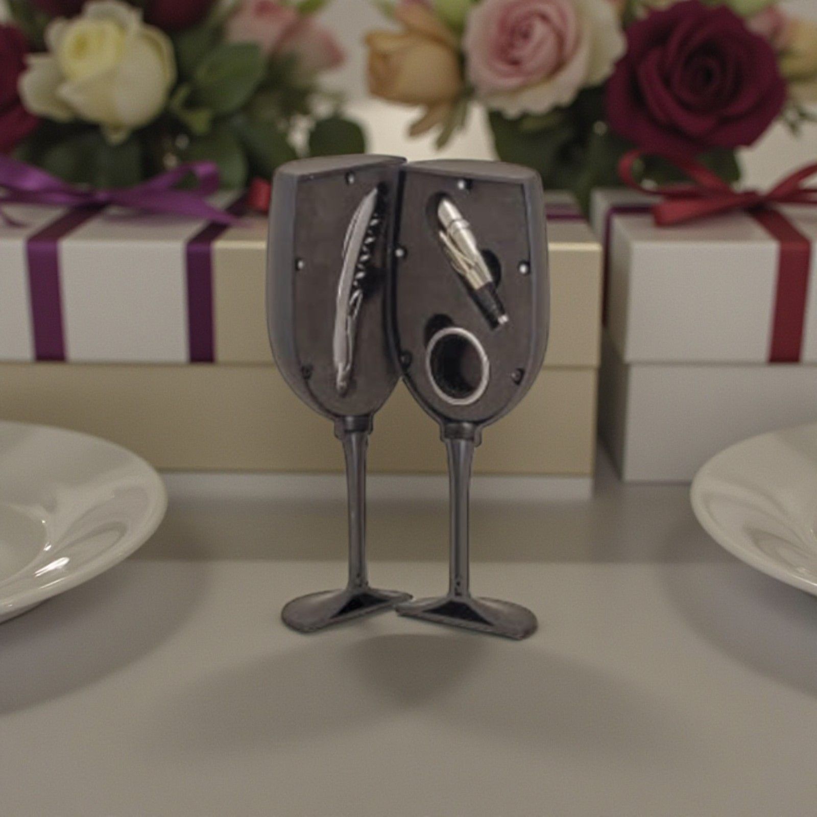 Realizzato in materiale di alta qualità e presentato in una confezione a forma di calice, questo set include un cavatappi, un anello salvagoccia e un tappo versatore, tre accessori indispensabili per ogni amante del vino. I colori nero e argento donano un tocco di eleganza, rendendolo una bomboniera originale e economica, perfetta per chi desidera lasciare un ricordo duraturo.
