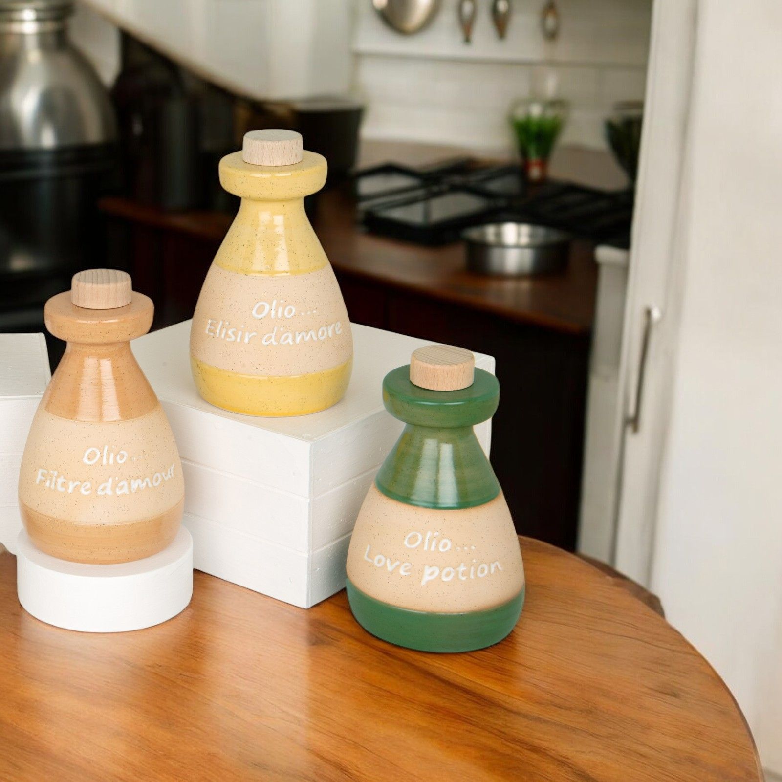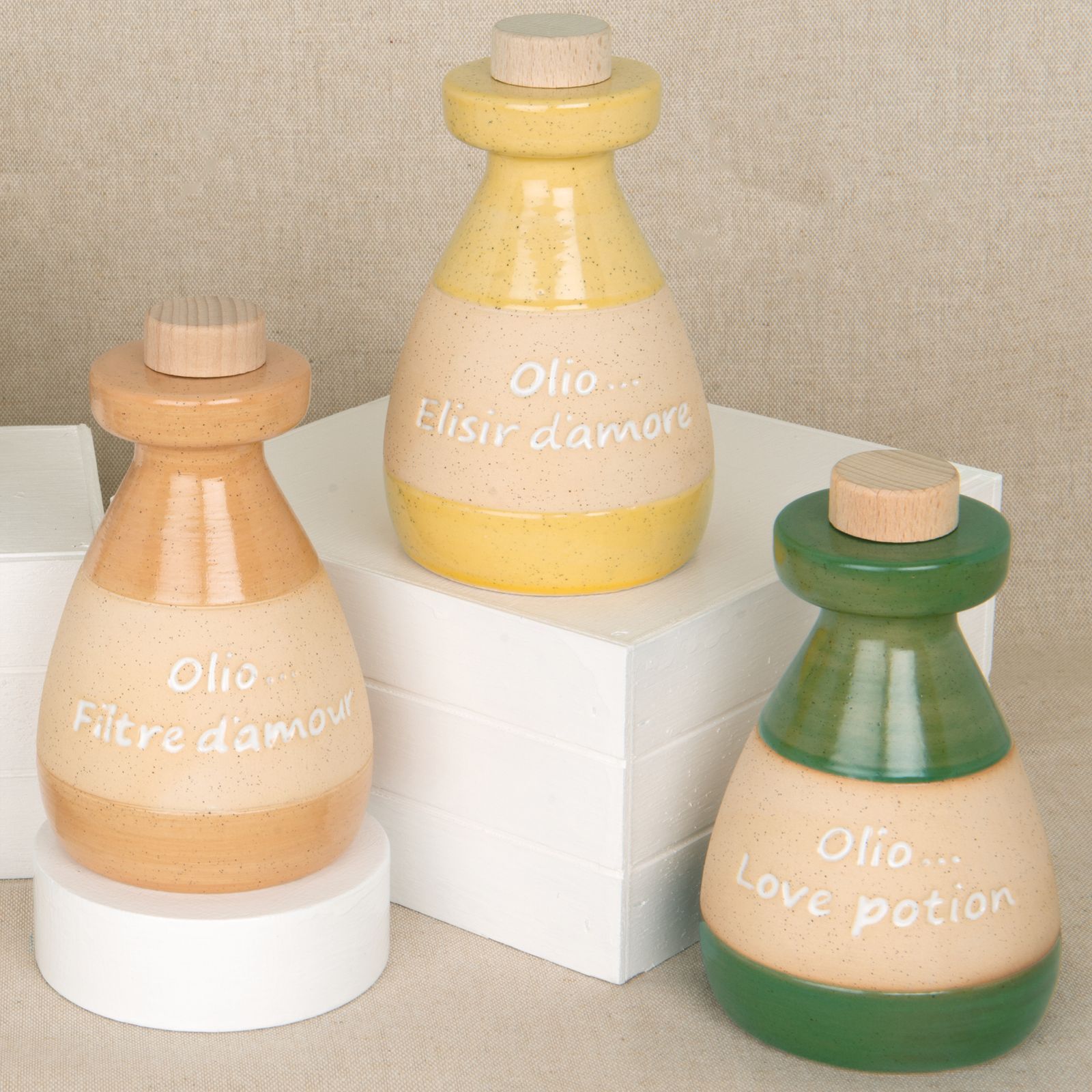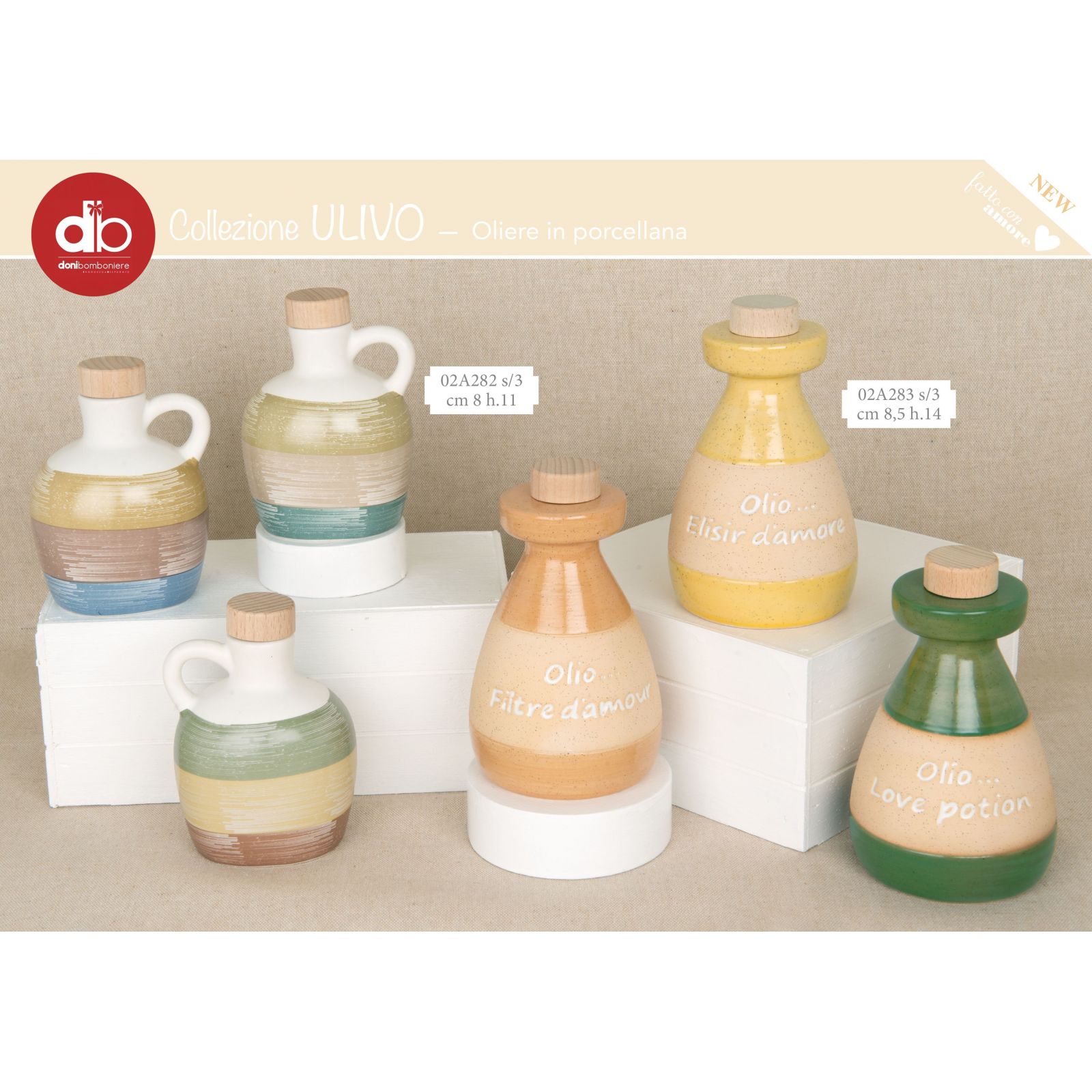 Aggiungi un tocco di raffinatezza al tuo evento con questa esclusiva oliera della collezione "Ulivo", un regalo unico e originale per i tuoi invitati. Realizzata in pregiata porcellana e dotata di tappo in legno, questa oliera combina eleganza e funzionalità. Le frasi incise, come "Olio... filtre d'amour", "Olio... elisir d'amour" e "Olio... love potion", aggiungono un tocco poetico e romantico, rendendola perfetta per qualsiasi occasione speciale.