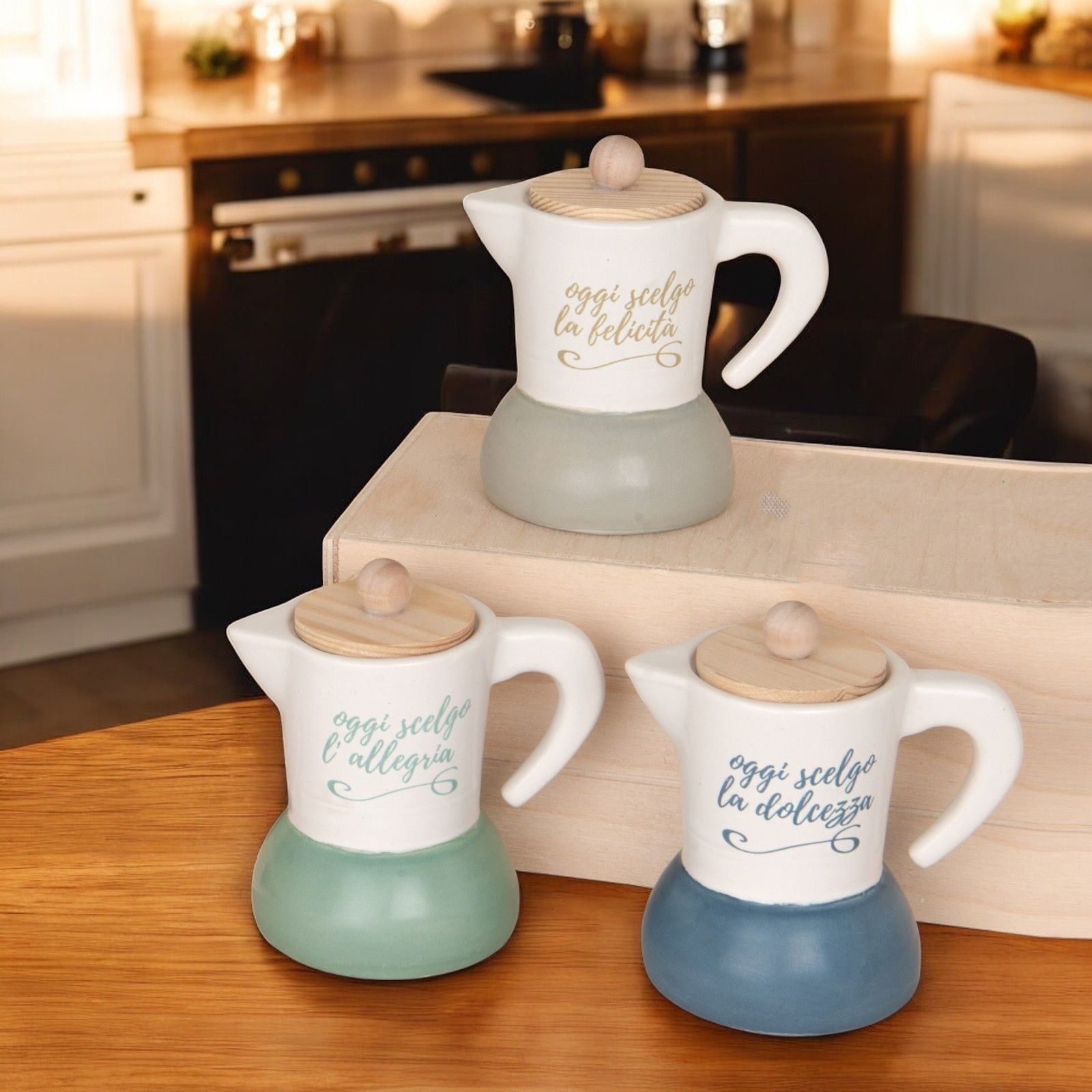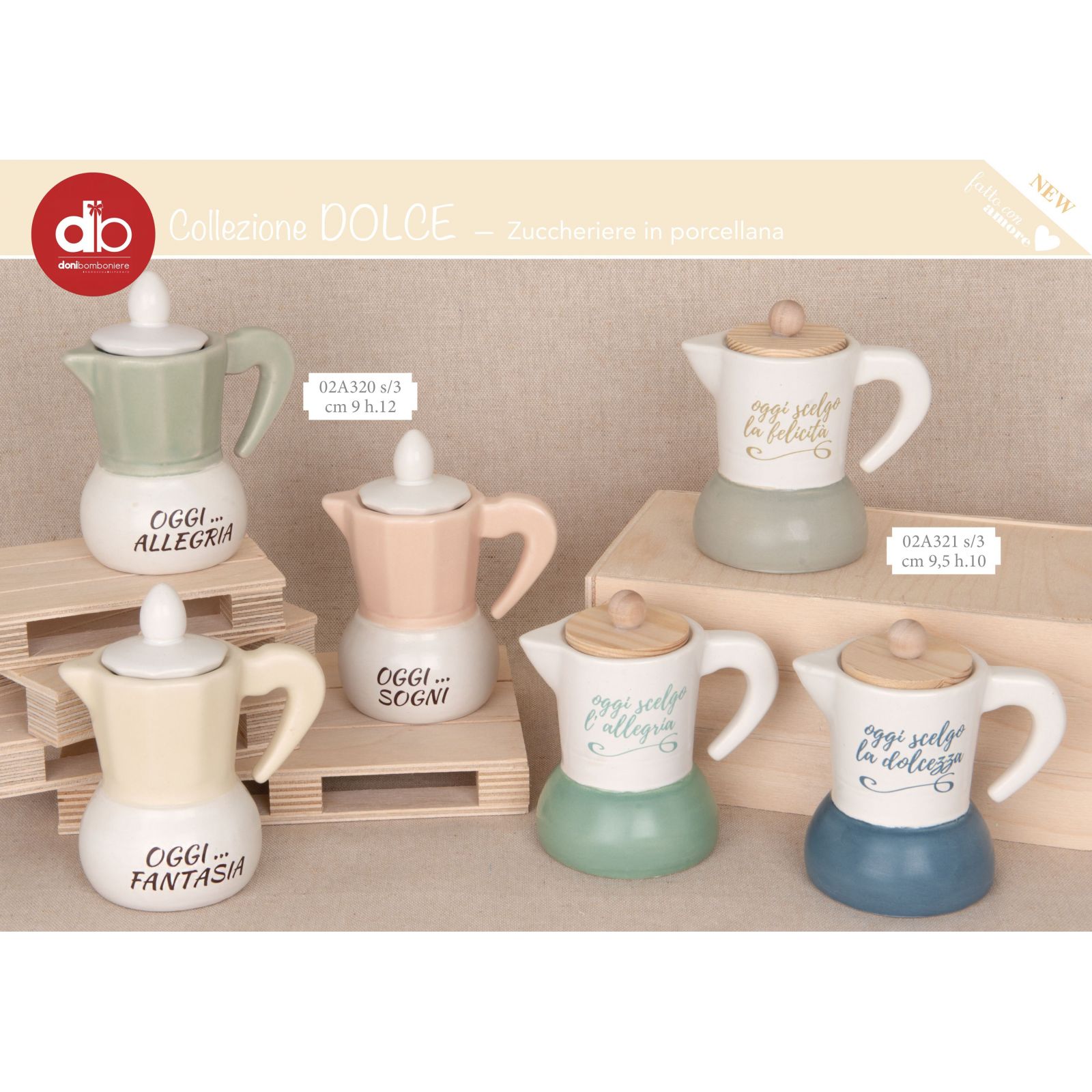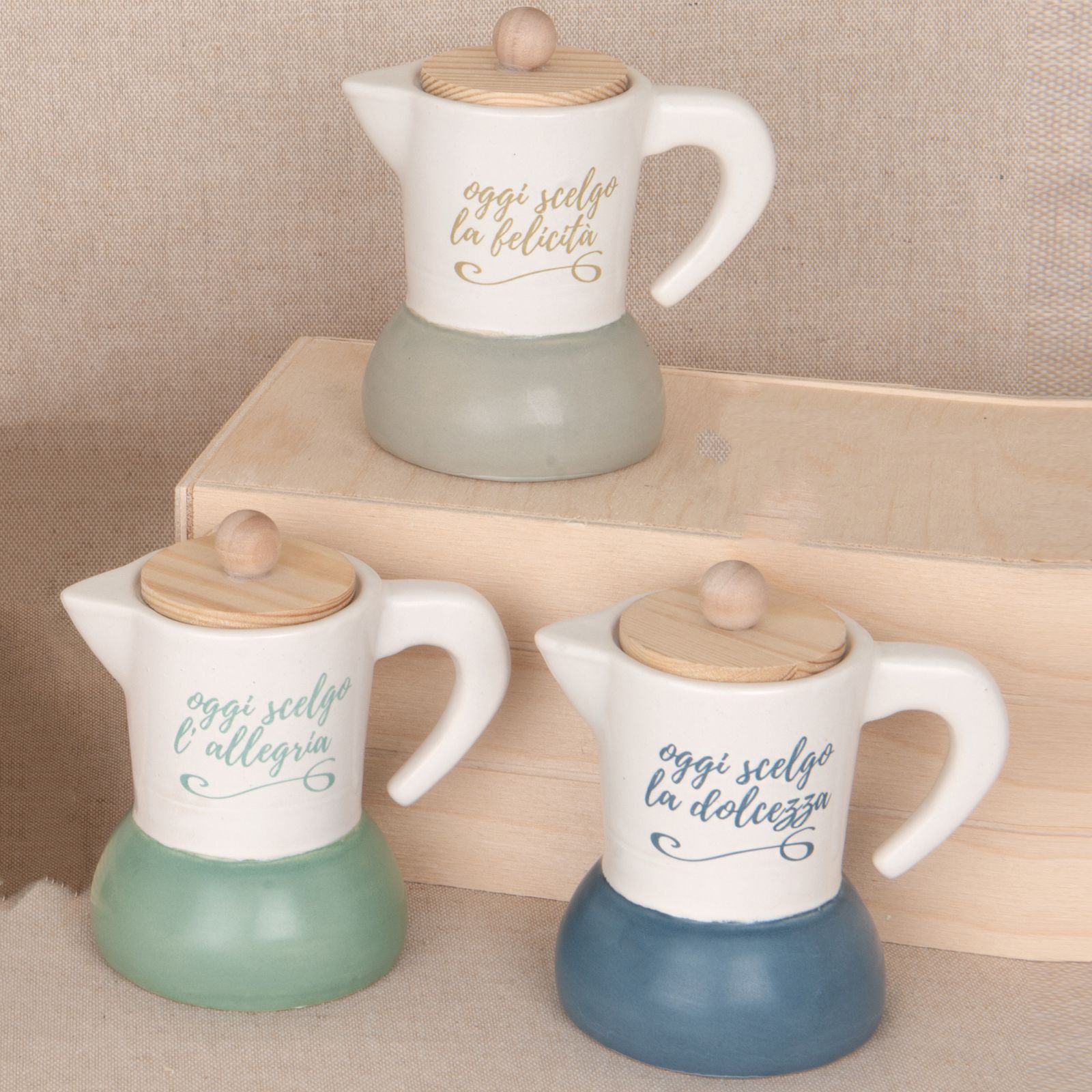 Porta un tocco di gioia alla tua festa con la nostra zuccheriera a forma di moka, dotata di coperchio in legno e frasi ispiratrici come "Oggi scelgo la felicità", "Oggi scelgo l'allegria" e "Oggi scelgo la dolcezza". È la bomboniera originale perfetta per matrimoni, anniversari, comunioni e cresime.