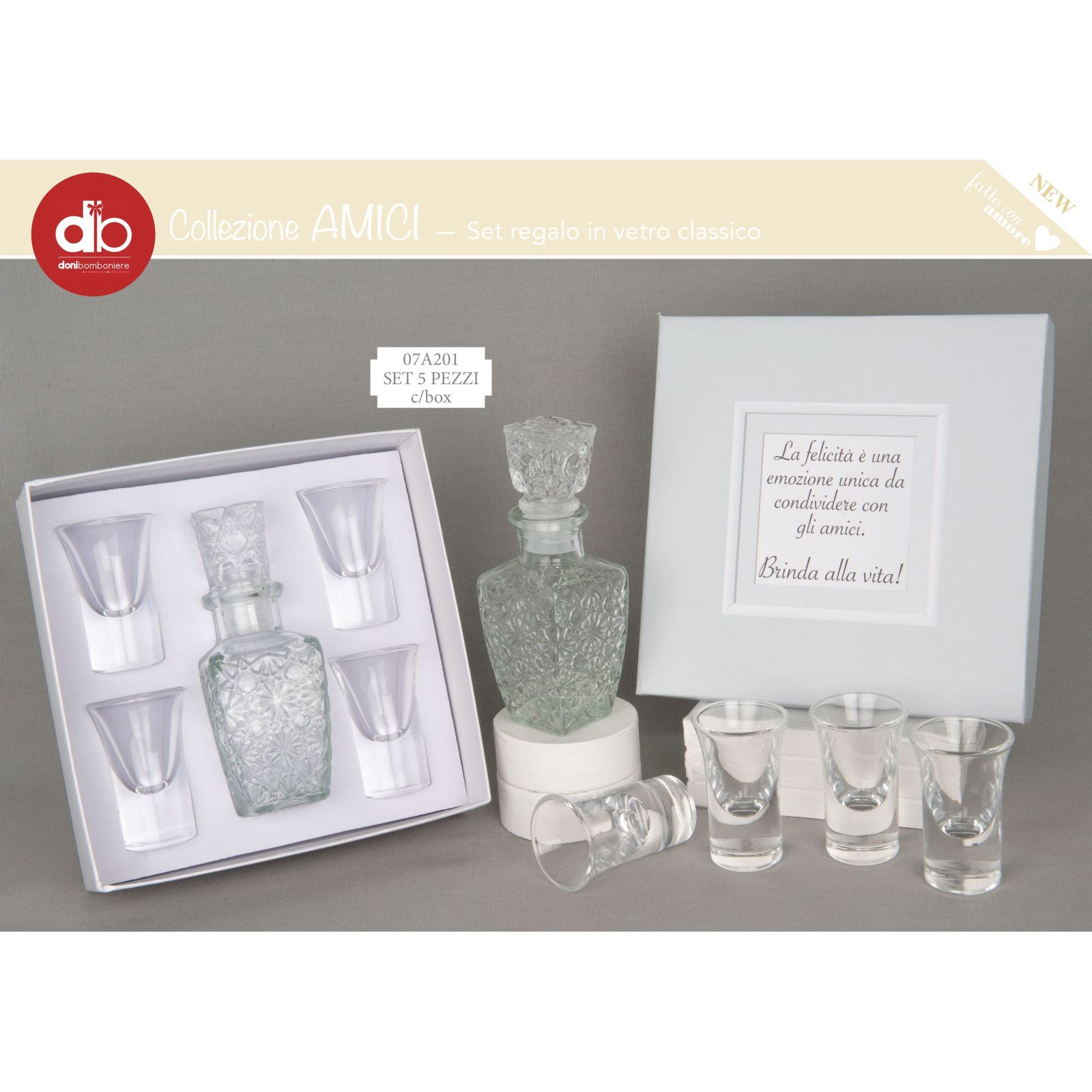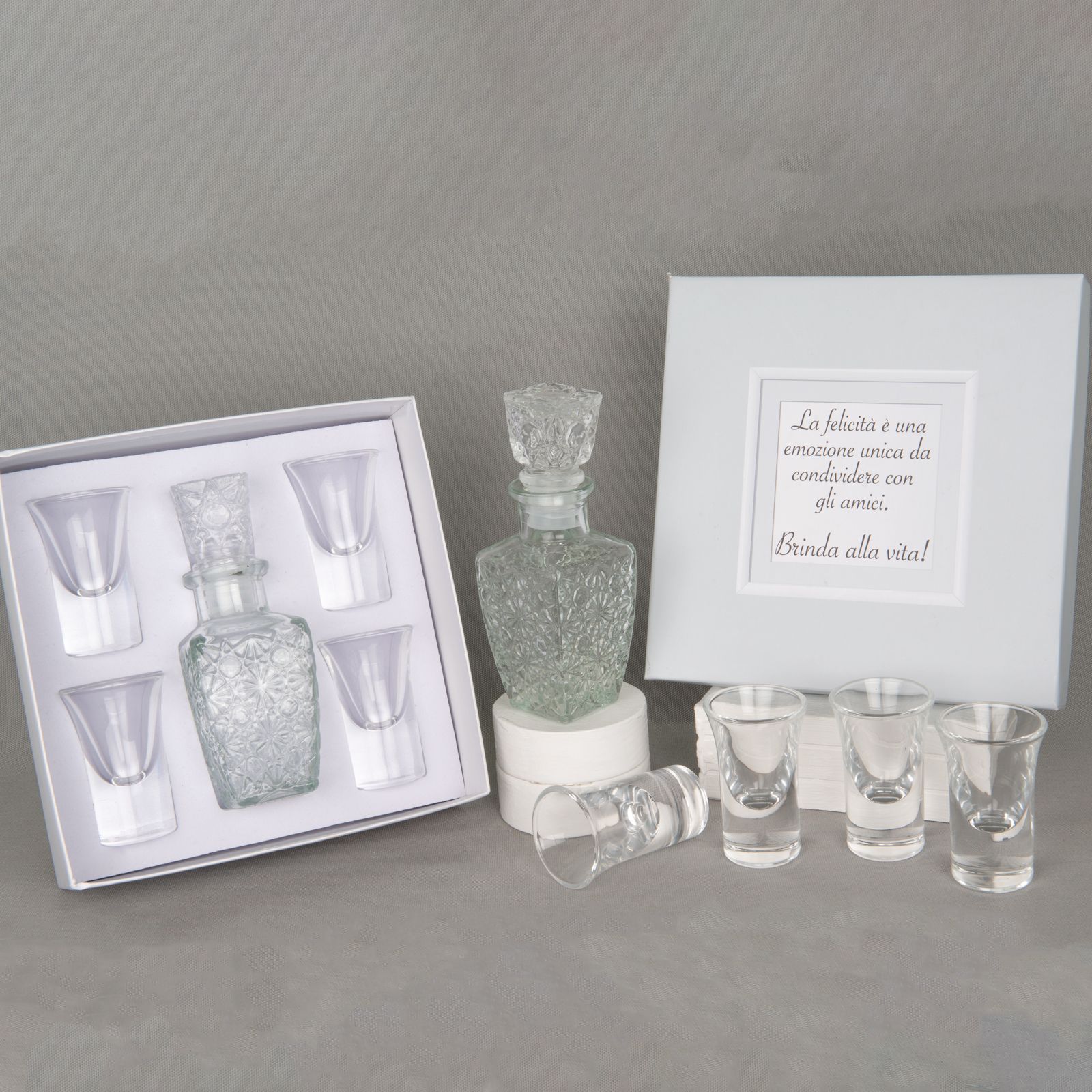 Il set comprende una mini bottiglia decorata e quattro bicchierini da liquore, realizzati in vetro di alta qualità. Questa bomboniera è perfetta per eventi speciali come matrimoni e anniversari, aggiungendo un tocco di eleganza e raffinatezza alla festa.
