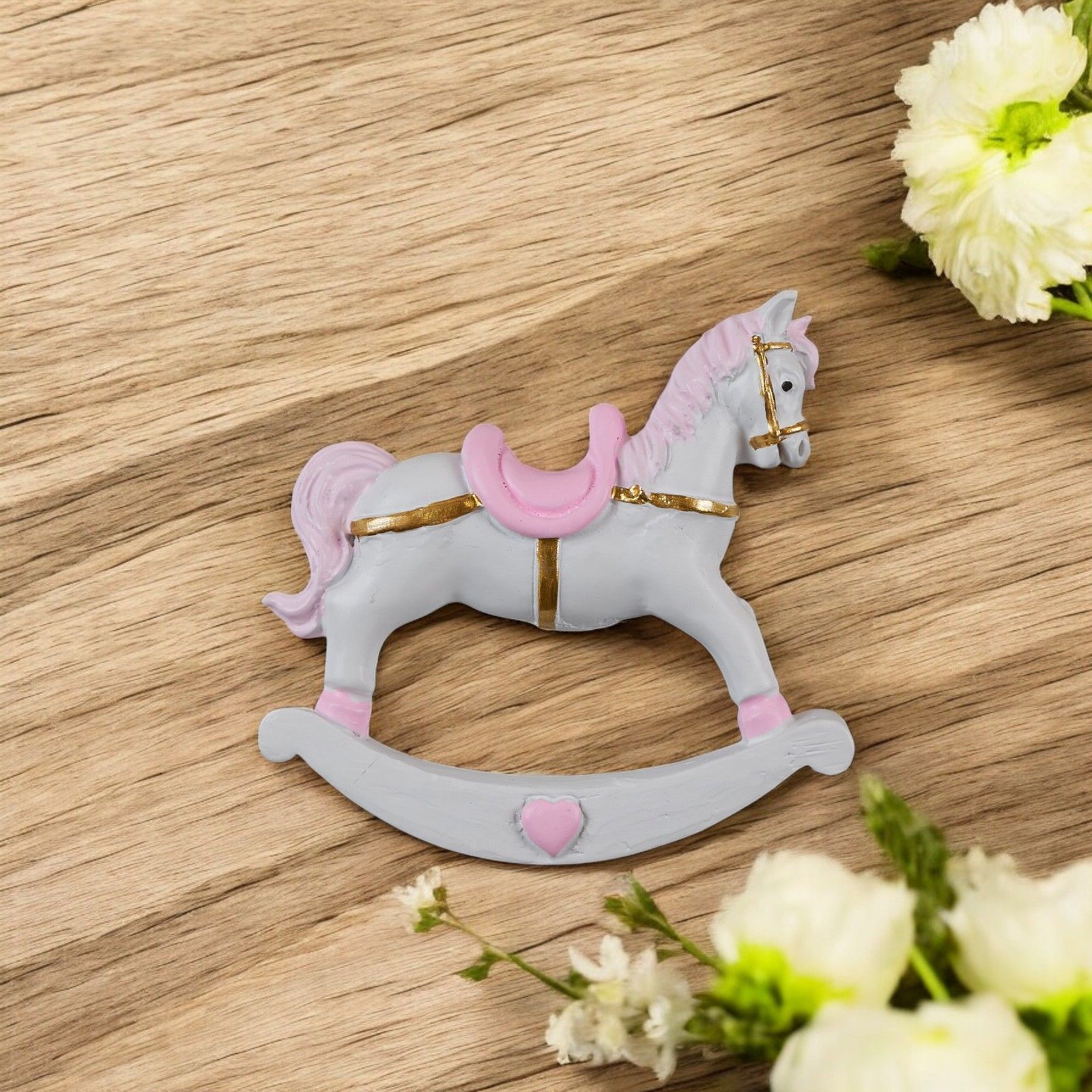 Stai cercando un regalo speciale per festeggiare la nascita della tua bimba? La nostra calamita cavalluccio a dondolo è la scelta perfetta! Realizzata in pregiata resina, questa bomboniera ha una dimensione di circa h. 5 cm ed è disponibile nei colori bianco, rosa con dettagli oro.
