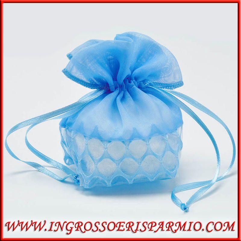 Sacchetti confetti celesti, bombati e tondi composti dalla parte superiore in tessuto morbido completamente azzurro, mentre la parte inferiore è composta da un doppio strato di tulle e tessuto traforato che rende rigida la base. I tiranti laterali permettono la chiusura semplice e veloce.