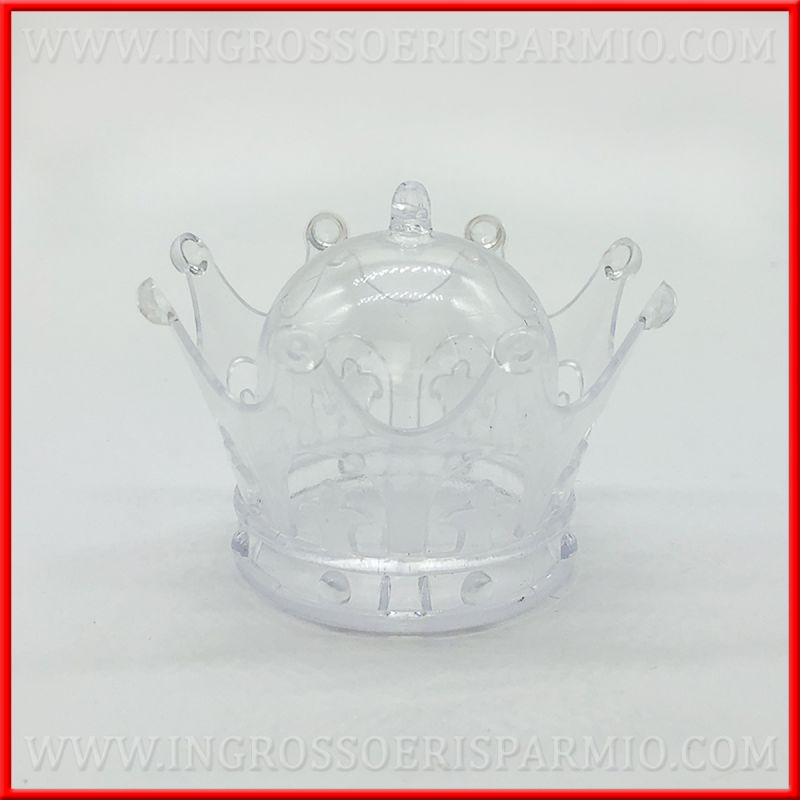Scatole portaconfetti corona realizzate in plexiglass: la parte centrale delle corone bomboniere rappresenta il contenitore per i confetti ed è apribile.