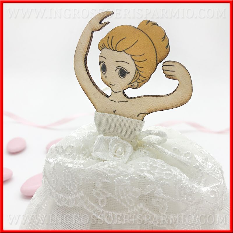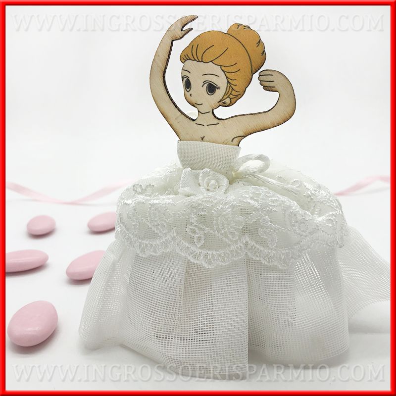 Scatoline ballerina in legno rivestine da stoffa bianca che riproduce fedelmente l'abito/tutu' bianco della danzatrice. L'abito è attentamente decorato con merletti d fiori. Il vano portaconfetti è nascosto sotto la gonna, apribile nella parte superiore.