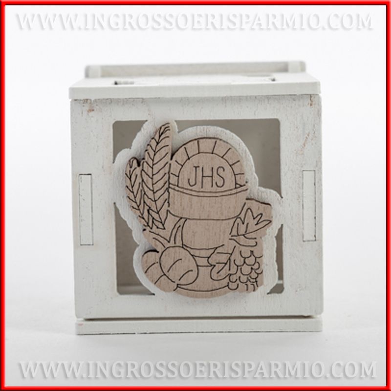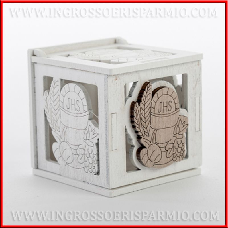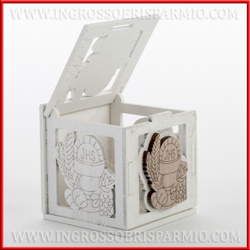 Scatoline per confetti prima comunione, realizzate in legno bianco, intagliate con immagine calice, ostia, spighe e grappolo d'uva. Nella parte frontale è applicato un ulteriore legnetto a forma di calice, color legno naturale, che mette in risalto il simbolo del sacramento della comunione.