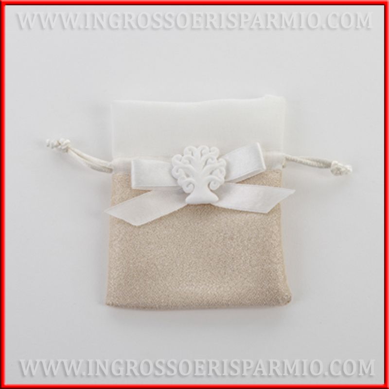 Sacchetto per confetti decorato, con parte sottostante color oro / champagne glitterato, ideale da utilizzare come portaconfetti anniversario nozze d'oro o anche per matrimonio o eventi differenti (feste tema oro). Al centro dei sacchettini c'è un fiocco in raso bianco con gessetti albero della vita. I portaconfetti sono dotati di tiranti per la chiusura.