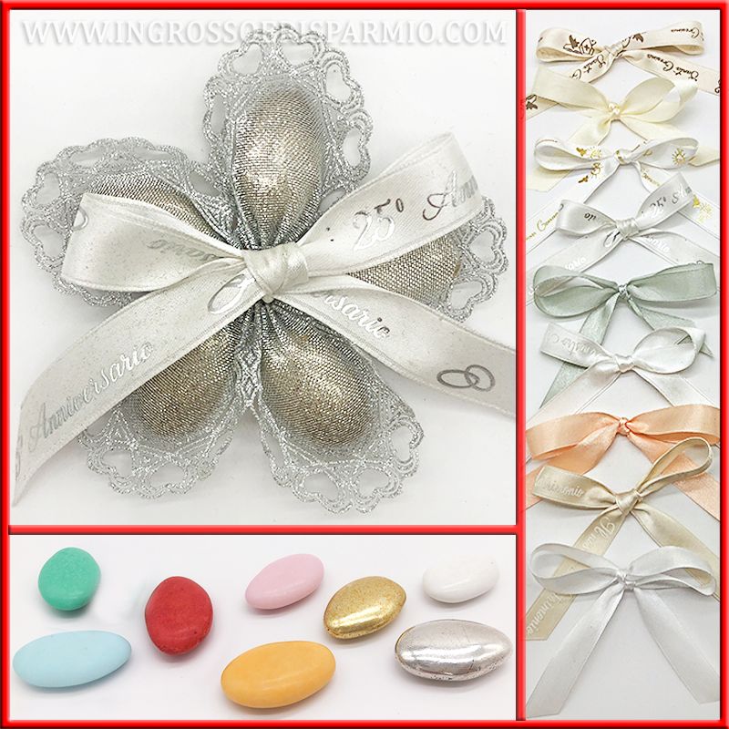 Fiore portaconfetti con 5 petali in organza argentata laminata, dall'effetto glitterato con bordini a forma di cuore. Confettata personalizzabile con FIOCCO A TUA SCELTA (anche per altri eventi, non solo per 25° anniversario).