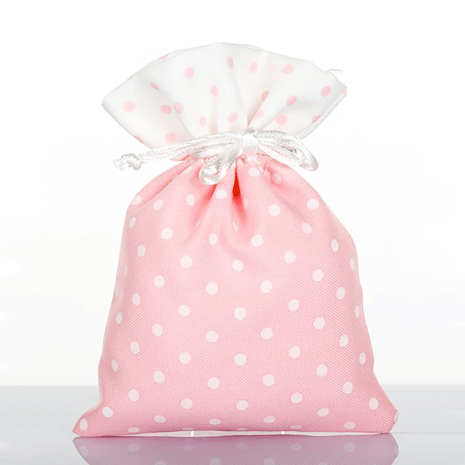 Sacchetti confetti con cordoncini tiranti incorporati, in tessuto cotone rosa, con pois bianchi e sfondo rosa nella parte inferiore, superiormente pois rosa e base bianca.