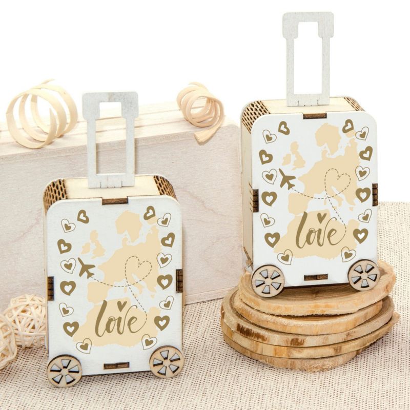 Mini valigie in legno per confetti, di colore bianco con continenti raffigurati sullo sfondo, scritta "Love" tracciata con la scia dell'aereo e cuoricini. Complete di ruote e manico, queste scatoline per confetti a forma valigia saranno perfette per realizzare una confettata matrimonio molto originale.