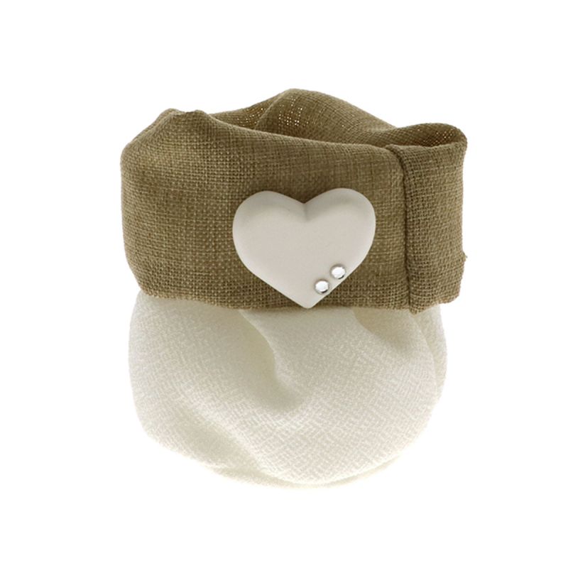 Questo articolo è realizzato in cotone, in due colori: nella parte inferiore in bianco ed in quella superiore in un delicato color tortora con una tramatura simile alla juta. Il tutto è completato da una fine applicazione a forma di cuore in resina sormontata da due strass. Il sacchetto è fornito di pratici tiranti di chiusura.