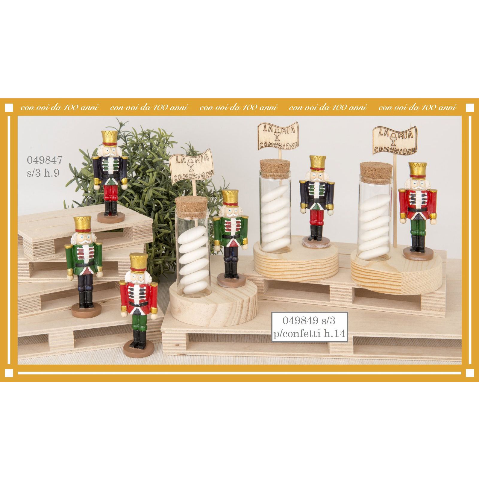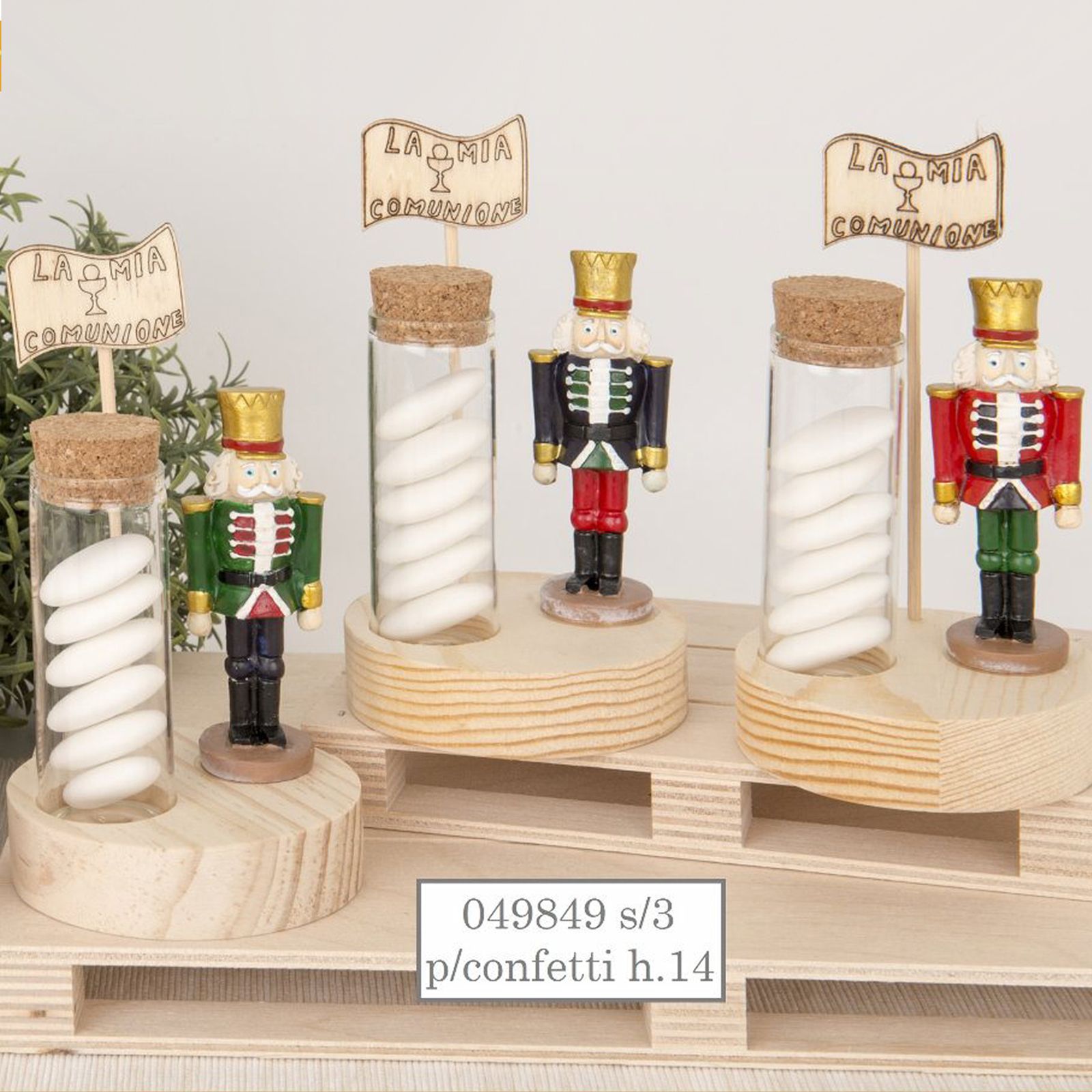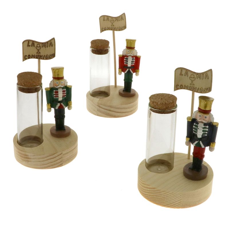 Eccoti un articolo esclusivo! I nostri soldatini schiaccianoci in resina in tre colori assortiti (non è possibile scegliere la variante di colore) con base circolare in legno e tubo in vetro e tappo in sughero. Alle spalle del soldatino è posta un asta con una bandierina anch'essa in legno con la scritta "La mia comunione" e il simbolo dell'Eucarestia.
