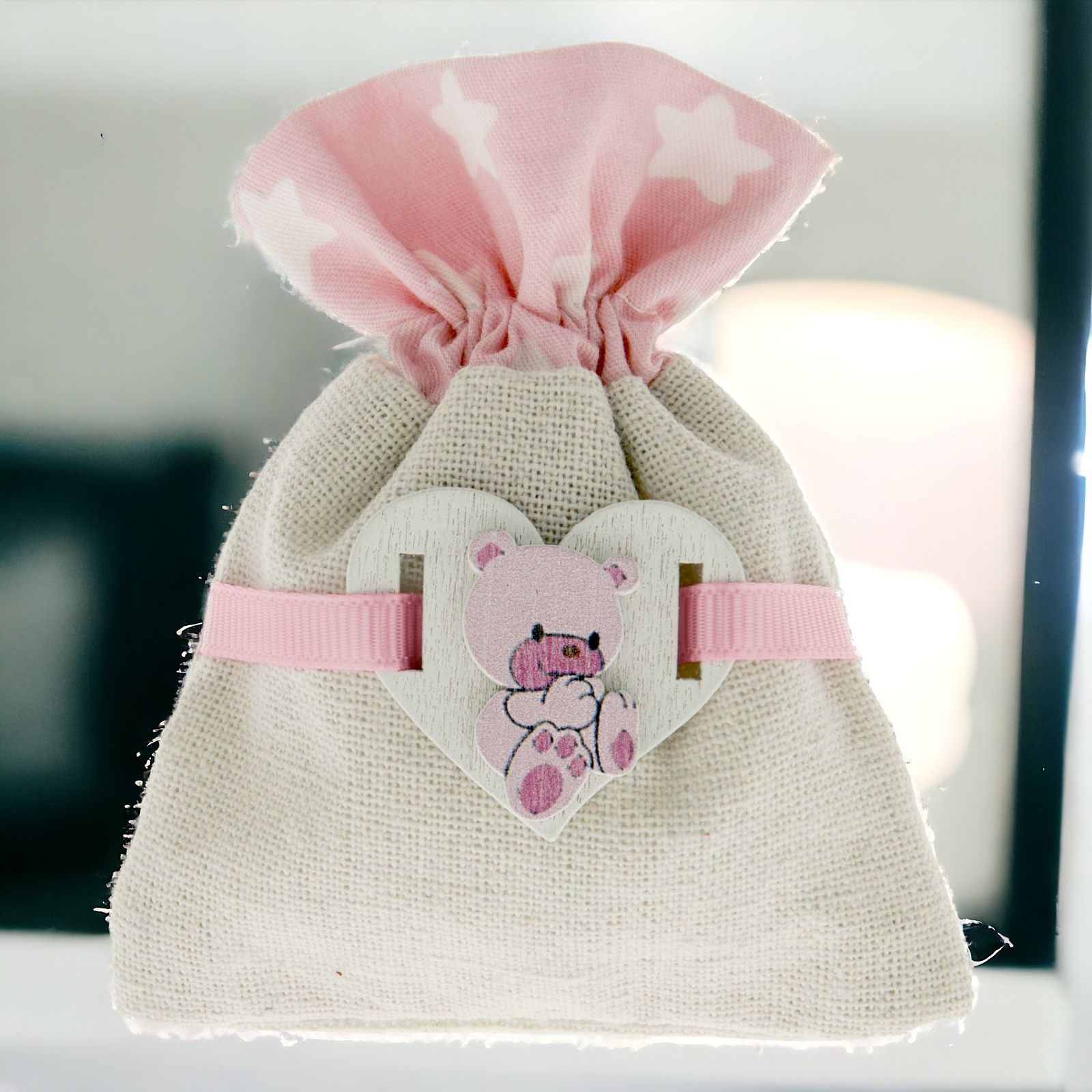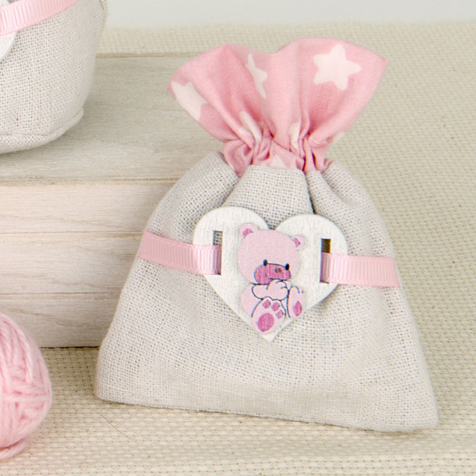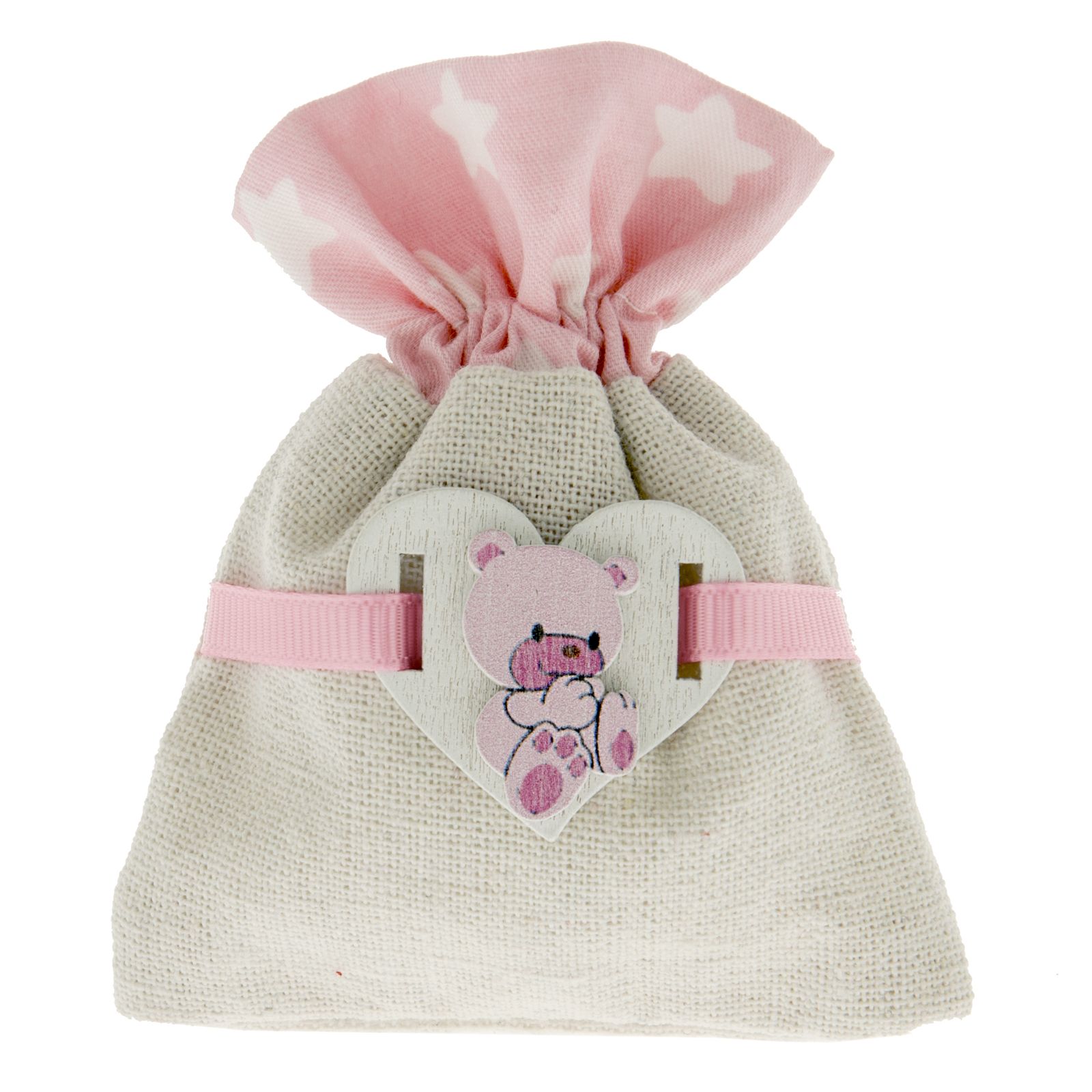 Sacchetti in tessuto misto con parte superiore con decoro rosa con piccole stelle e parte inferiore in simil-iuta. Sulla parte centrale è applicato un piccolo cuore in legno rosa con raffigurato un tenero orsetto.