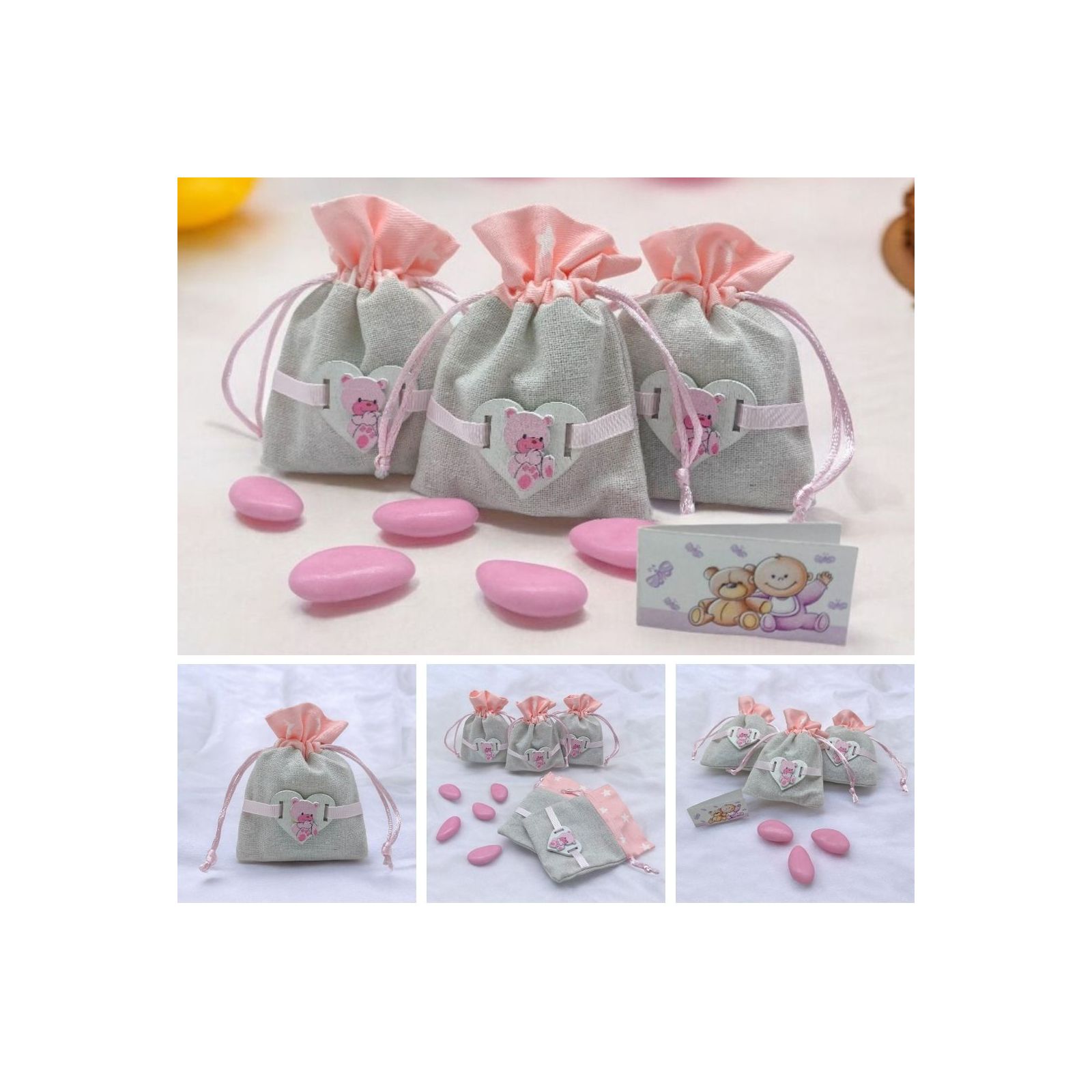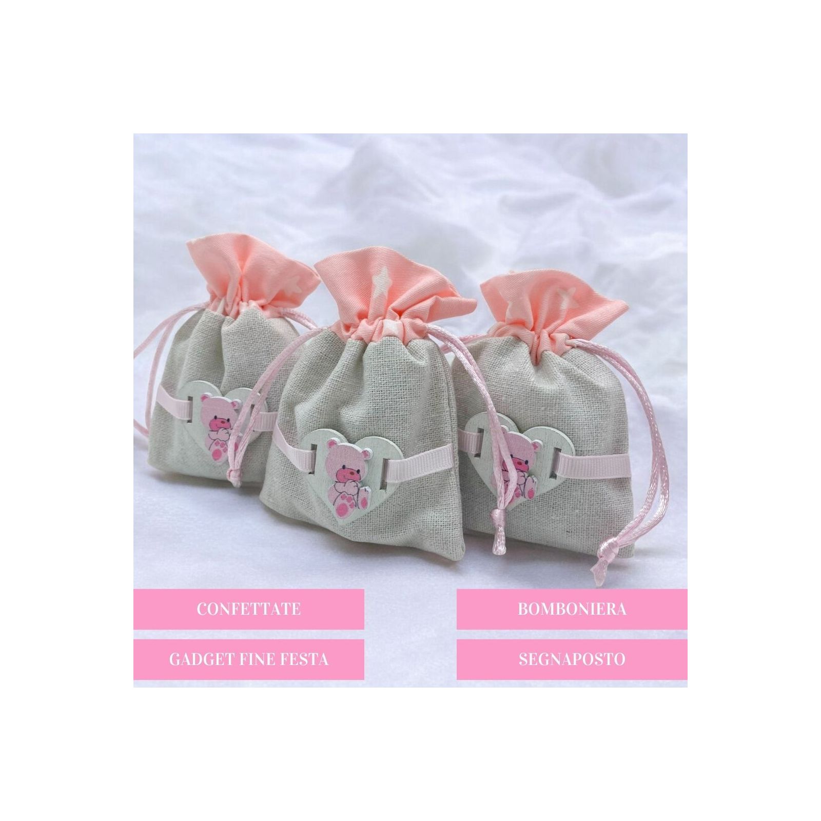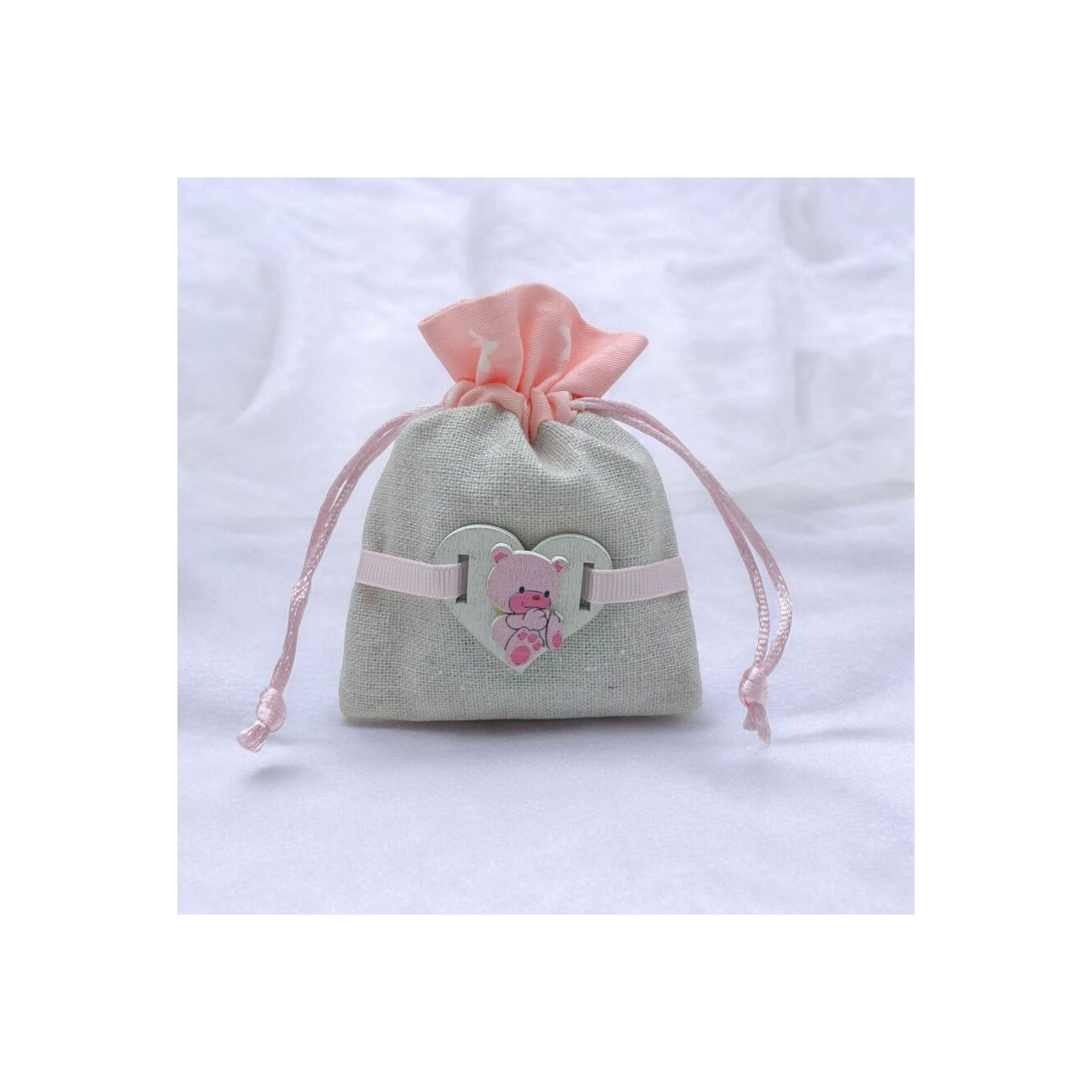 Sacchetti in tessuto misto con parte superiore con decoro rosa con piccole stelle e parte inferiore in simil-iuta. Sulla parte centrale è applicato un piccolo cuore in legno rosa con raffigurato un tenero orsetto.
