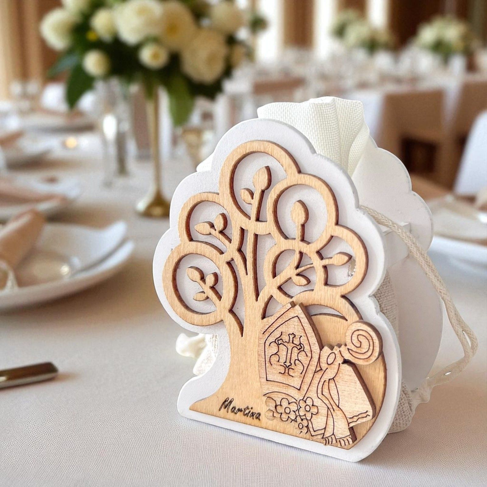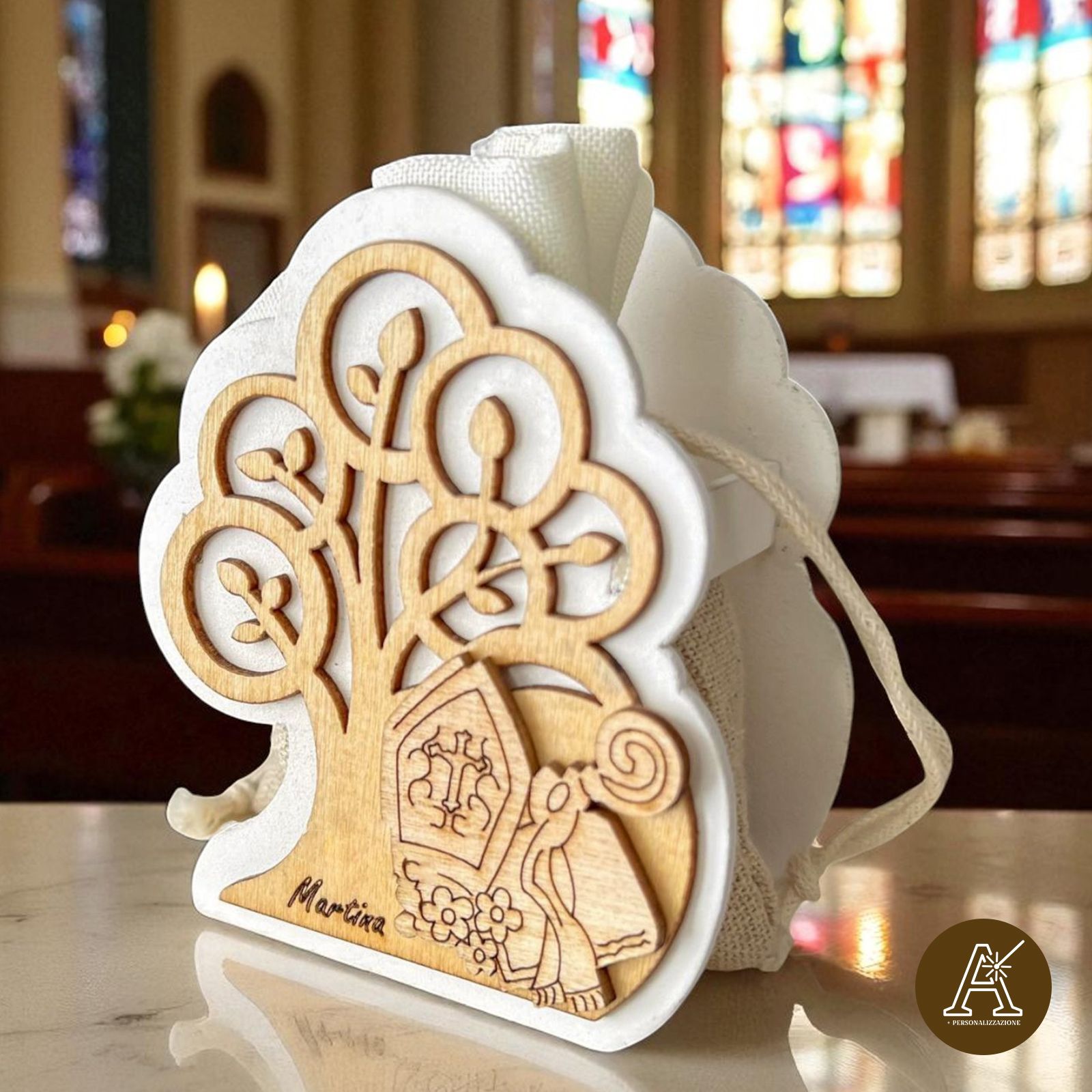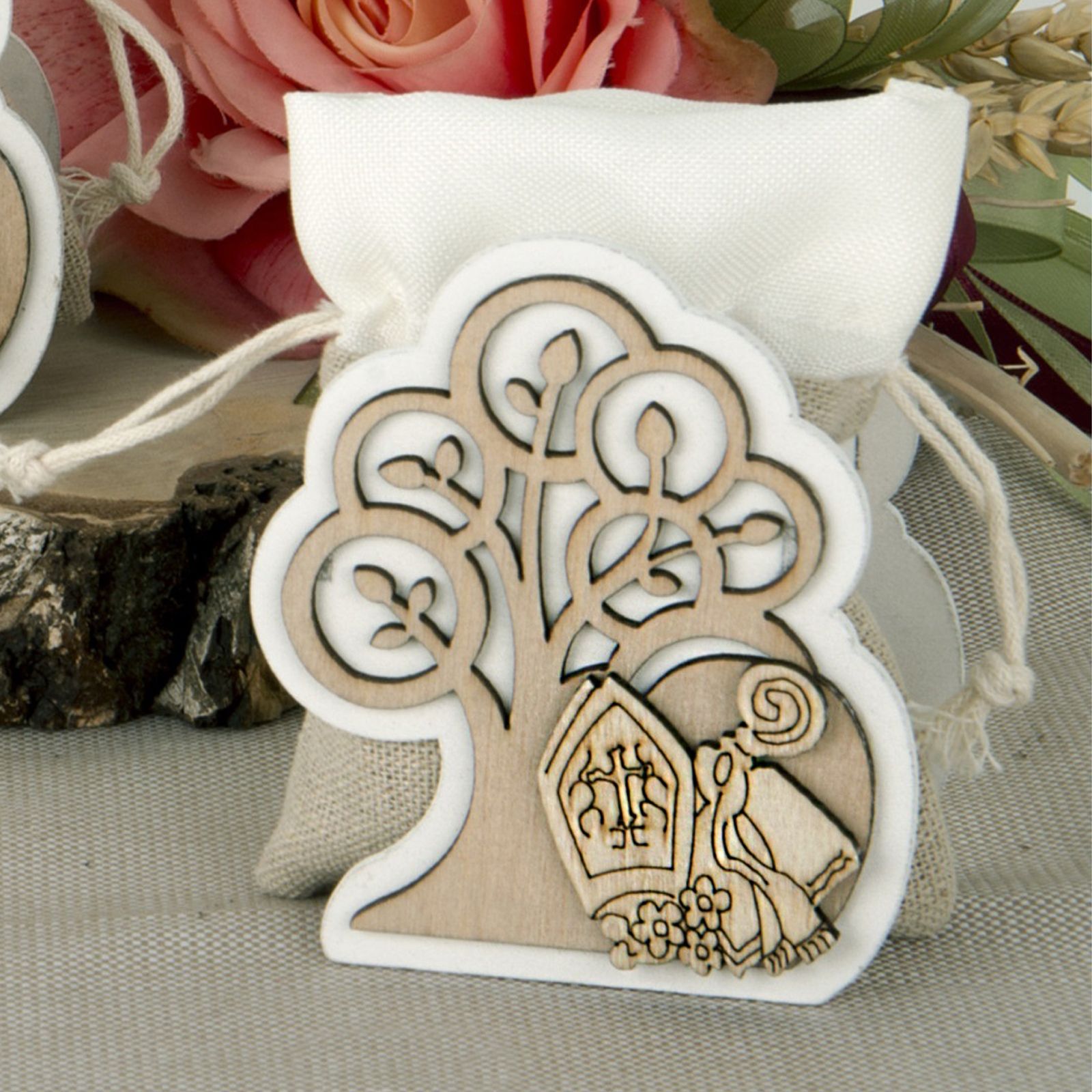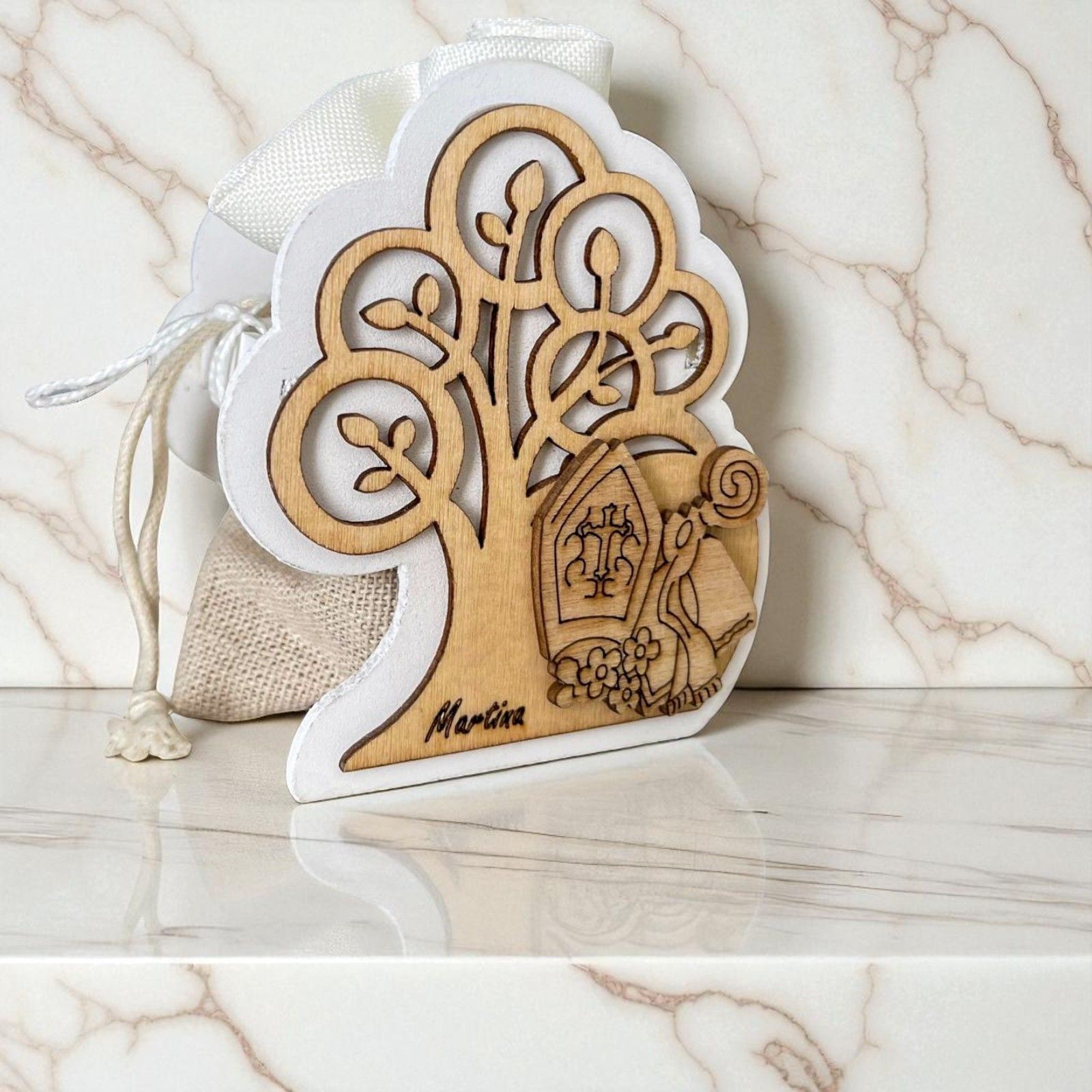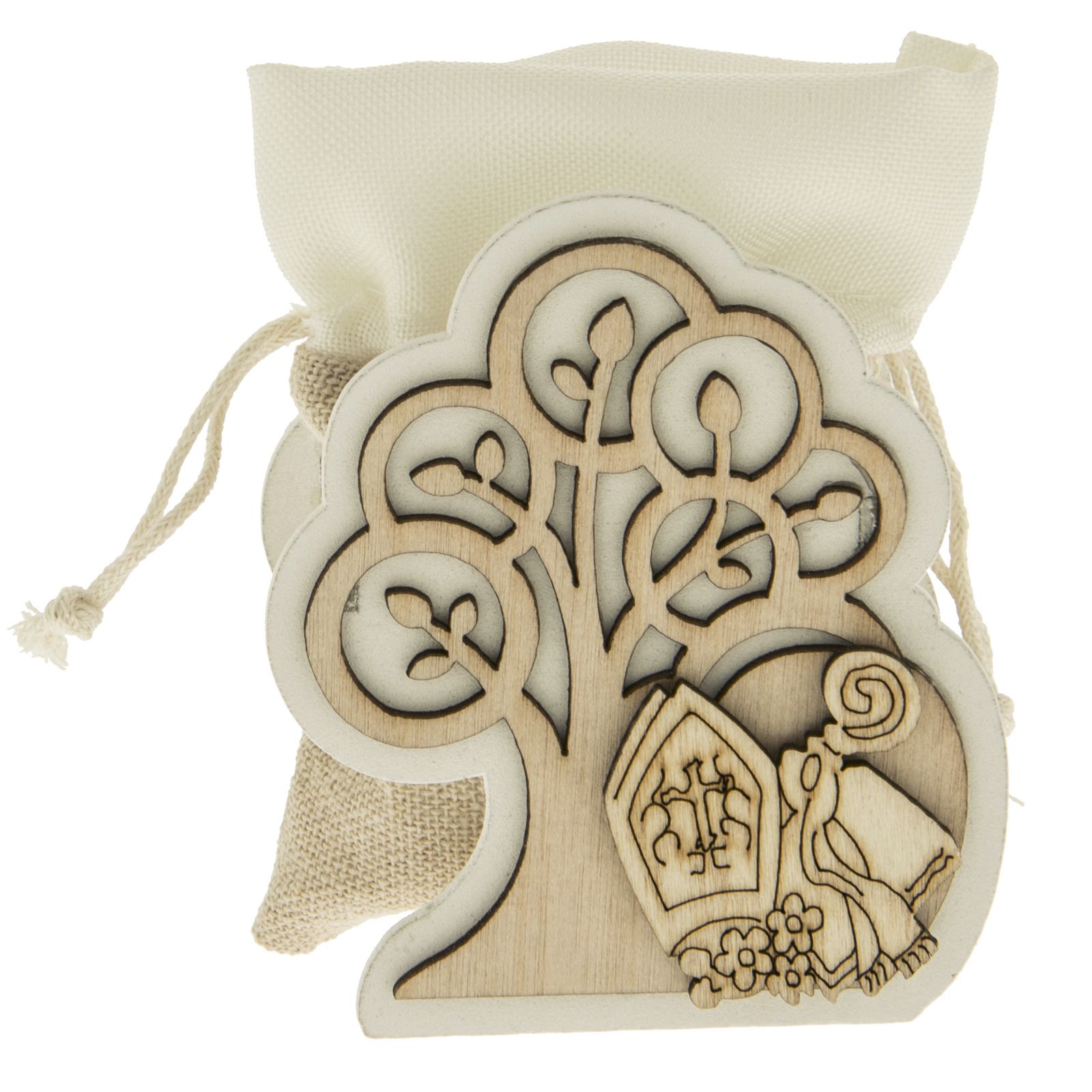 Scatolina aperta in legno naturale con raffigurazione dell'albero della vita e alla base i simboli sacri della Cresima: bibbia, pastorale e mitra. All'interno troverai un pratico sacchetto in iuta e cotone per contenere i confetti.