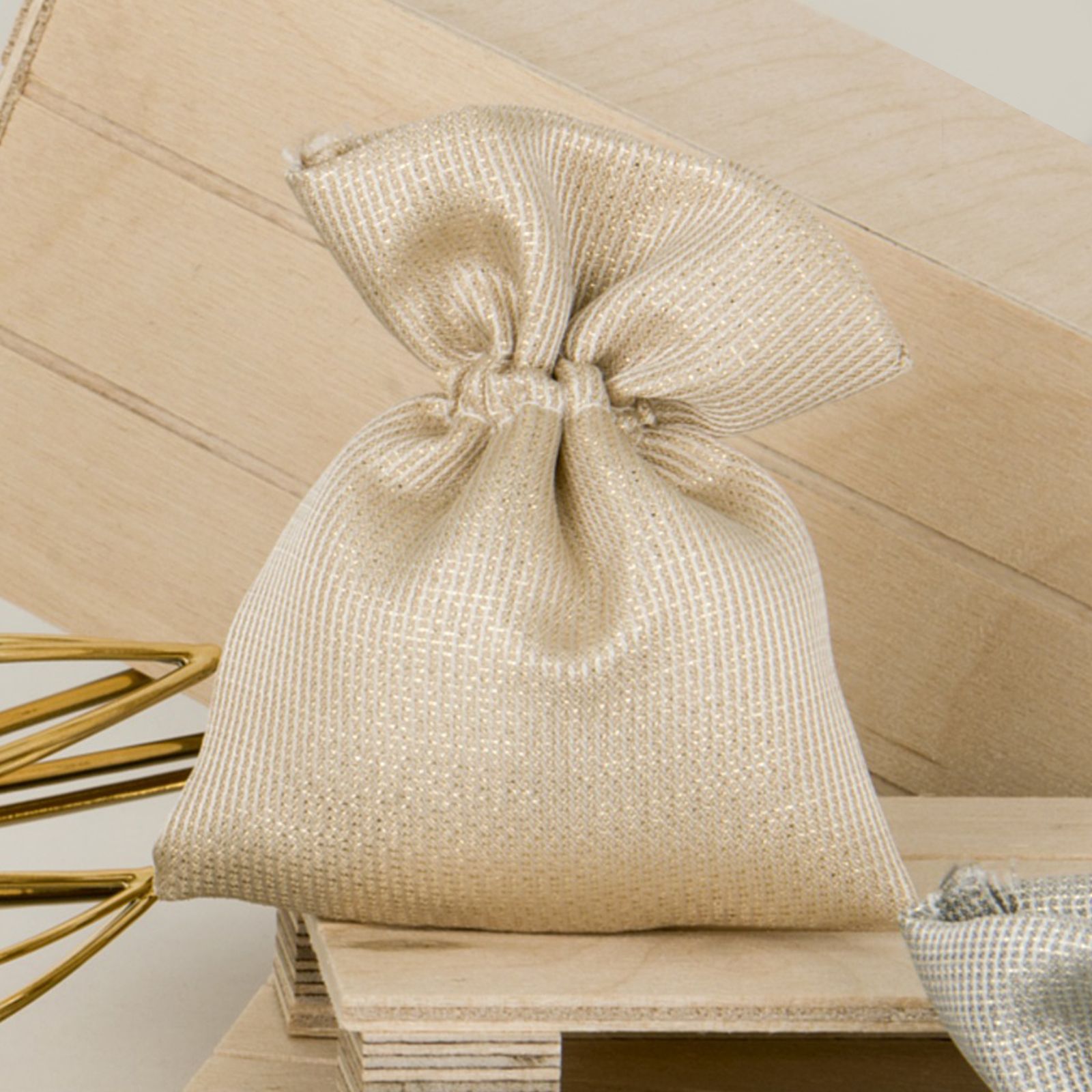 Ti presentiamo i nostri sacchetti porta confetti color oro, semplici ed eleganti, con tiranti di chiusura e tramatura rigata.