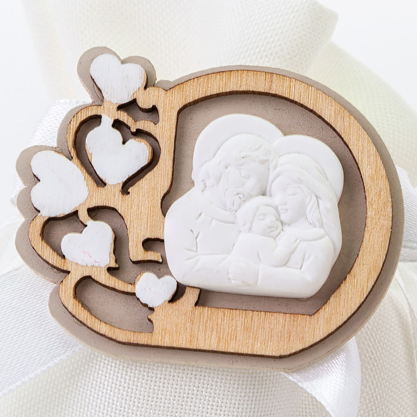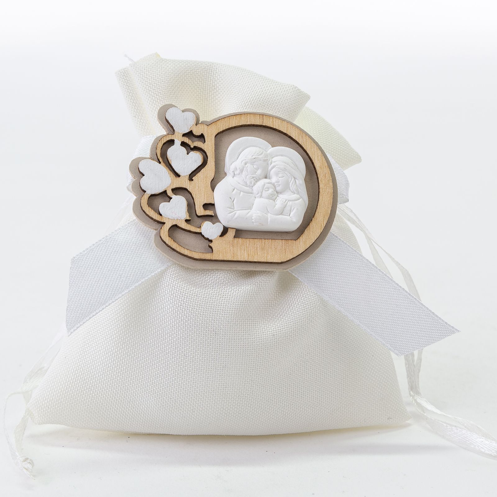 Sacchettino in cotone bianco, con fiocco in raso e cordoncini di chiusura in tinta con applicazione in legno naturale con cuoricini su cui è posto un gessetto bianco raffigurante la Sacra Famiglia.