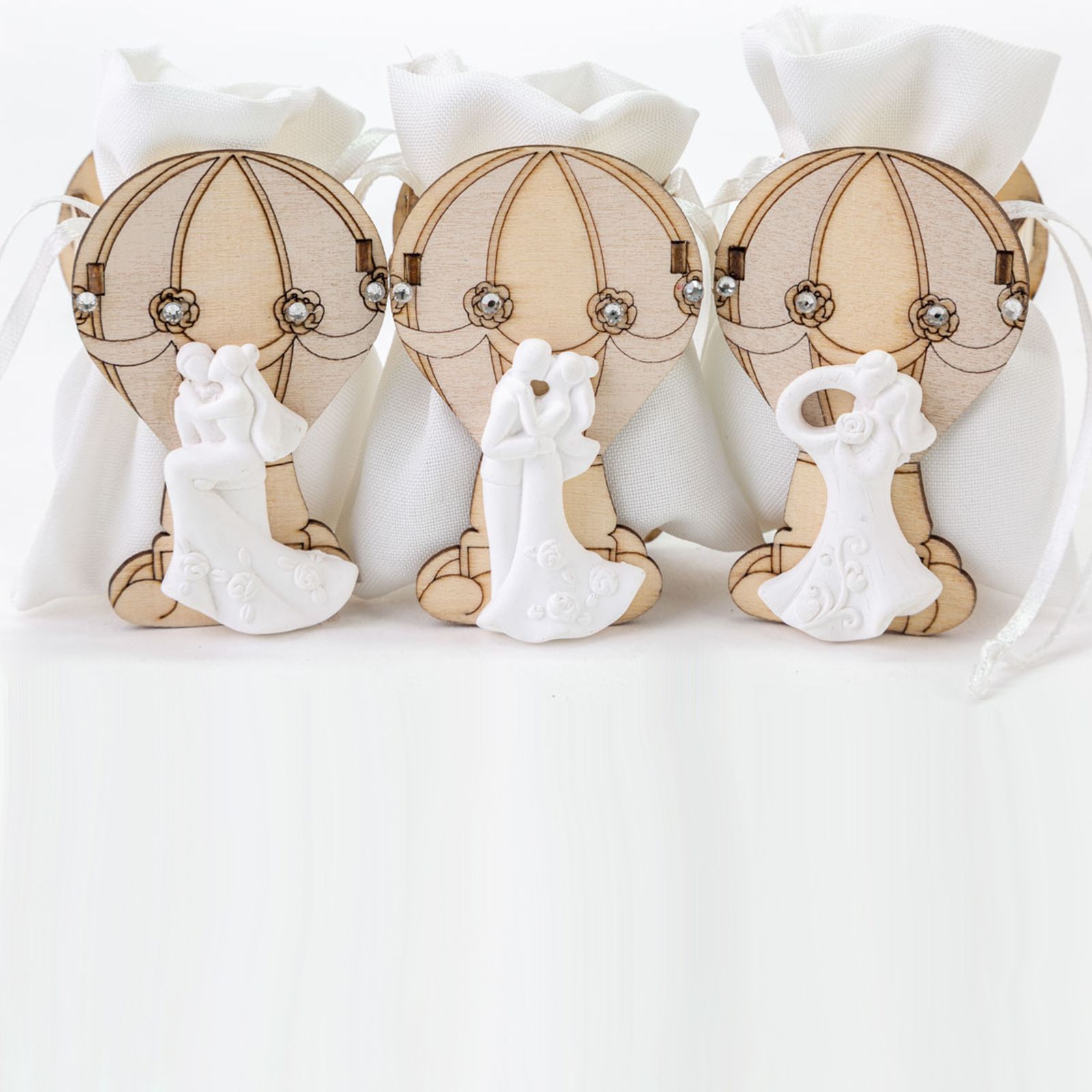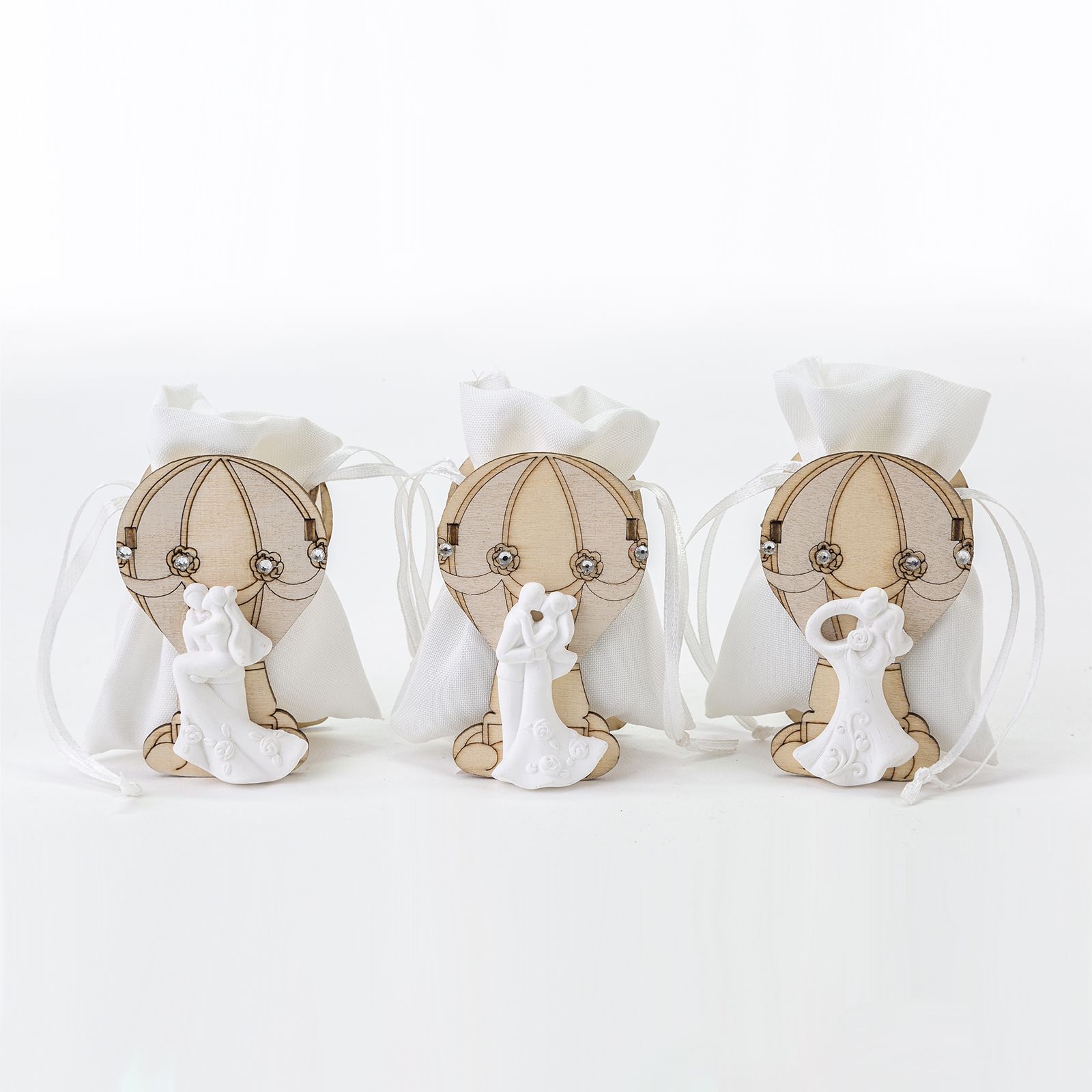 Scegli queste graziose scatoline portaconfetti in legno con la raffigurazione di una bellissima mongolfiera con particolari strass e in primo piano una coppia di sposini novelli ritratta in tre pose differenti ed assortite (in fase di ordine non è possibile sceglierne di una sola tipologia). All'interno della scatolina, troviamo il sacchettino bianco in cotone con pratici tiranti di chiusura.
