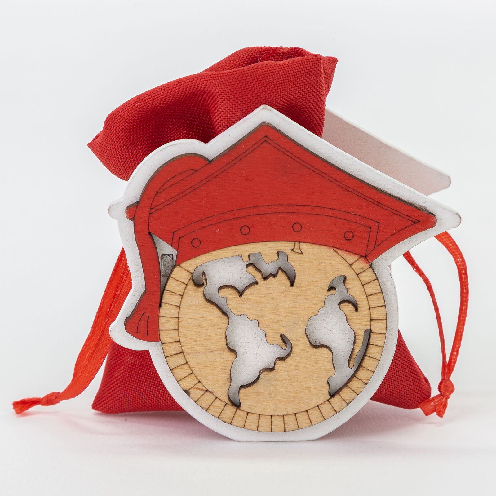 Scegli ad esempio le nostre scatoline per confetti in legno raffiguranti un mappamondo in tonalità naturale con un grande tocco rosso al cui interno è collocato il sacchetto in cotone rosso con cordoncini in raso.