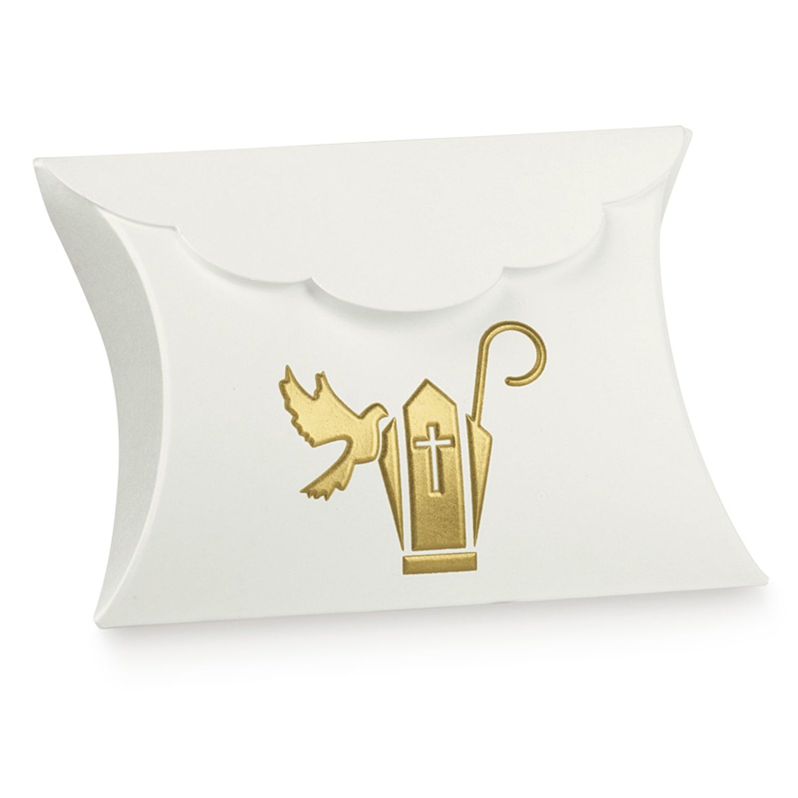 Per te abbiamo selezionato queste scatoline portaconfetti in cartoncino con aperture laterali e frontale decorato a bustina con serigrafia sbalzata dorata raffigurante i simboli sacri della Cresima: mitra (cappello del Vescovo), pastorale (bastone) e la colomba, simboleggiante lo Spirito Santo che discende sul cresimando.