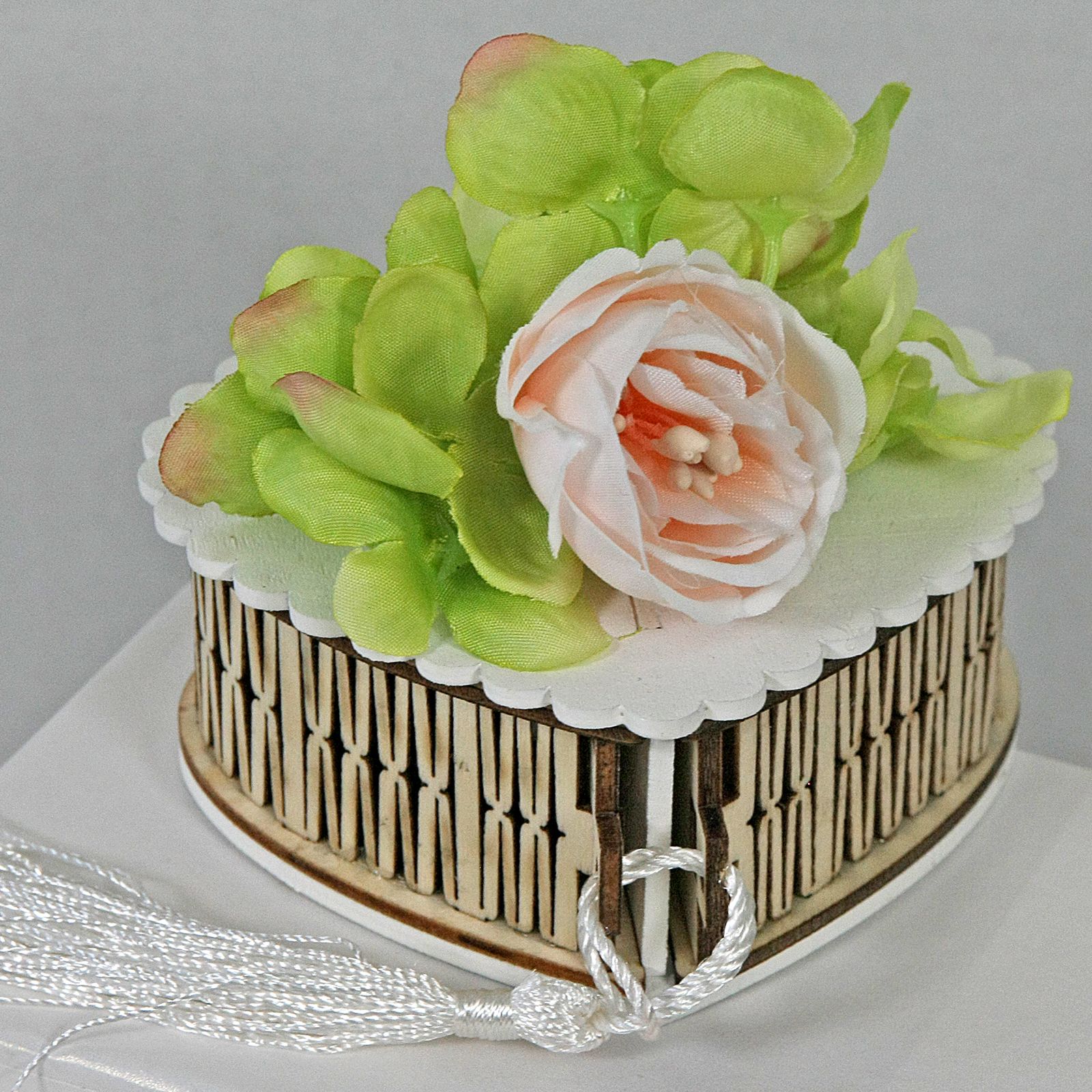 Per te disponibili le nostre scatoline portaconfetti in legno naturalea forma di cuore, con applicazione di fiori artificiali colorati, con aperture laterali con nastrini per permettere l'inserimento dei confetti.