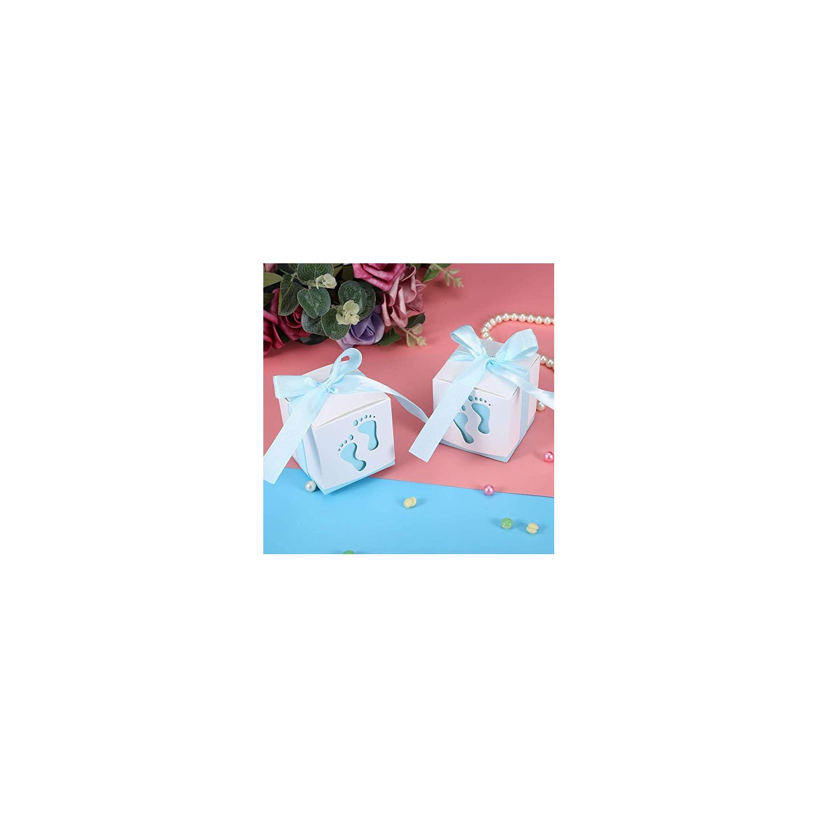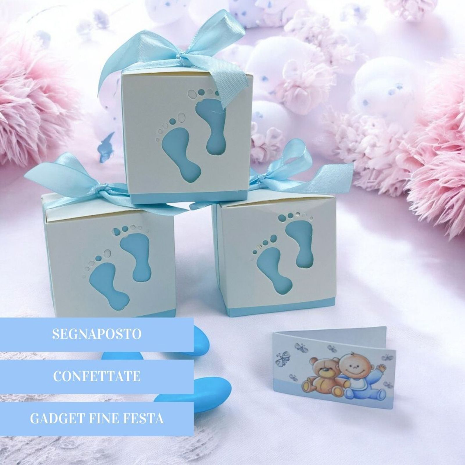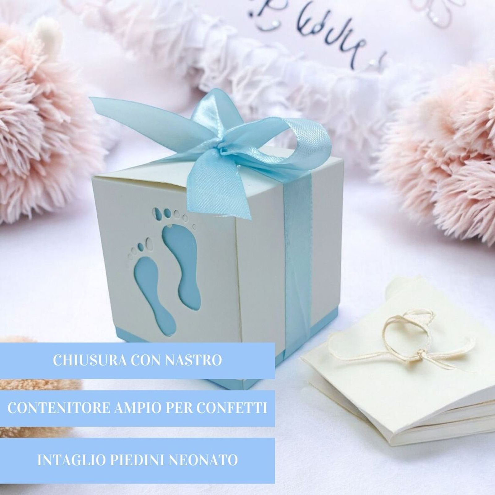 Solo per te disponibili queste originalissime scatolette cubiche per confetti bianche e celesti con delle simpatiche impronte di piedini traforate su due lati; le scatoline sono ad incastro, con la parte celeste che chiude e si sovrappone a quella bianca.