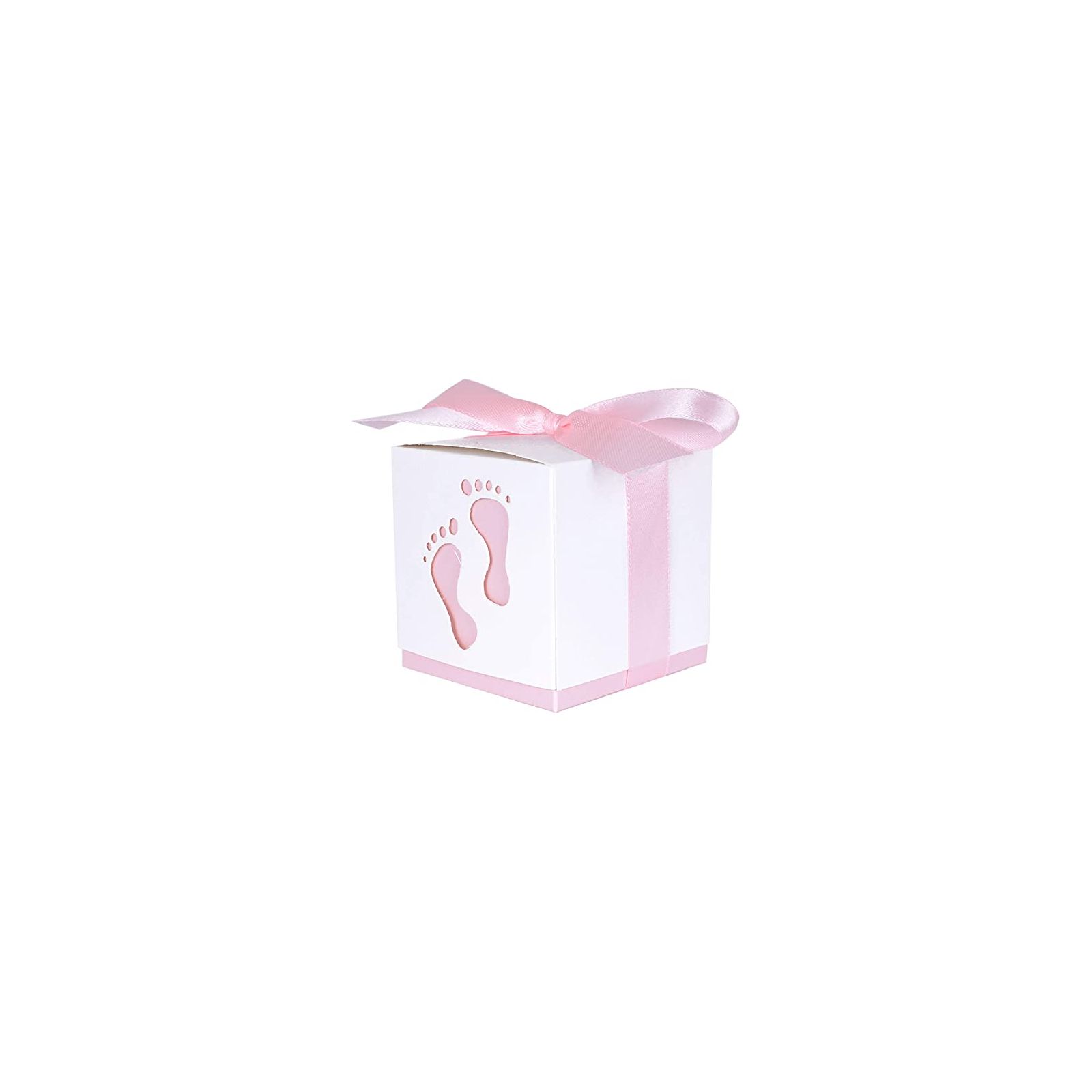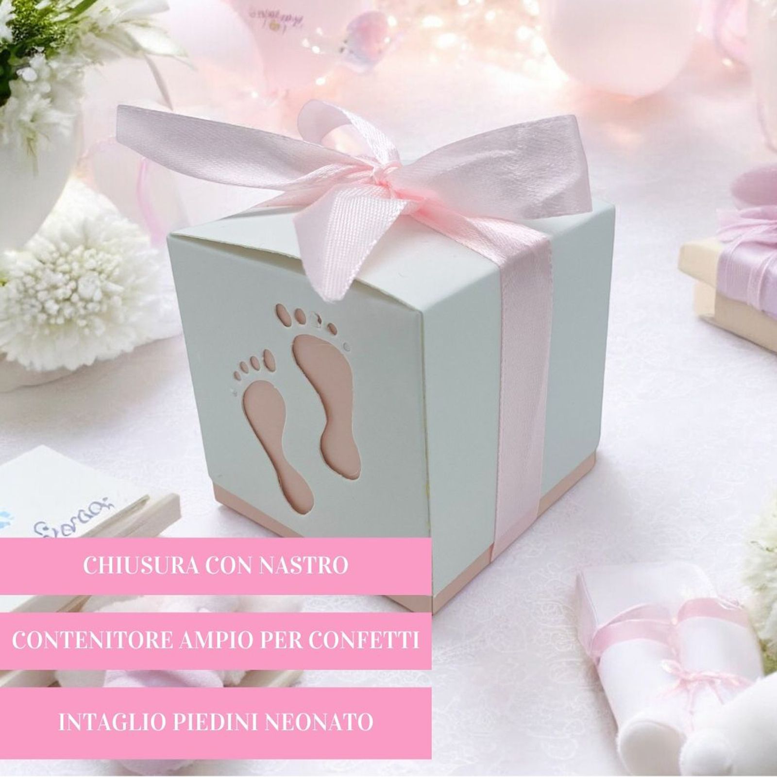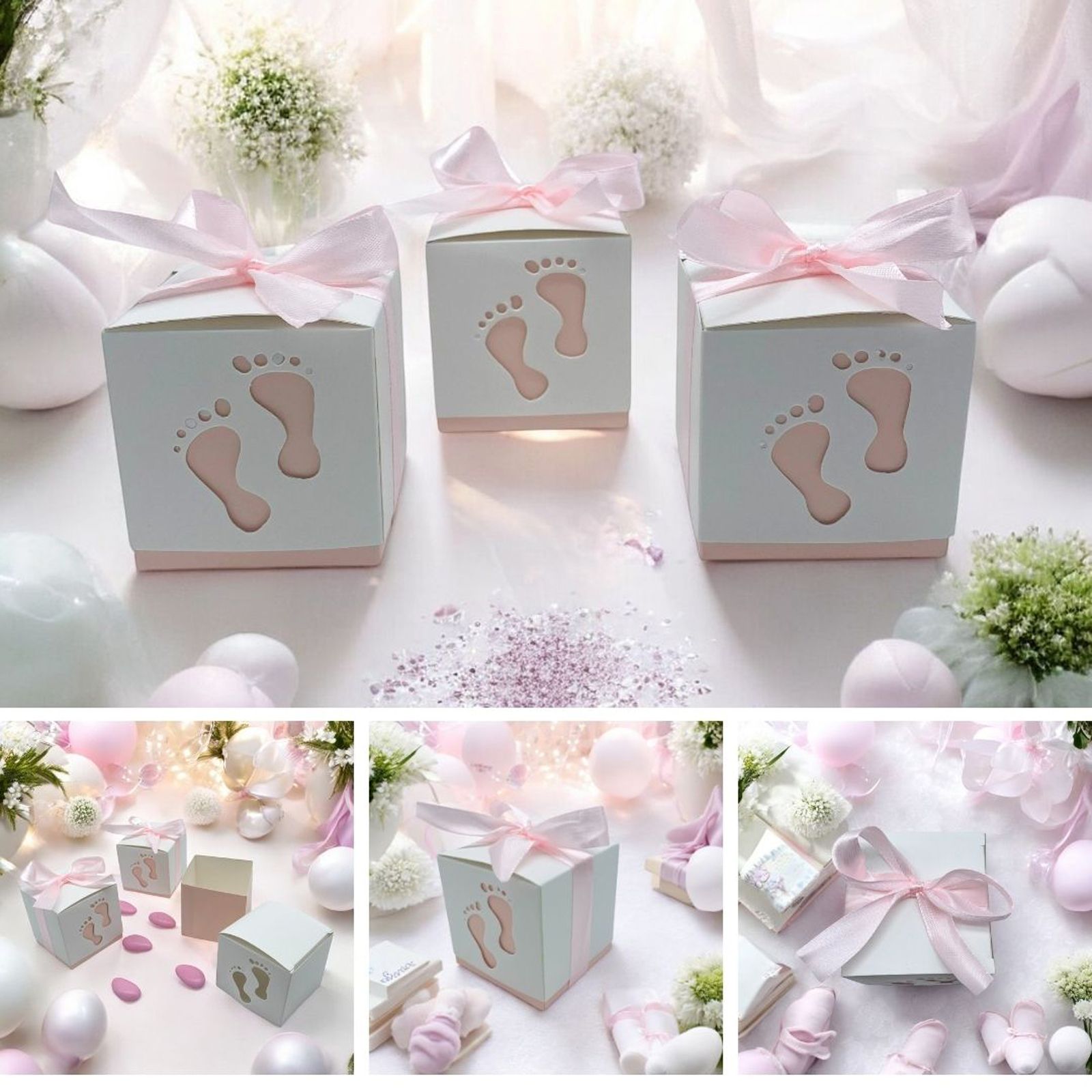 Come queste scatoline per confetti di forma cubica, in doppio colore bianco e rosa con delle tenere impronte di piedini traforate. Le due parti della scatolina sono ad incastro con la parte rosa che si sovrappone a quella bianca.