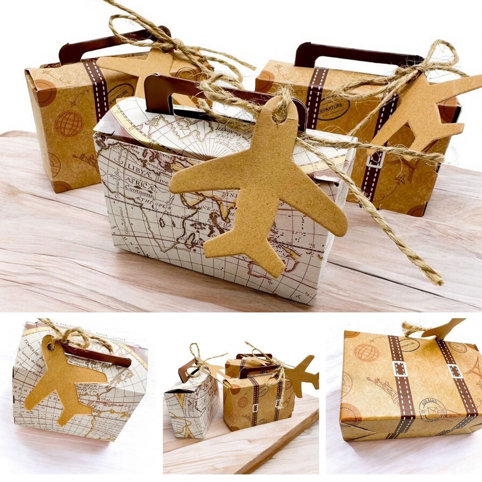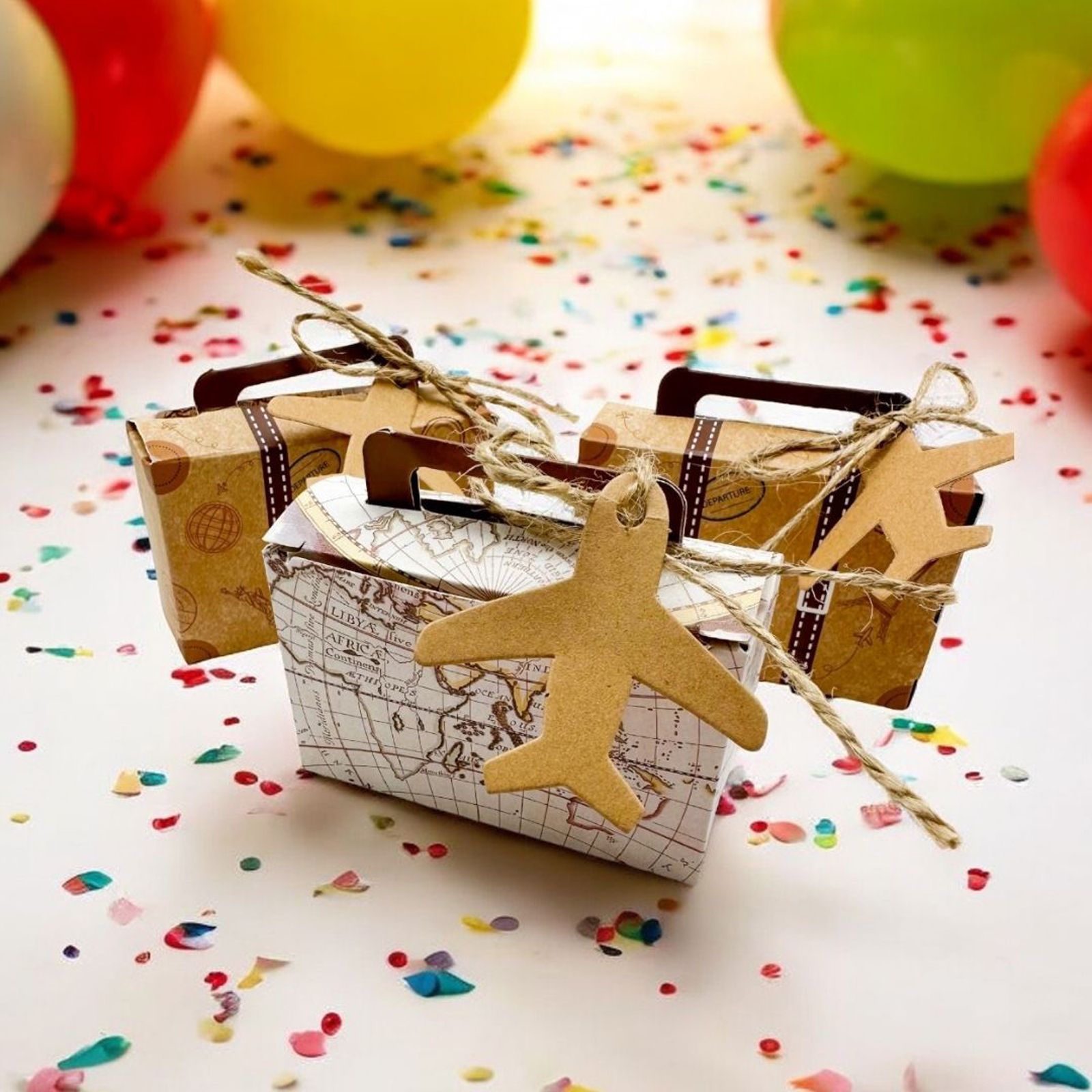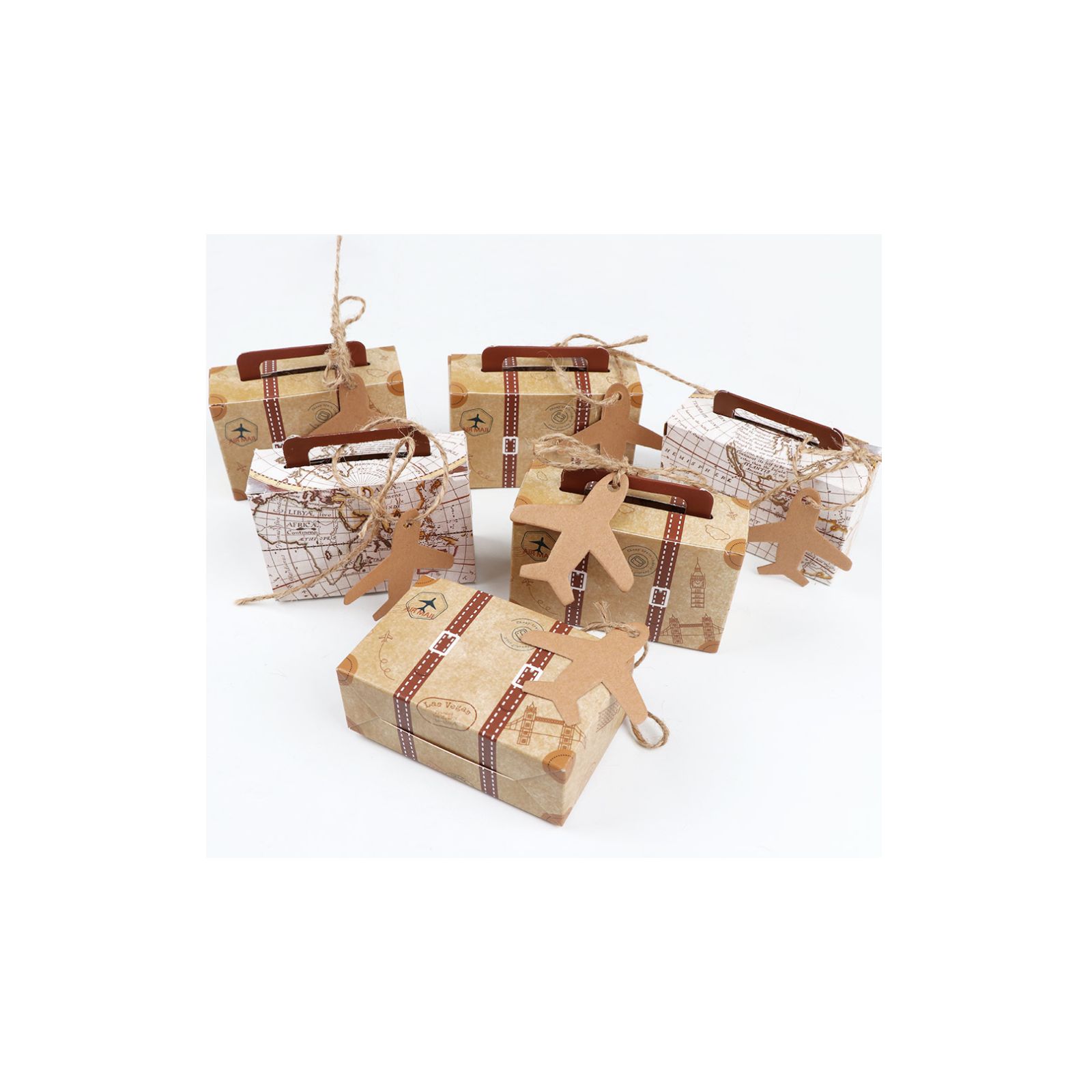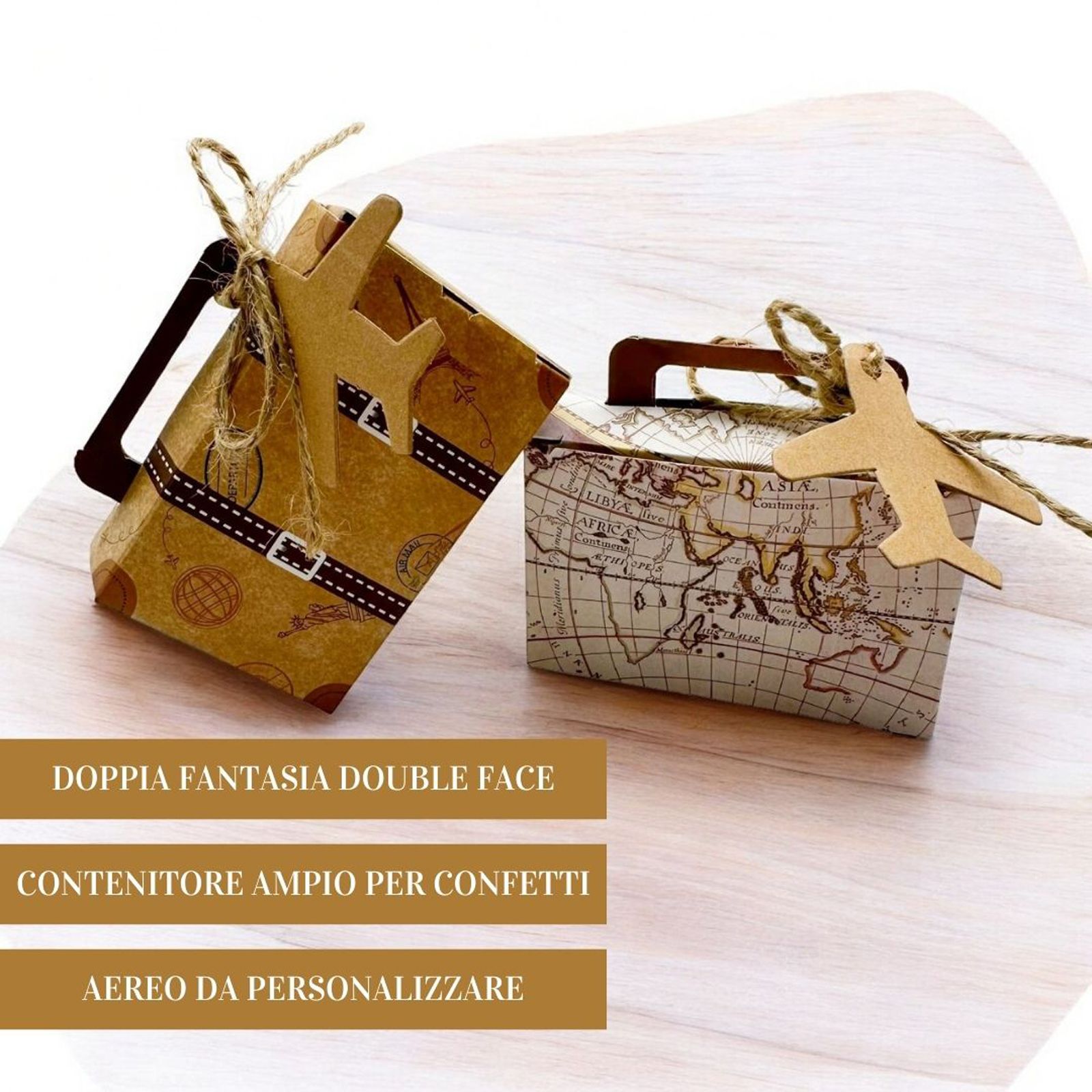 Acquista online sul nostro store queste particolarissime scatoline in cartoncino a forma di valigia, con sfondo a tema viaggio in due varianti assortite (monumenti e mappamondo) ed etichetta in cartoncino avano a forma di aeroplano.