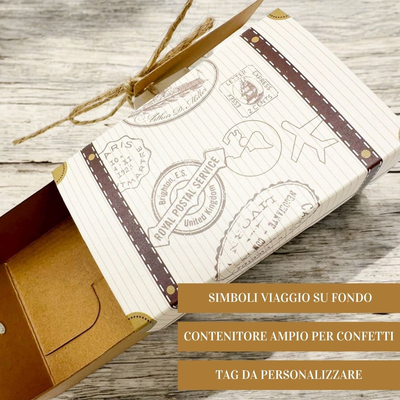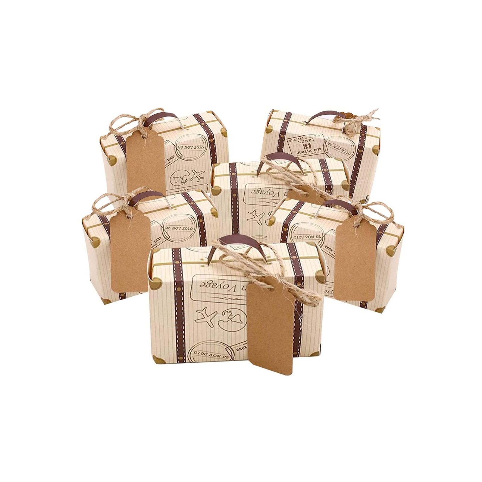 Se il tema del tuo evento è il viaggio, approfitta dei prezzi bassi su queste bellissime scatoline portaconfetti a forma di valigia con sfondo a tema viaggio con spago ed etichetta in cartoncino. Facili da montare e di grande effetto saranno l'ideale per contenere confetti e piccoli oggettini da regalare ai tuoi cari!