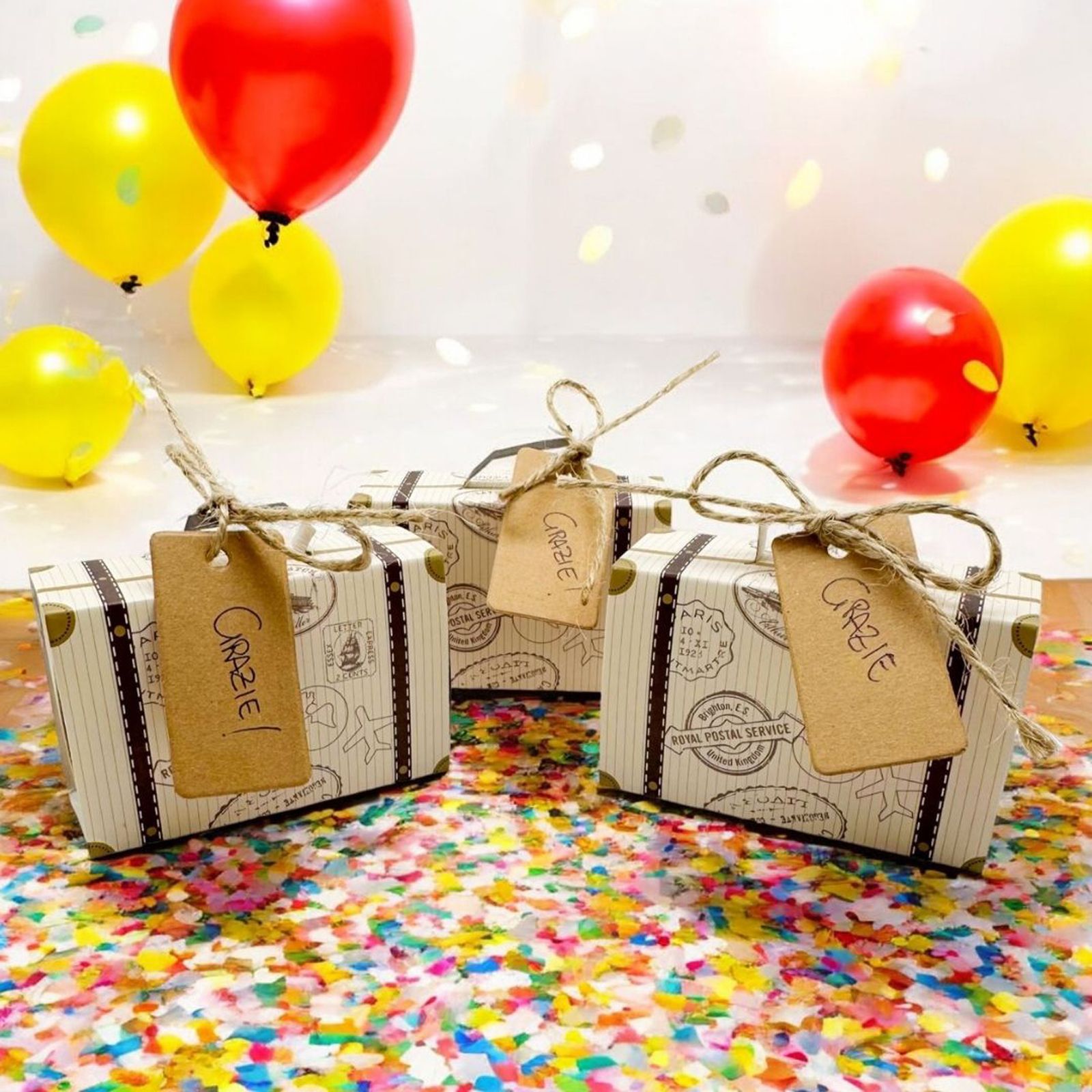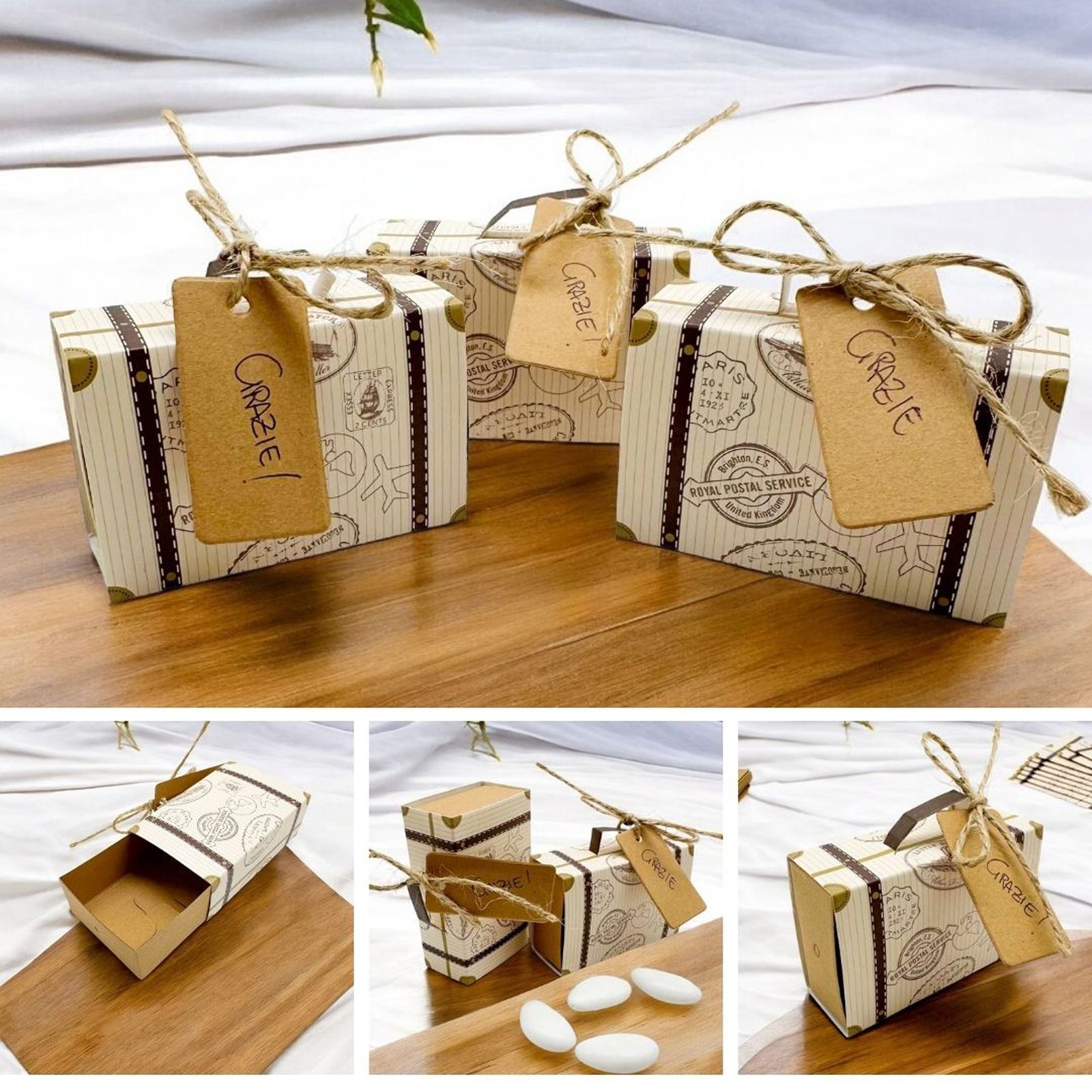 Scegli queste scatoline valigetta per realizzare confettate fai da te tema viaggio, confettate matrimonio economiche, confettate diciottesimo, confettate laurea tema viaggio o usale nei tuoi allestimenti di feste a tema.