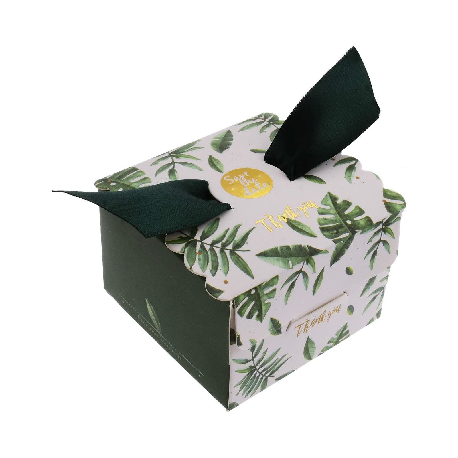Disponibili per te queste bellissime scatoline per confetti in cartoncino, bianche e verde foresta, con un pattern di foglie tropicali e la scritta "Thank you" in una deliziosa tonalità oro.